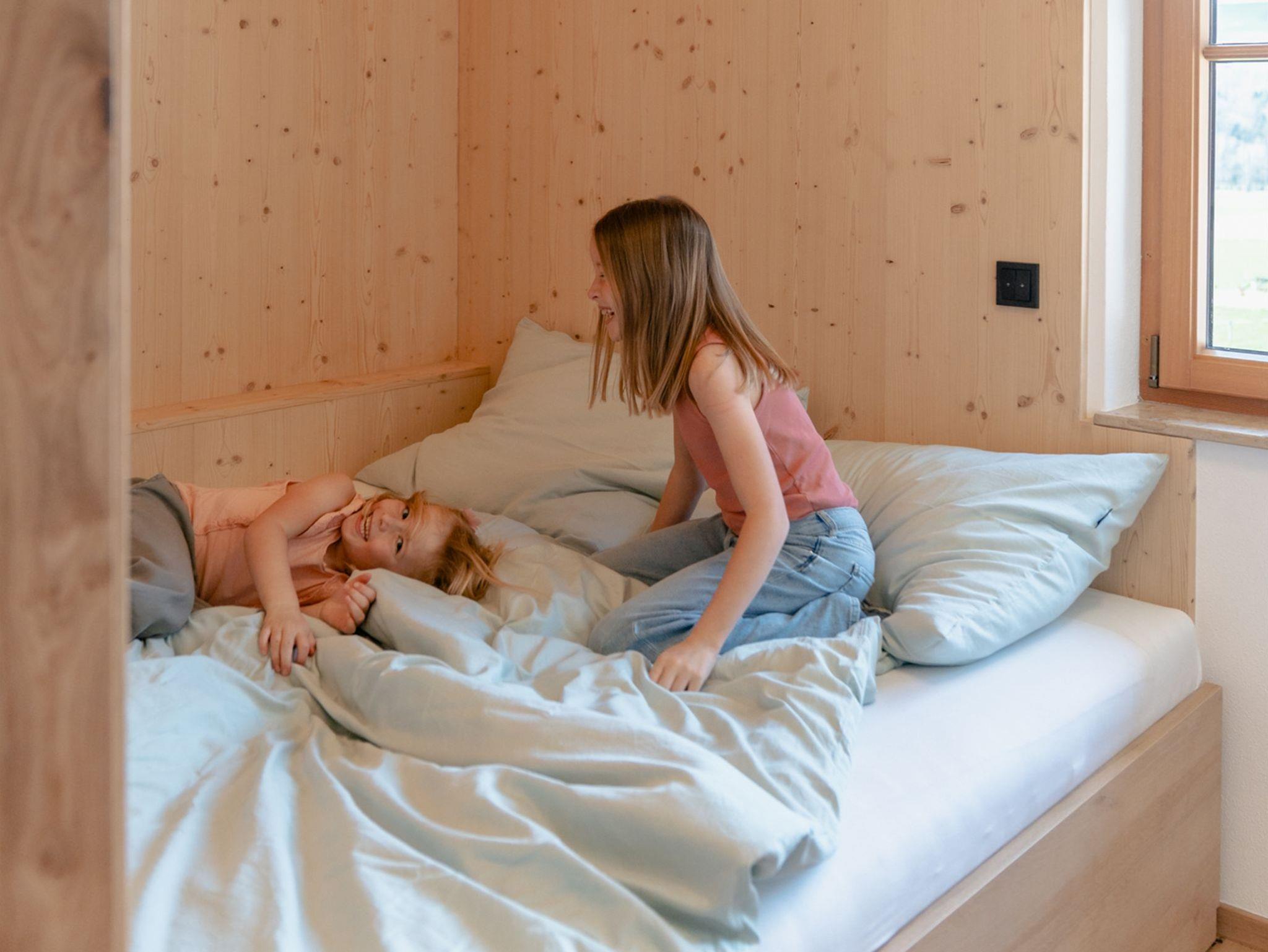 Das zweite Schlafzimmer, ideal als Kinderzimmer genutzt, ist kompakt und clever eingerichtet. Es verfügt über ein Ausziehbett, das in eine edle Fichtenholz-Schlafnische integriert ist. So entsteht eine gemütliche und funktionale Schlafgelegenheit in diesem Raum.