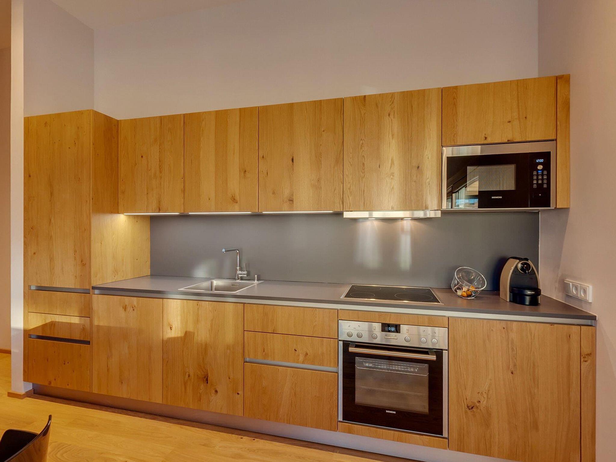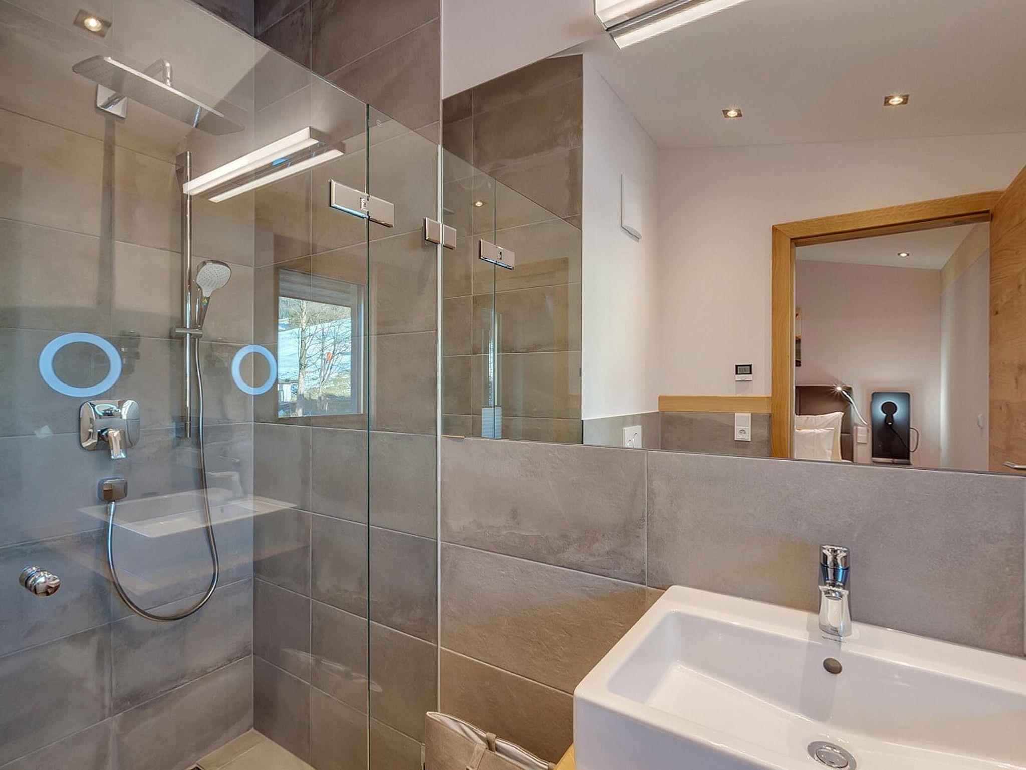 Die Natur Suiten im 1. OG haben 65 qm. Sie bieten 2 Schlafzimmer mit Boxspringbetten und HD-TV, Fliegengitter und Verdunkelung. Die 2 Bäder haben eine Regendusche, WC, Fön und Kosmetikspiegel. Das Wohnzimmer hat ein qualitativ-hochwertiges Schlaf-Sofa und HD-TV, sowie Raffstores. Die Küche ist ausgestattet mit Backofen, Kühlschrank mit Tiefkühlfach, Geschirrspüler, Mikrowelle, Nespresso Kaffeemaschine. Die Balkon-Terrasse mit Lounge Möbel hat einen wunderschönem Blick auf den Wilden Kaiser.