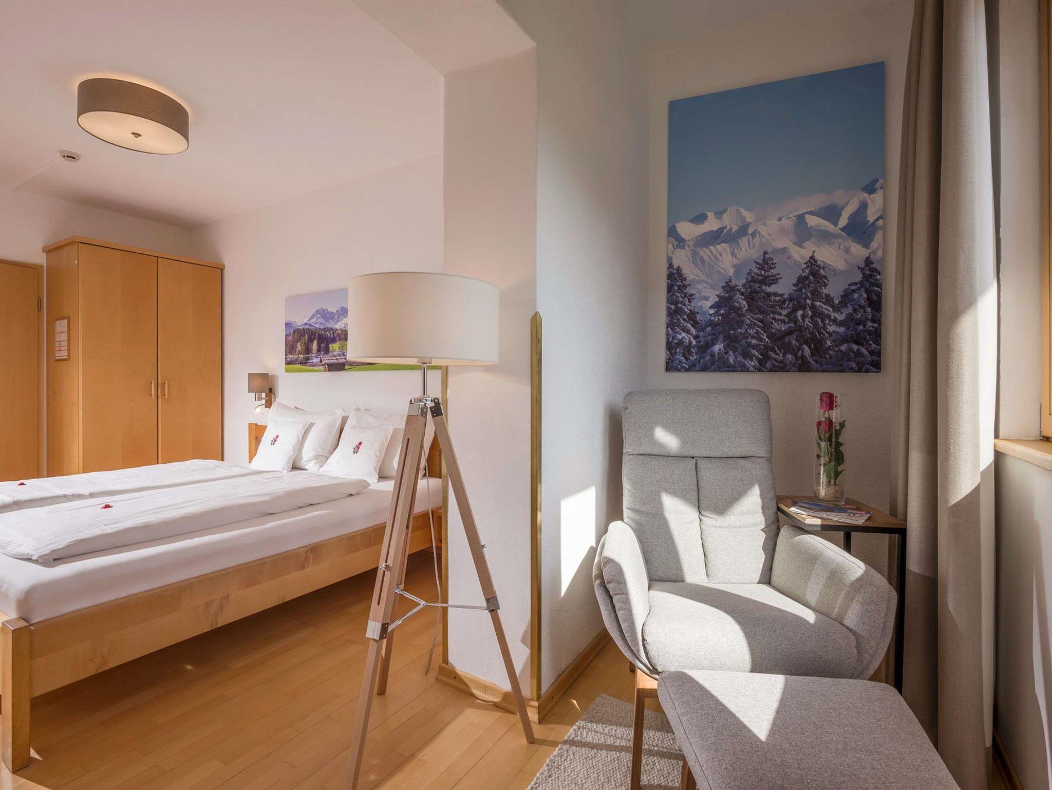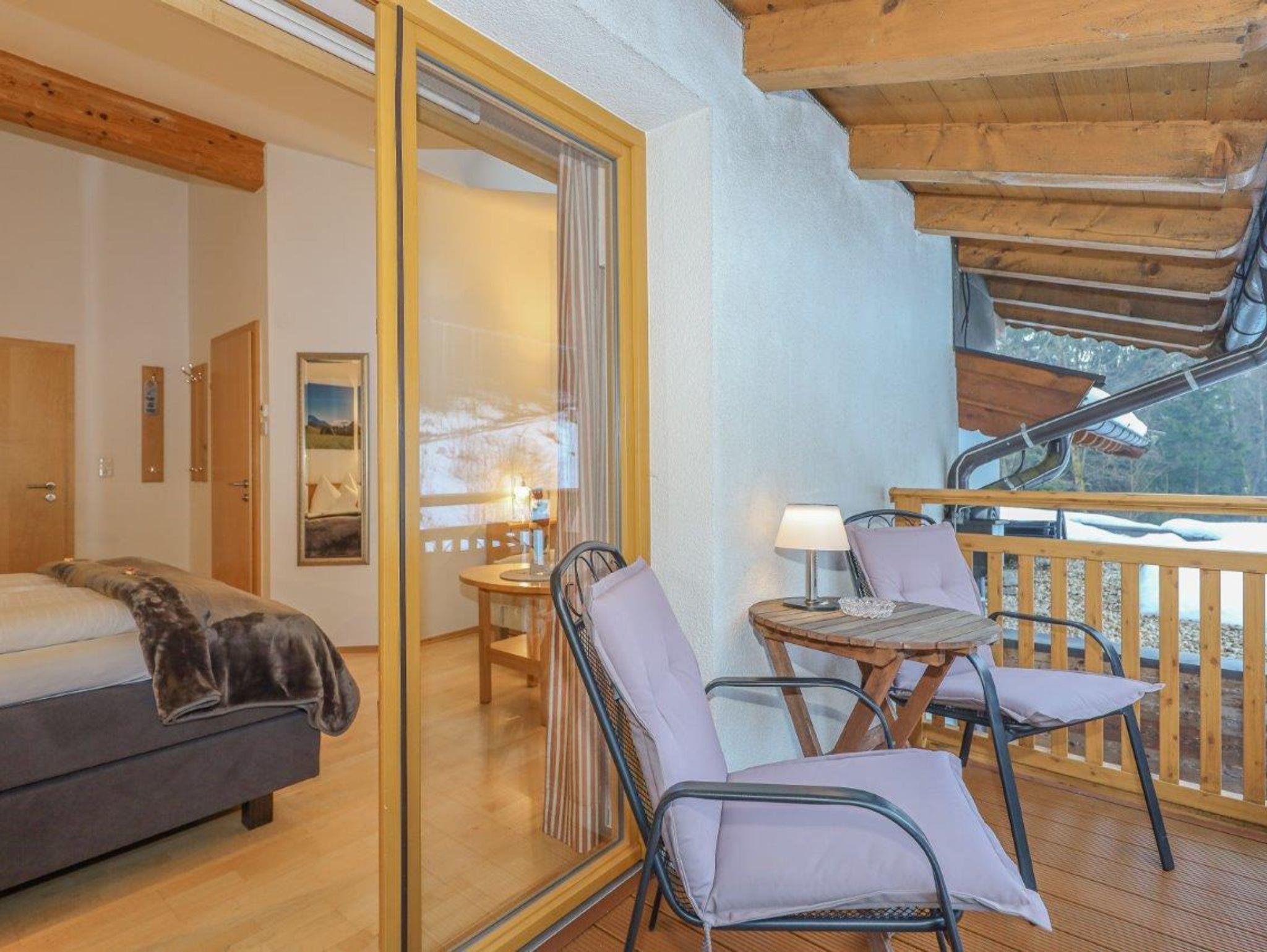 • Zimmer mit Loggia haben eine gemütliche Sitzecke mit herrlichem Bergblick, Zimmer Waldseite haben einen Balkon