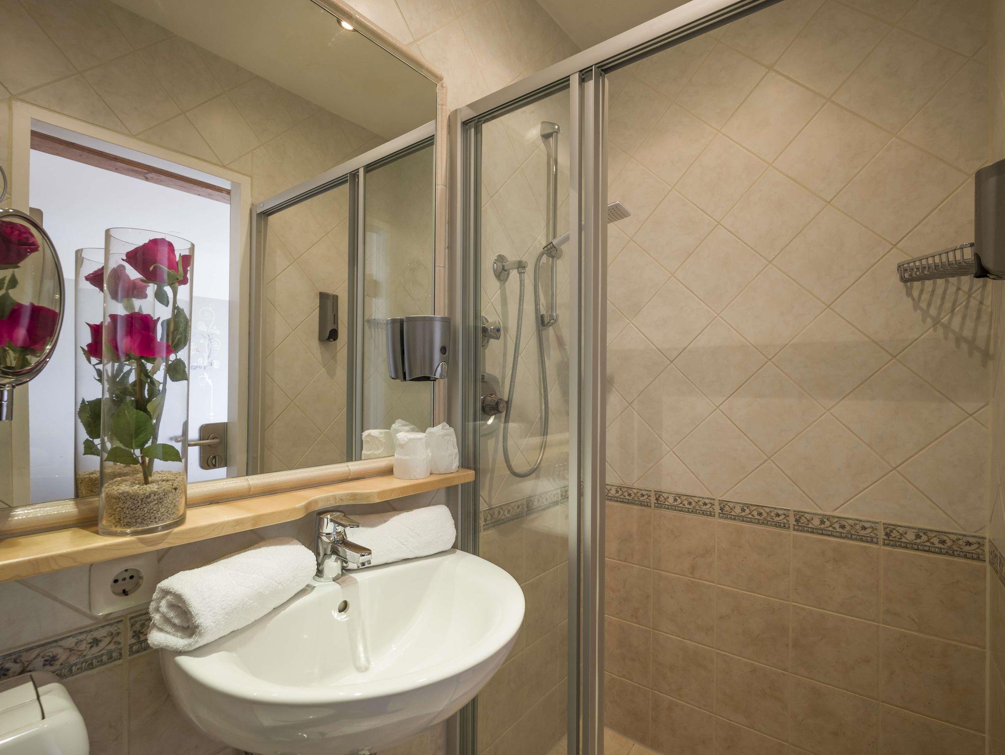• Zimmer mit Loggia (verglast) : kleines Bad, Zimmer Waldseite größeres Bad, alle mit Du/WC, Haartrockner, Handtücher