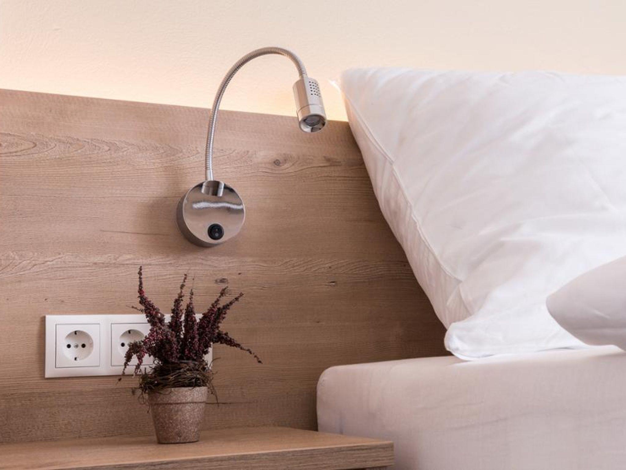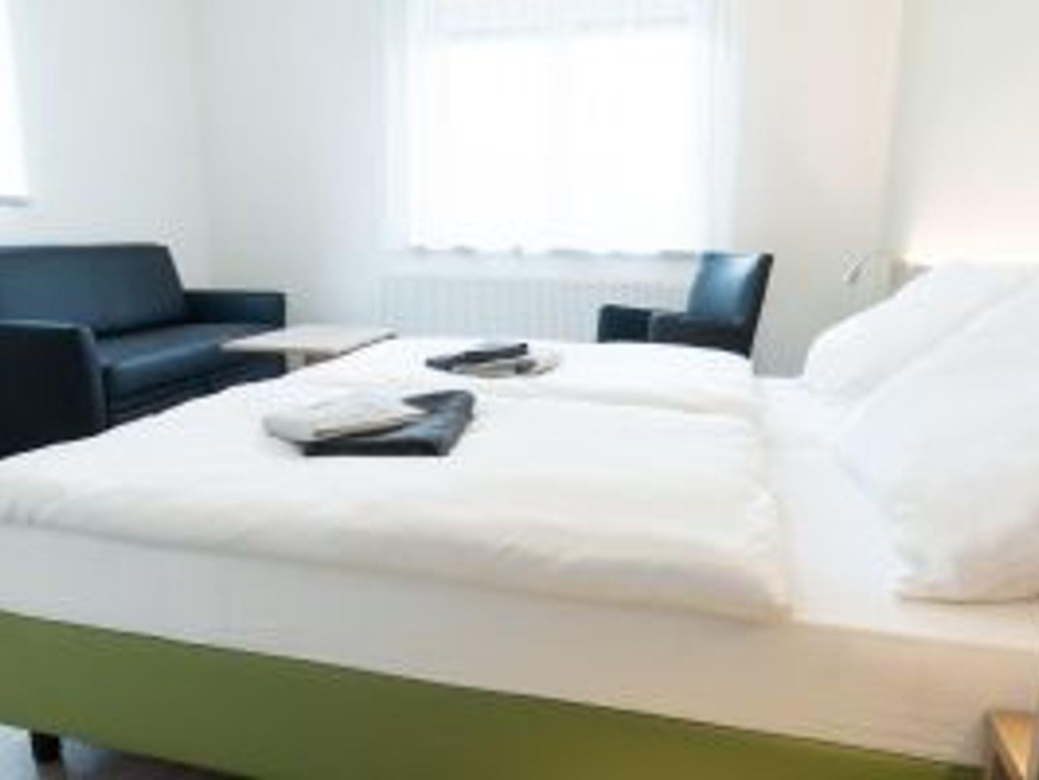 Unser komfortables Familienzimmer besteht aus einem Doppelbett und einem ausziehbaren Sofa, auf dem bequem zwei weitere Personen übernachten können.