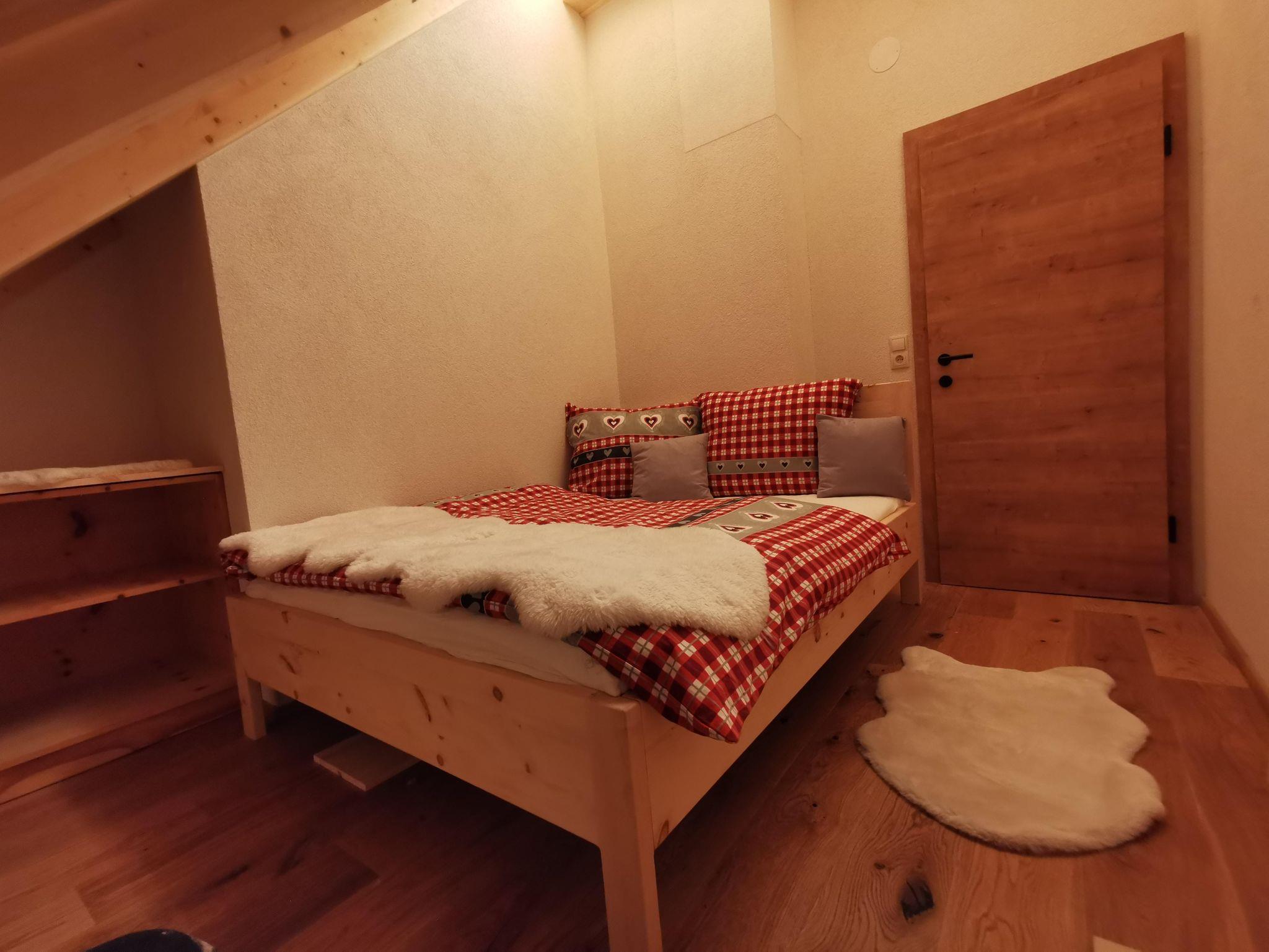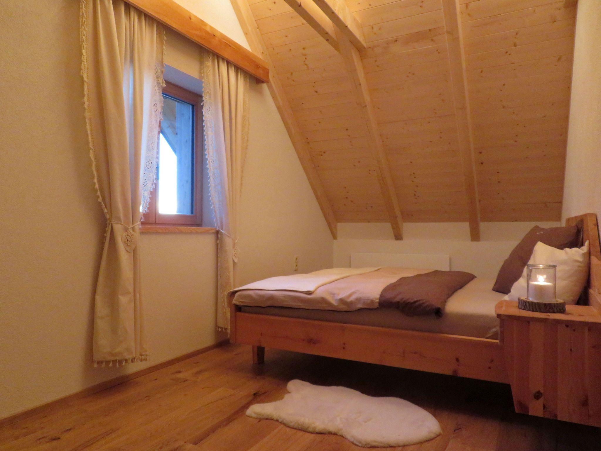 Das Almhaus verfügt über 2 Schlafzimmer im Obergeschoß. Die Schlafräume sind mit Massivholzbetten aus heimischen Zirbenholz ausgestattet. Die duftenden ätherischen Öle des Holzes wirken beruhigend und versprechen einen tiefen, erholsamen Schlaf.