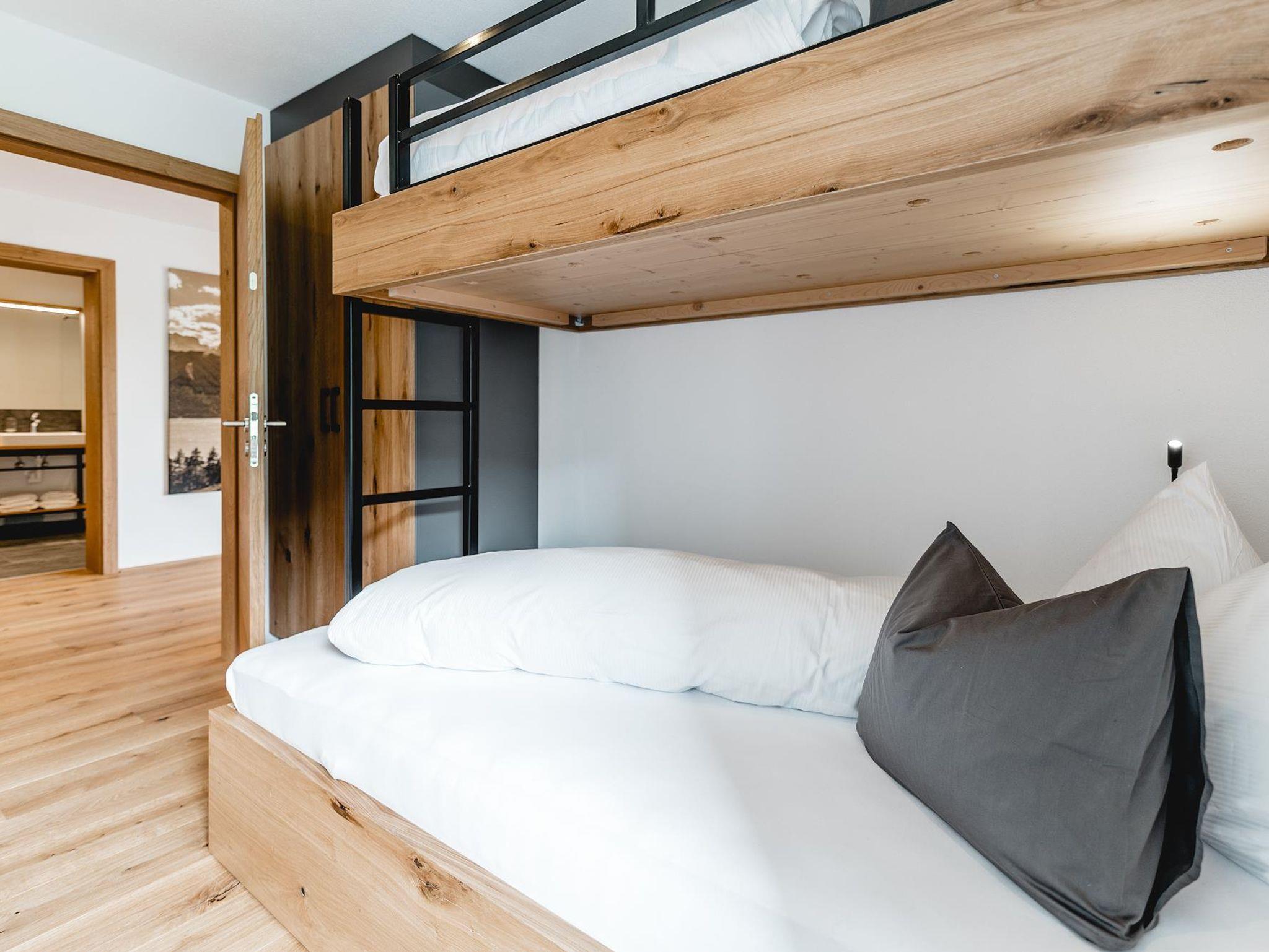 Cabin Typ Bärenkopf ist für zwei bis vier Personen geeignet. Das 55m² große Appartement bietet zwei getrennte Schlafzimmer, davon ist eines mit einem Designer-Etagenbett eingerichtet. Bad und WC sind separat. Es gibt eine Terrasse oder Balkon.