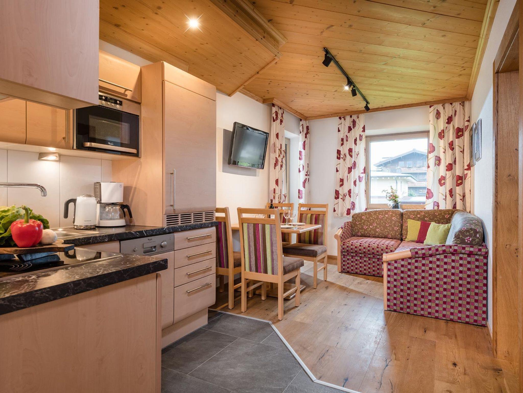 • gemütliche Wohnküche mit Wohn- und Essecke, komplett ausgestattete Küche mit 4-Platten-Cerankochfeld, Mikrowelle, Backofen, Kühlschrank mit Gefrierfach, Filterkaffeemaschine (auf Wunsch Nespresso verfügbar), Toaster, Wasserkocher, Geschirr, Besteck und Kochutensilien