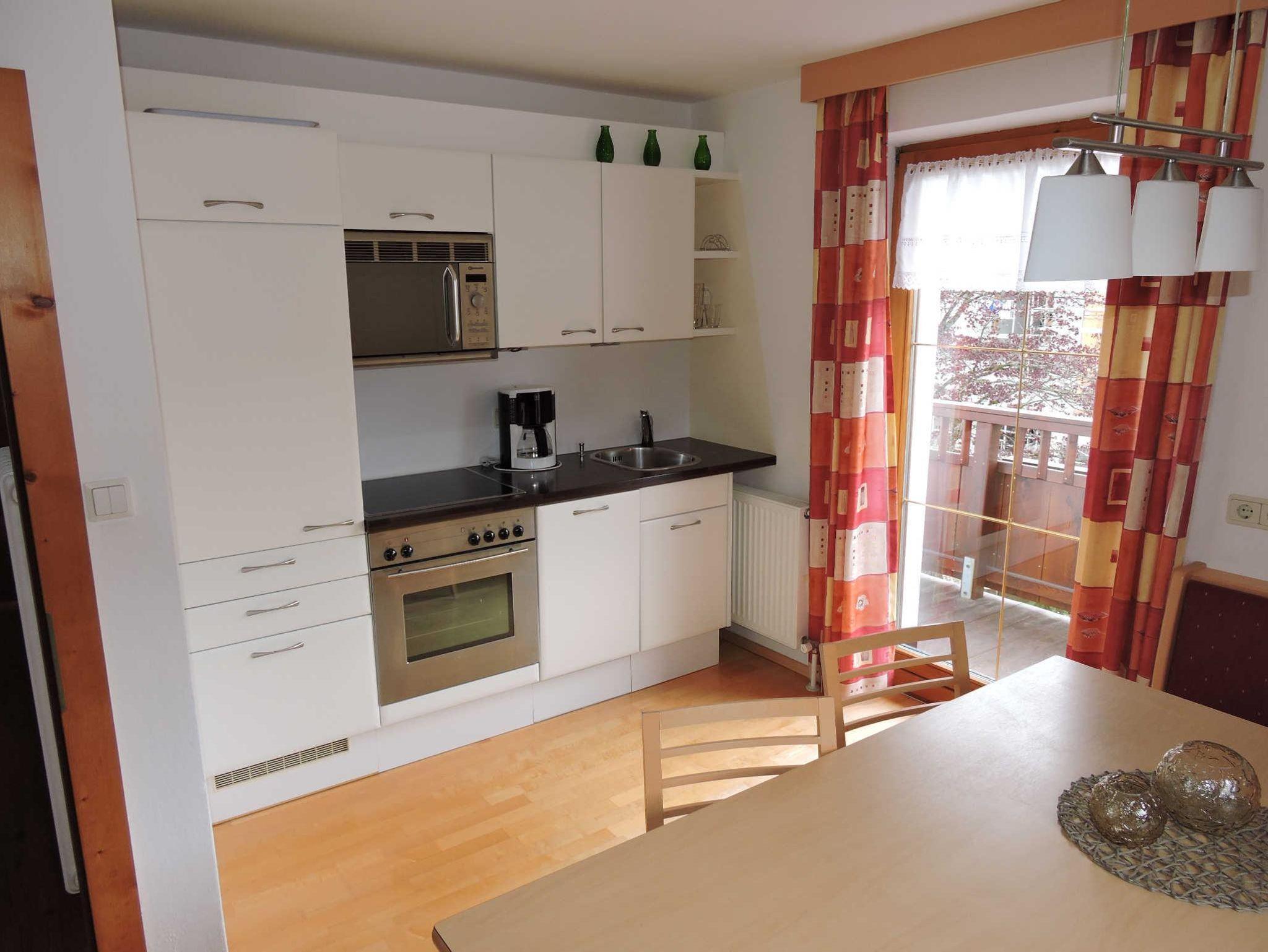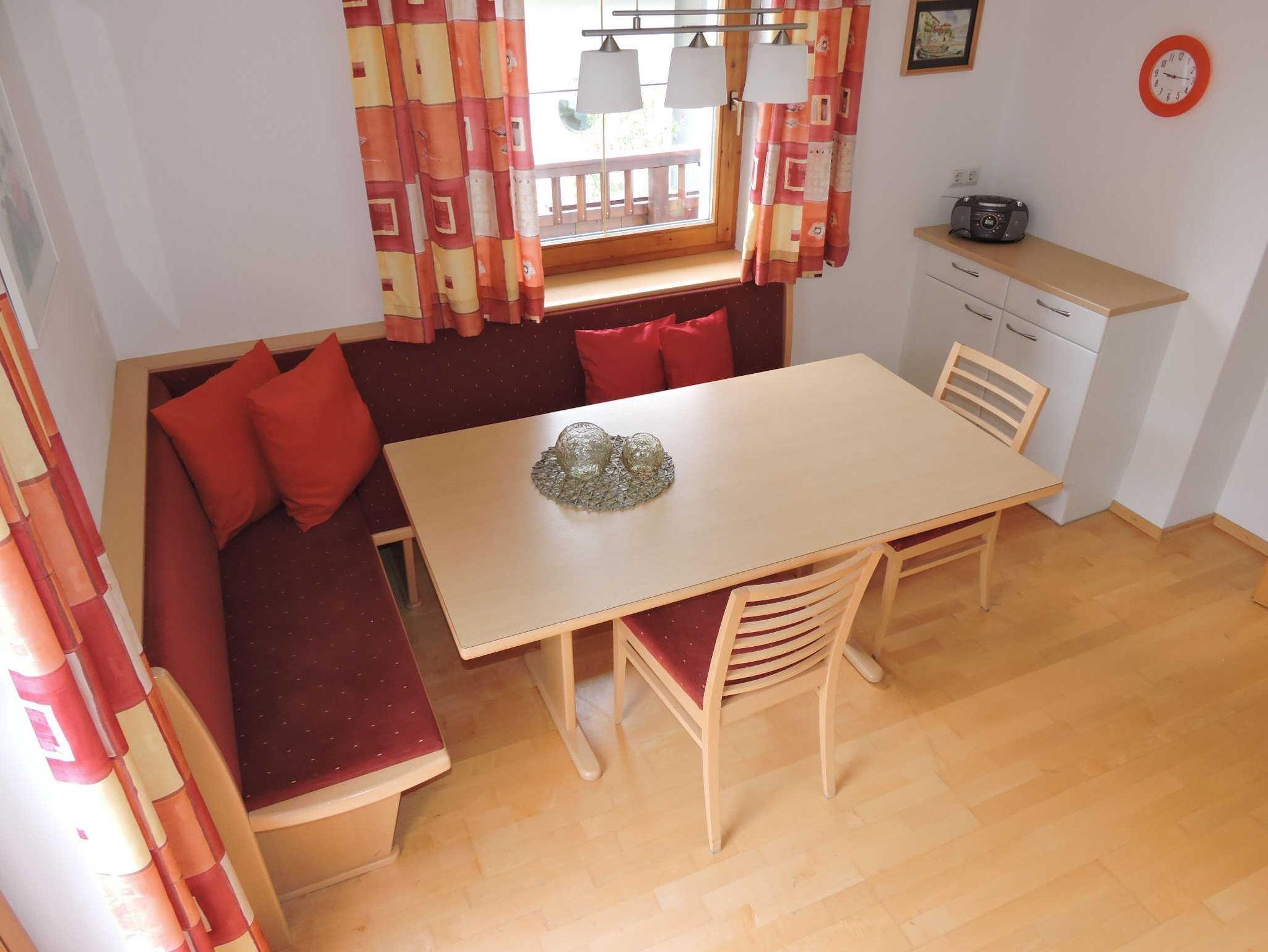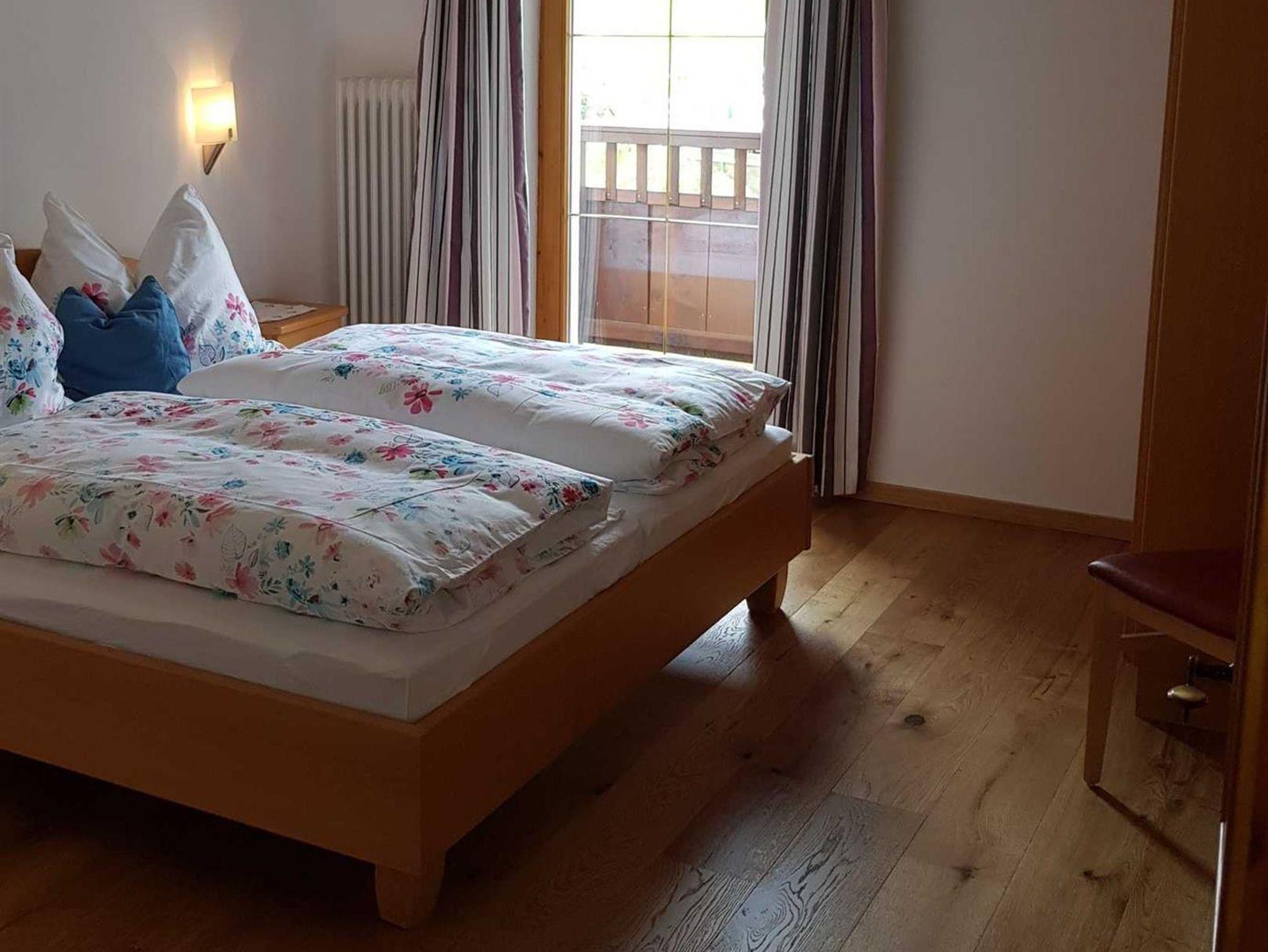 Komfortables Ferienappartement im ersten Stock mit ca. 75m² und Ost-Süd-, Westbalkon. Komplett eingerichtete Küche mit Backrohr, Mikrowelle, Wasser- und Eierkocher, Kaffeemaschine, Toaster und moderner Sitzecke. Das große Wohnzimmer hat eine gemütliche Couchecke, eine kleine Bibliothek und natürlich Sat-TV. Das großzügige Badezimmer ist mit Badewanne und Dusche sowie Radio ausgestattet. Ein separates WC sowie 2 Schlafzimmer, ausgestattet im Tiroler Landhausstil, vervollständigen unsere Ferienwohnung.