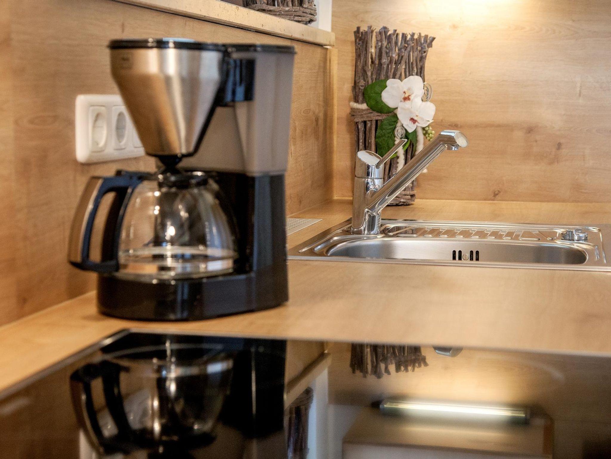 • Komplett ausgestattete Küche m. Ceranfeld, Backrohr, Kühlschrank m. kl. Gefrierfach, Geschirrspüler, Mikrowelle, Toaster