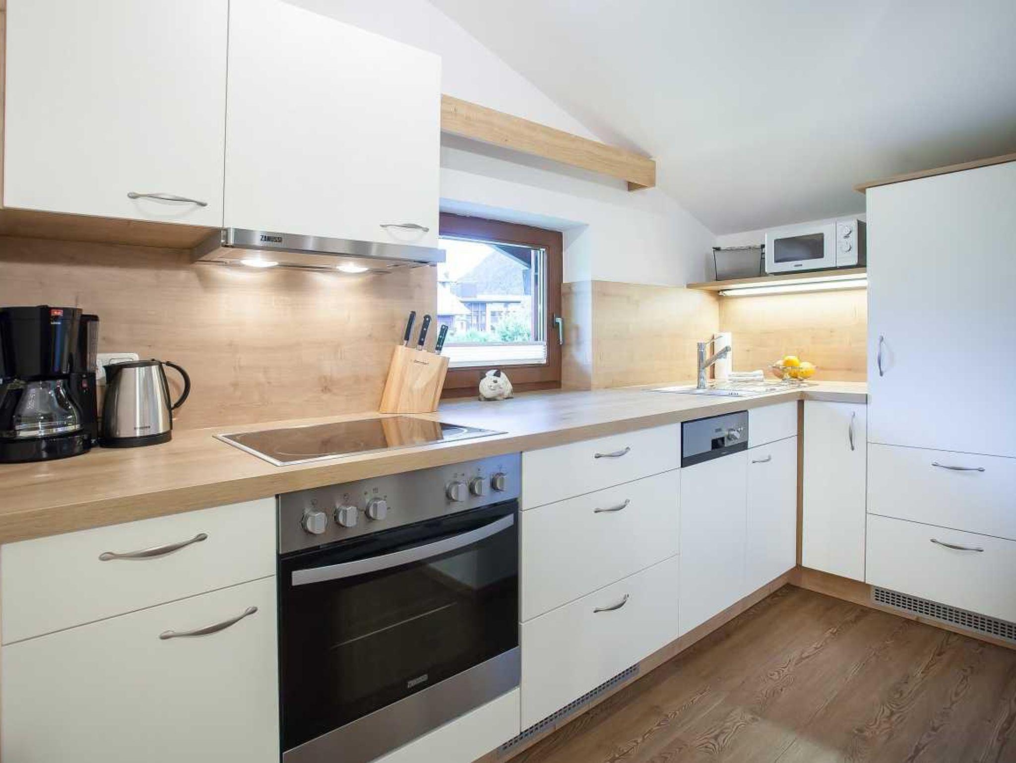 • Komplett ausgestattete Küche m. Ceranfeld, Backrohr, Kühlschrank m. kl. Gefrierfach, Geschirrspüler, Mikrowelle, Toaster
