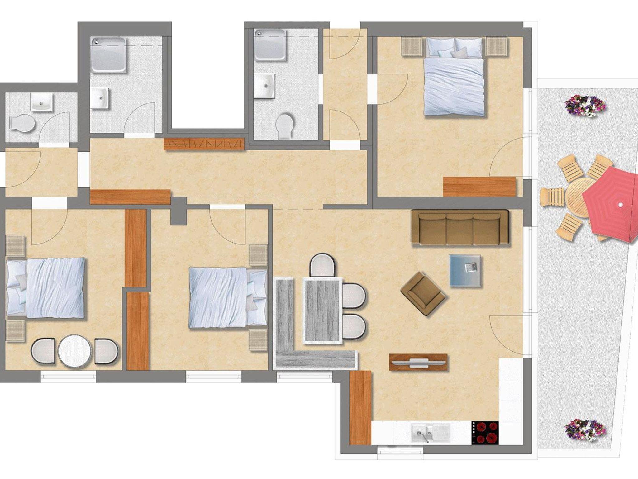 Die Ferienwohnung Alpenmohn, großzügig geplant, bietet einen Panoramablick. Sie ist ausgestattet mit drei Schlafzimmer, einem hellen Wohnraum, eine voll ausgestattete Küchenzeile, zwei Badezimmer mit Dusche, einem separaten WC und einem Vorraum. Von der Terrasse Ihrer Ferienwohnung haben Sie den herrlichen Blick auf das Rofangebirge.