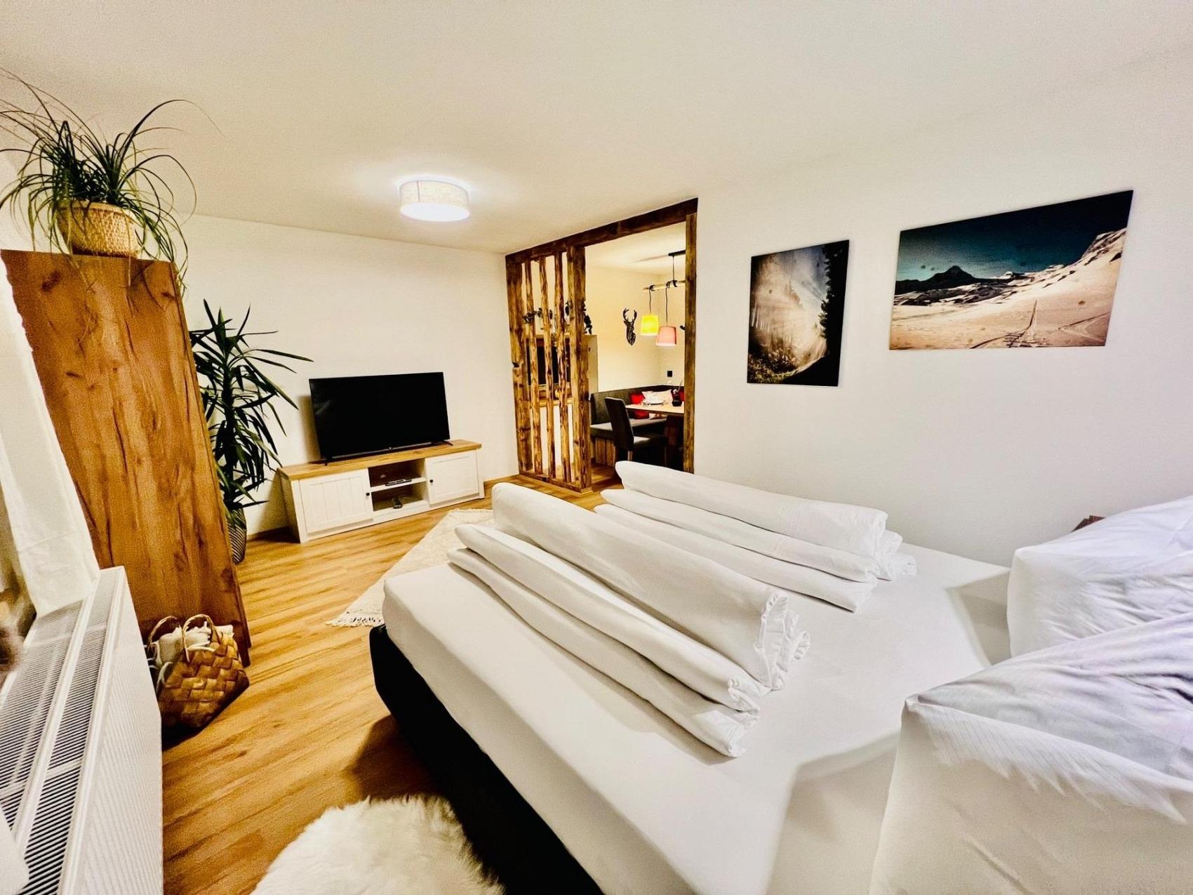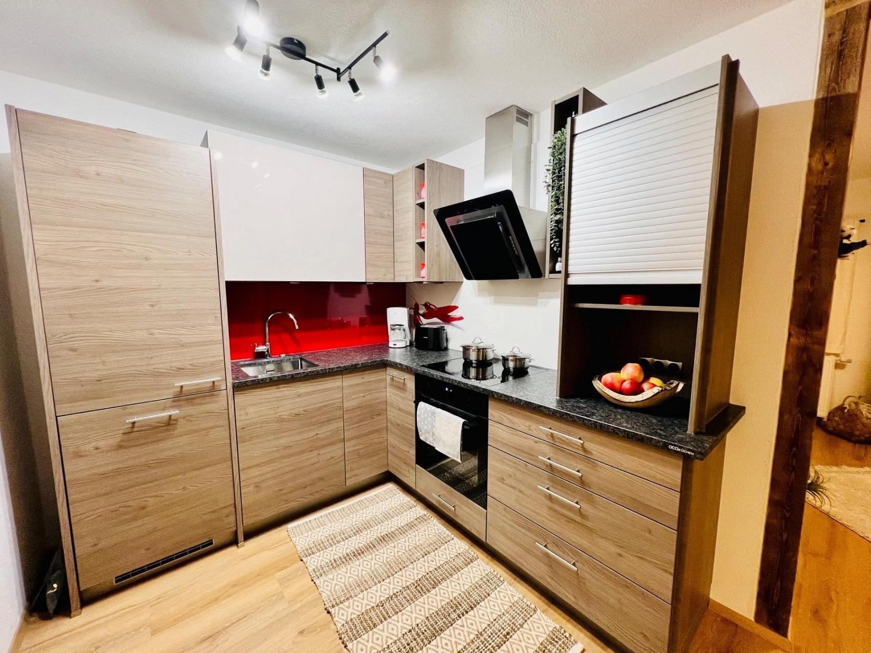 Grander Wasserbelebungsanlage, Sehr gut ausgestattete Küche, Geschirrspüler, Tabs für den Geschirrspüler, Backpapier, Spülmittel, Geschirrtücher, Kaffeefilter, Kaffeemaschine, verschiedene Tees, Putzzeug, Bettwäsche, Handtücher und Badetücher, Smart TV, gratis W-LAN, gratis Parkplätze, Ski/Board Abstellraum, Hochleistungs- Schuhtrockner, Trockenraum für Schuhe und Kleidung, Brötchen-Service, Milch-Service.