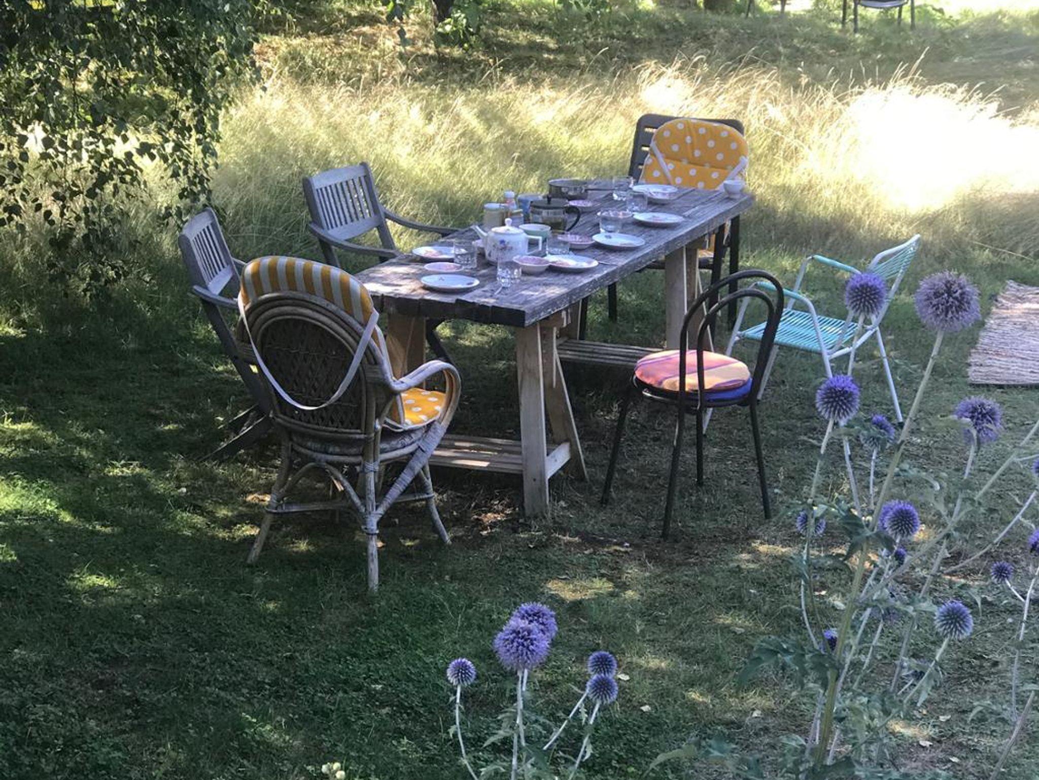 Wie auch die anderen Zimmer hat das „Zimmer Mitte“ Zugang zur „Bar“ im Erdgeschoss – dem Küchen- und Aufenthaltsbereich. Ausgestattet mit zwei Herdplatten, Mini-Backofen, einem Kühlschrank, Geschirrspüler und Waschbecken, ist alles für eine entspannte Selbstverpflegung vorhanden. Von dort aus gelangt man über den angrenzenden Seminarraum direkt auf die Terrasse mit Blick in den Garten.