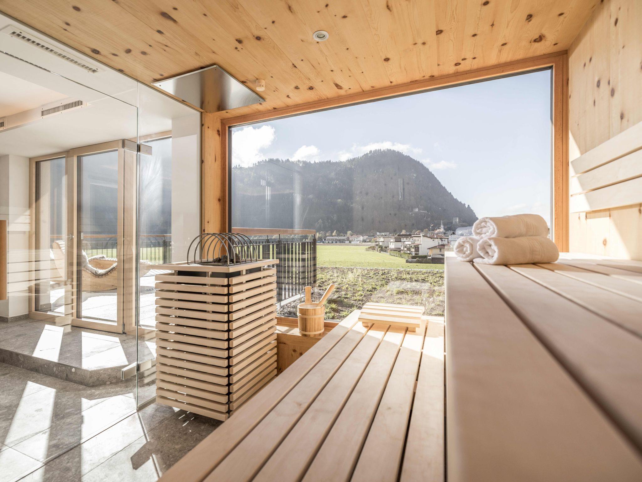 Neben den modern eingerichteten Appartements befindet sich im 3. Obergeschoss ein Wellnessbereich mit Panoramasauna und einem besonderen Blick auf den Schlossberg sowie die Glasstadt Rattenberg und das Inntal. Auf unserer Dachterrasse können Sie ebenfalls nach einem Saunagang oder einem Wander- / Skitag die umliegende Tiroler Bergwelt in vollen Zügen genießen. Für unsere aktiven Gäste bieten wir einen modern eingerichteten Fitnessraum an. Ein eigener Waschraum mit Waschmaschine und Wäschetrockner steht unseren Gästen sehr gerne jederzeit zur Verfügung.