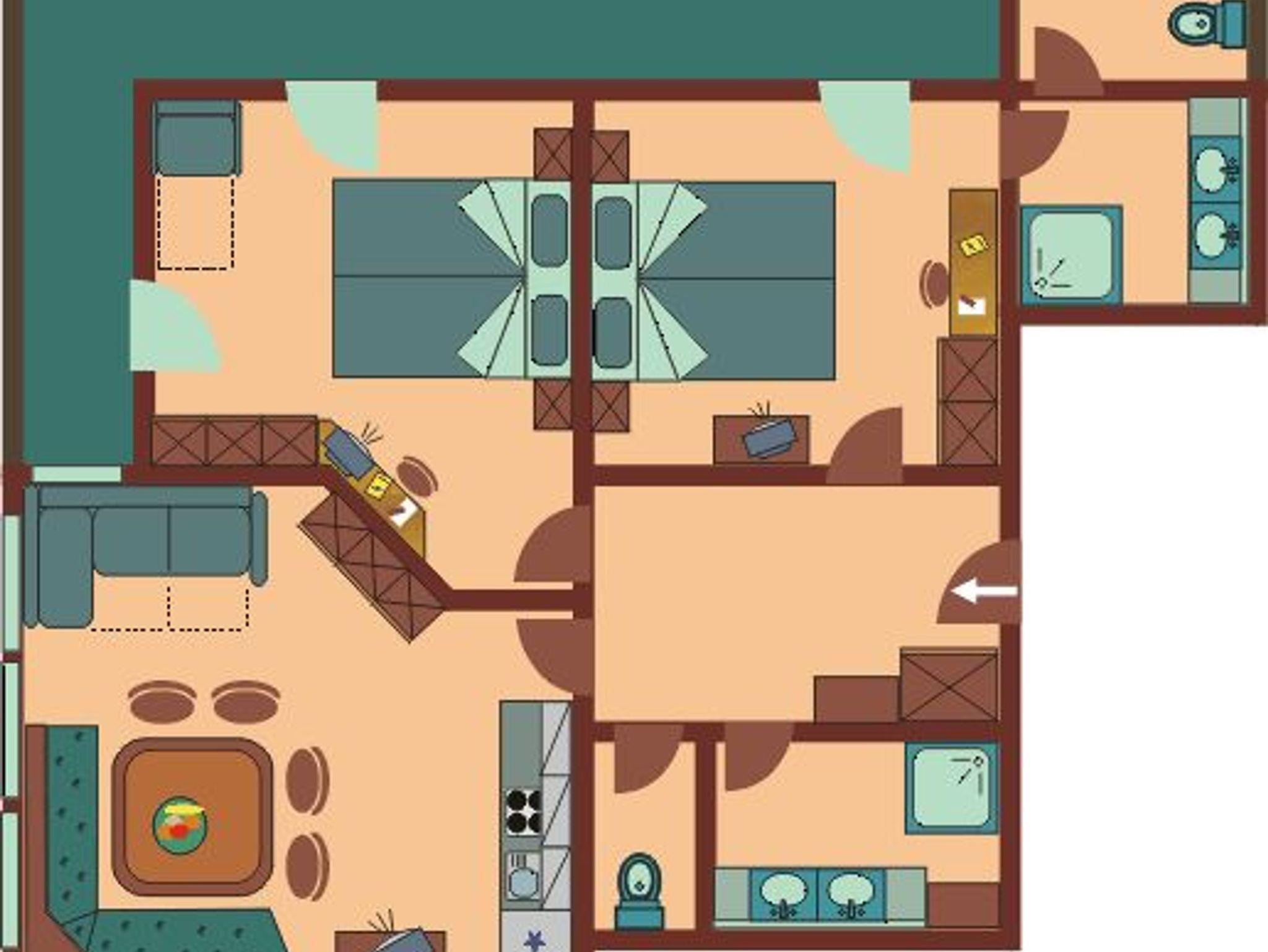 Family Suite Deluxe, ca. 80 m² für 4-6 Personen: 2 Schlafzimmer, großes Wohnzimmer mit Doppelausziehcouch, modernst ausgestattete Küche mit Mikrowelle, Geschirrspüler, 2 Badezimmer und WC (getrennt), Fön, Kosmetikspiegel, Handtuchtrockner, Kabel-TV, Telefon mit Internetanschluß, Schreibtisch, Radio, Safe und Balkon.