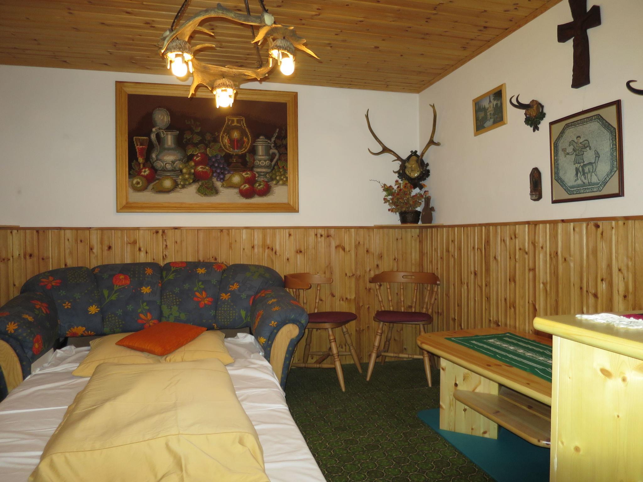 "Walcher", 6-room house 120 m2 on 2 levels. Rustic and wooden furniture furnishings: living/dining room, on 2 levels with dining table, dining nook, satellite TV, hi-fi system and tiled stove. Exit to the terrace. 1 room with 1 double bed and shower/WC. 1 room with 1 double bed and bath/shower/WC. Alcove with 1 double sofabed. Exit to the terrace. Kitchen (oven, dishwasher, 4 ceramic glass hob hotplates, toaster, microwave, electric coffee machine). Sep. WC. On the lower ground floor: 1 room with 1 french bed (160 cm), hand-basin. 1 room with 1 double bed. Shower/WC. Oil heating. Wooden floors. Terrace roofed. Terrace furniture, barbecue (portable), deck chairs (4). Panoramic view of the mountains, the forest and Planai. Facilities: washing machine, iron, children's high chair, baby cot. Internet (WiFi, free). Please note: one double bedroom is outside the apartment. Non-smoking house. Maximum 2 pets/ dogs allowed. Smoke alarm. Instead of an enclosed bedroom, some sleeping areas are located in an open-plan area (gallery, alcove, etc.).