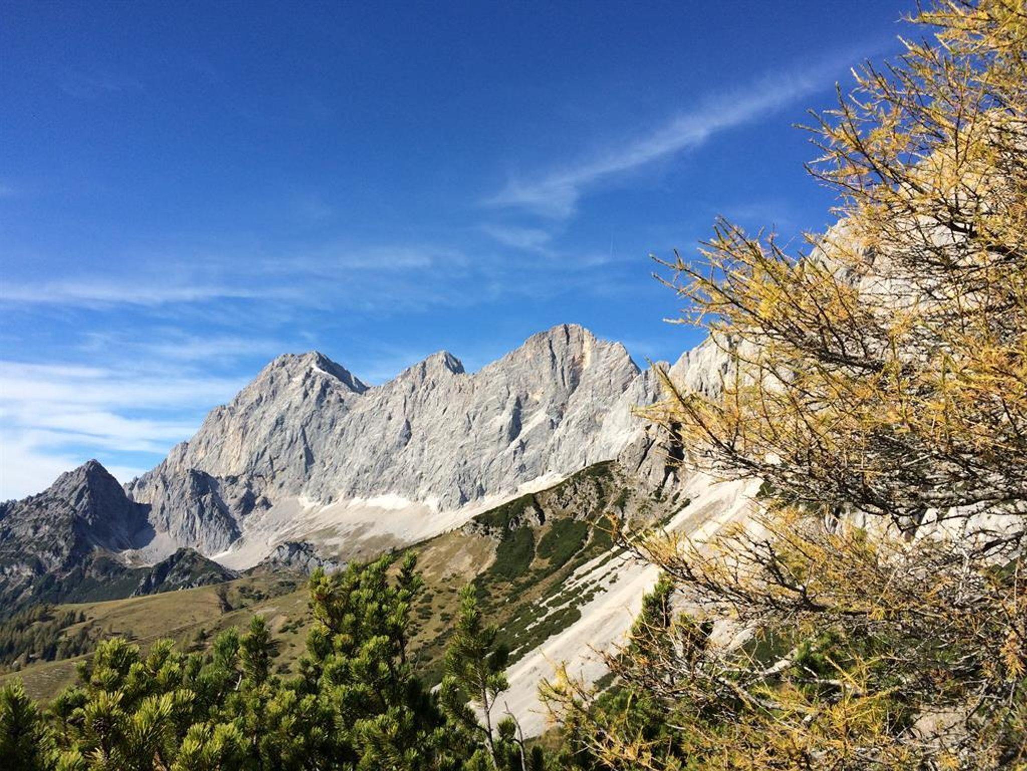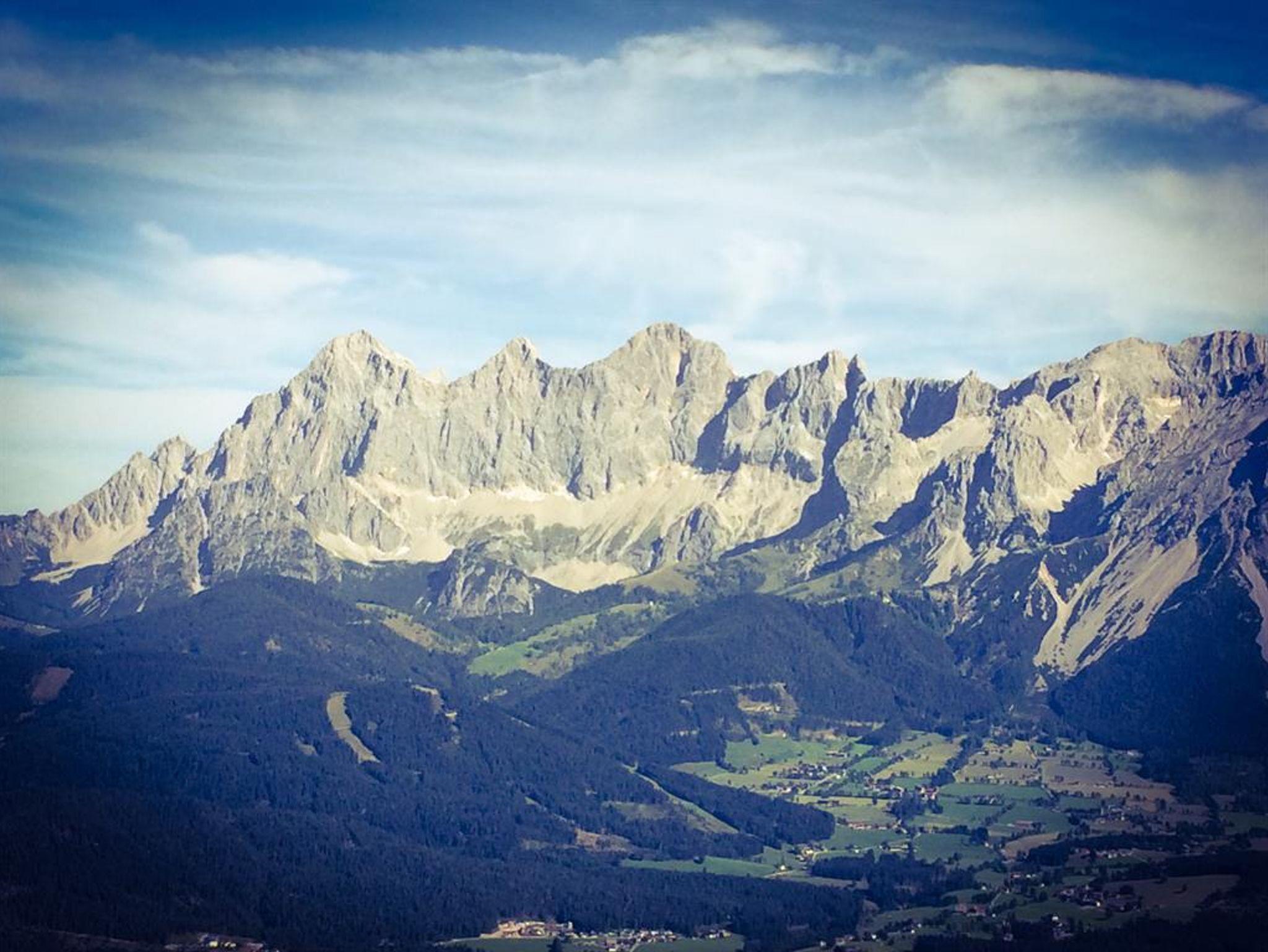 Ruhige Doppelzimmer mit herrlichem Blick zum Dachsteinmassiv mit Dusche und WC. TV und Balkon. Kühlschrank finden Sie am Gang. Großer Kinderspielplatz, Liegewiese und gratis W-Lan.