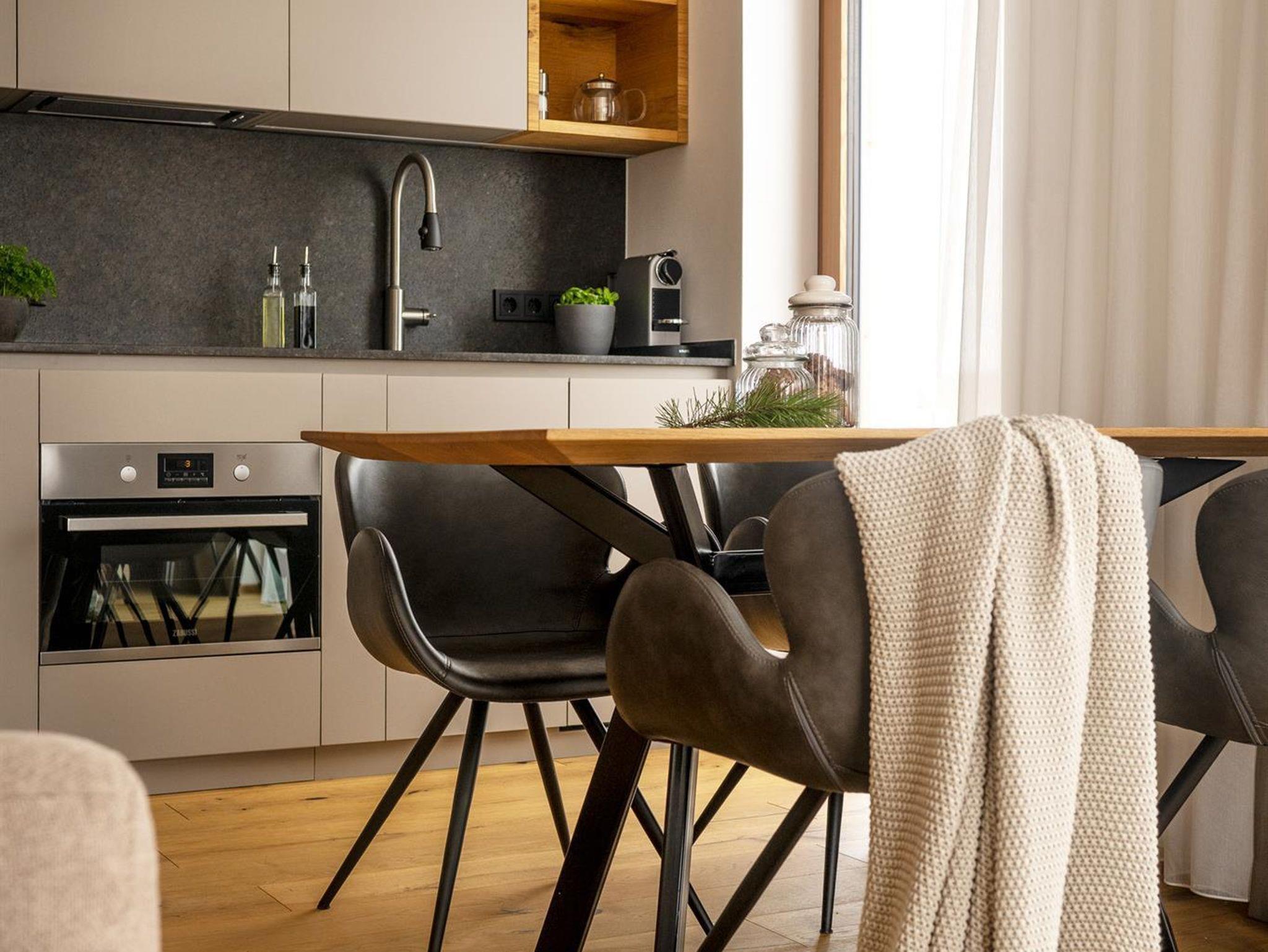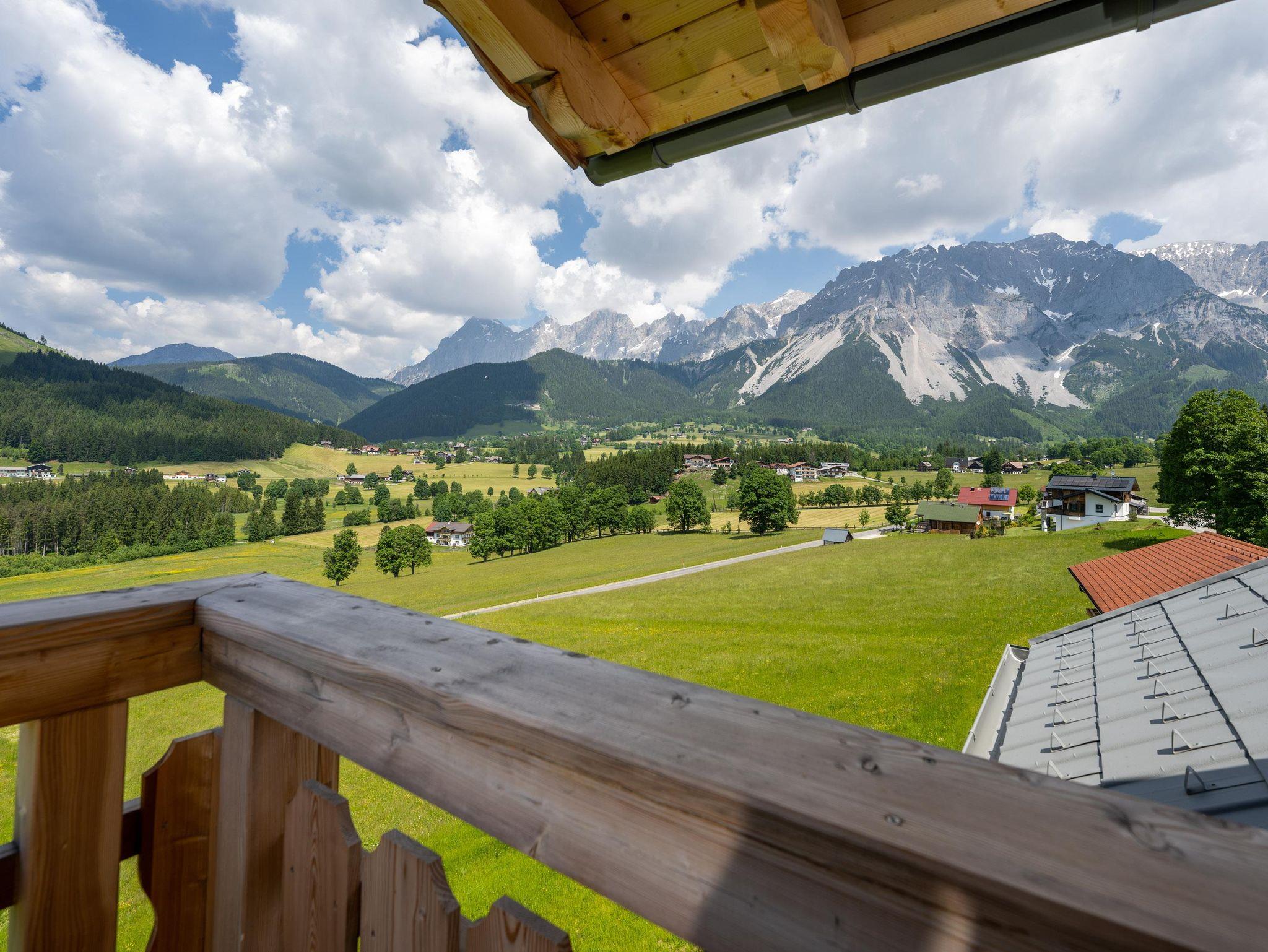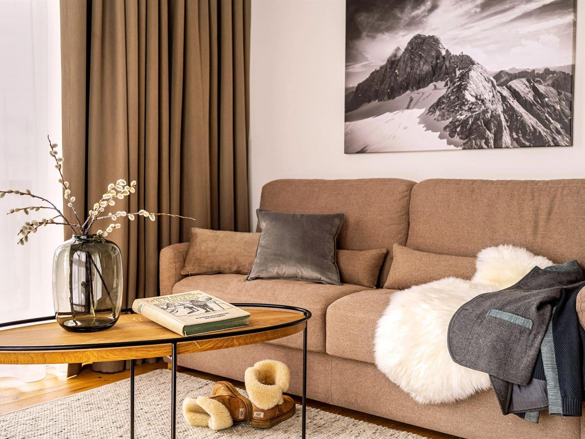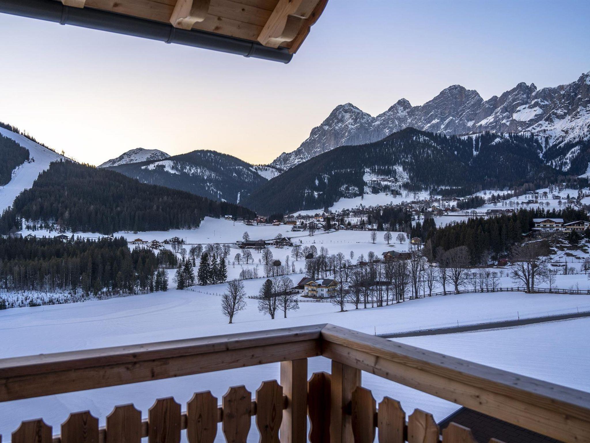 Hochwertigste Materialien treffen im Alpine-Cosmopolitan Design auf eine atemberaubende Aussicht auf das Dachsteinmassiv und die Niederen Tauern. Die West-Nord-Ausrichtung des Apartments bietet Sonne ganzjährig ab der Mittagszeit, im Sommer auch in den Morgenstunden.