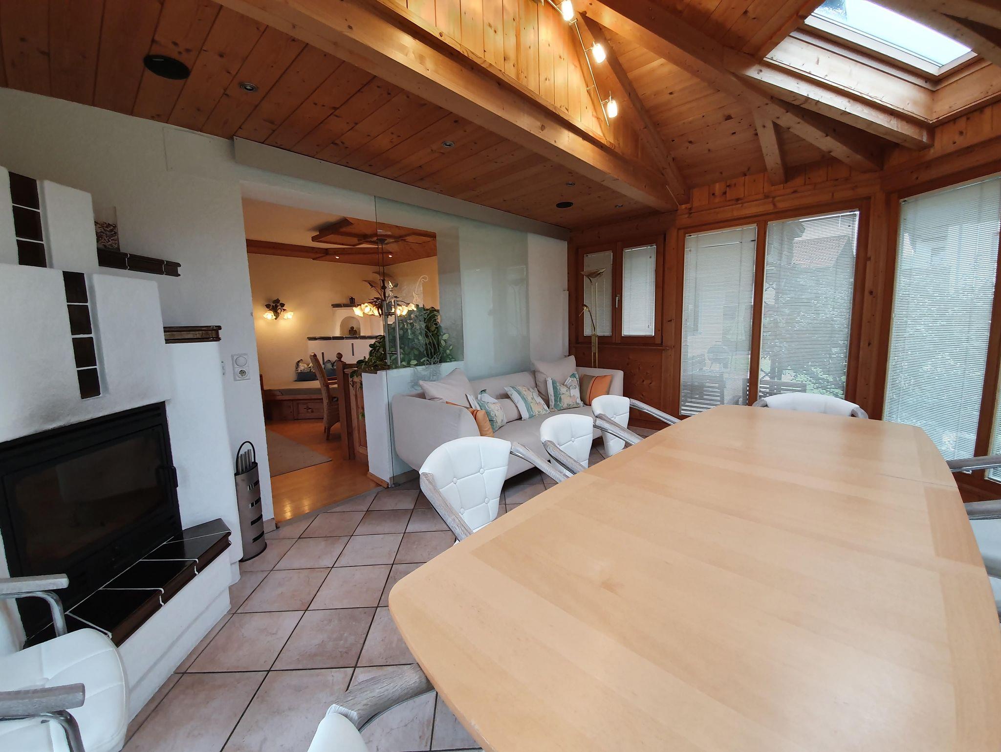 Wintergarten mit großem Esstisch, Couch und einem offenem Kamin für tolle und stimmungsvolle Abende. Größe 130 m2
