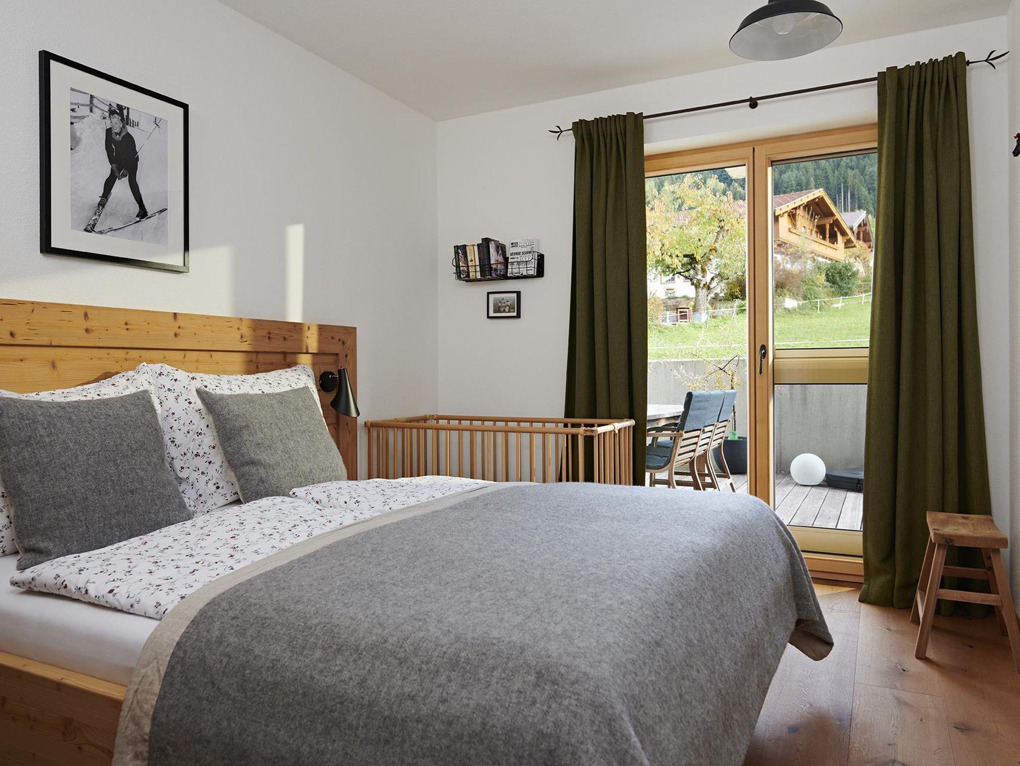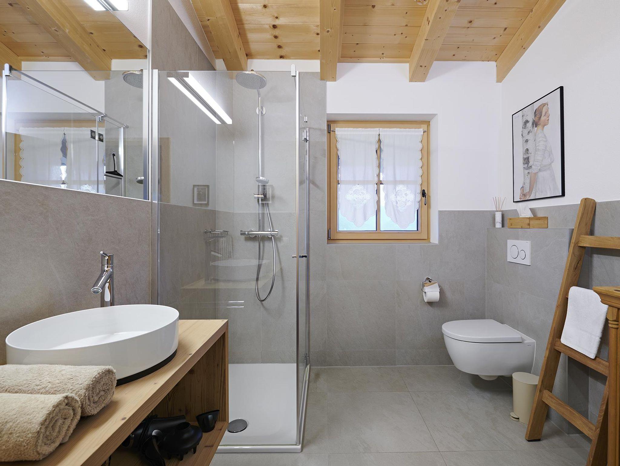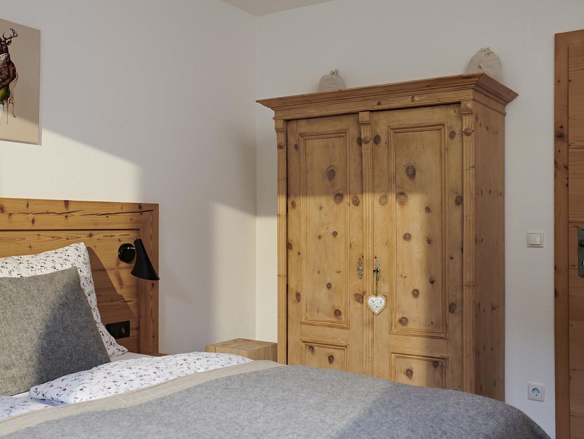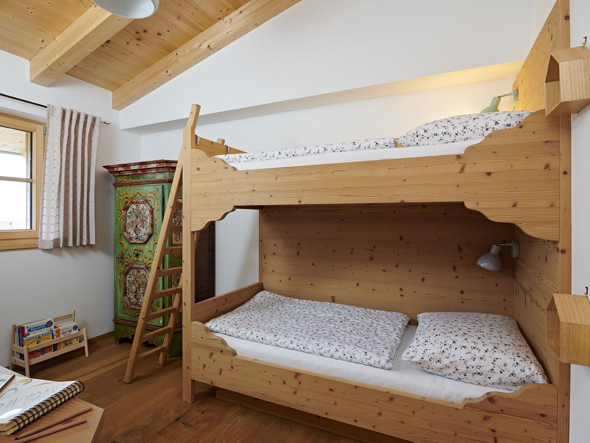 Mit 130 qm verfügt das Chalet Matty über vier Schlafzimmer (zwei Betten 160 x 200 cm, ein Bett 180 x 200 cm und einem Stockbett mit je 90 x 200 cm), in dem acht Personen und ein Kleinkind bis zu drei Jahre bequem Platz haben. Das Bad im Erdgeschoss ist mit einer modernen Duschbadewanne und einem Waschbecken, an dem zwei Personen gleichzeitig Platz finden, ausgestattet. In der Diele und im Flur findet sich ausreichend Platz und Ablagefläche für Garderobe, Wander- und Ski-Equipment.