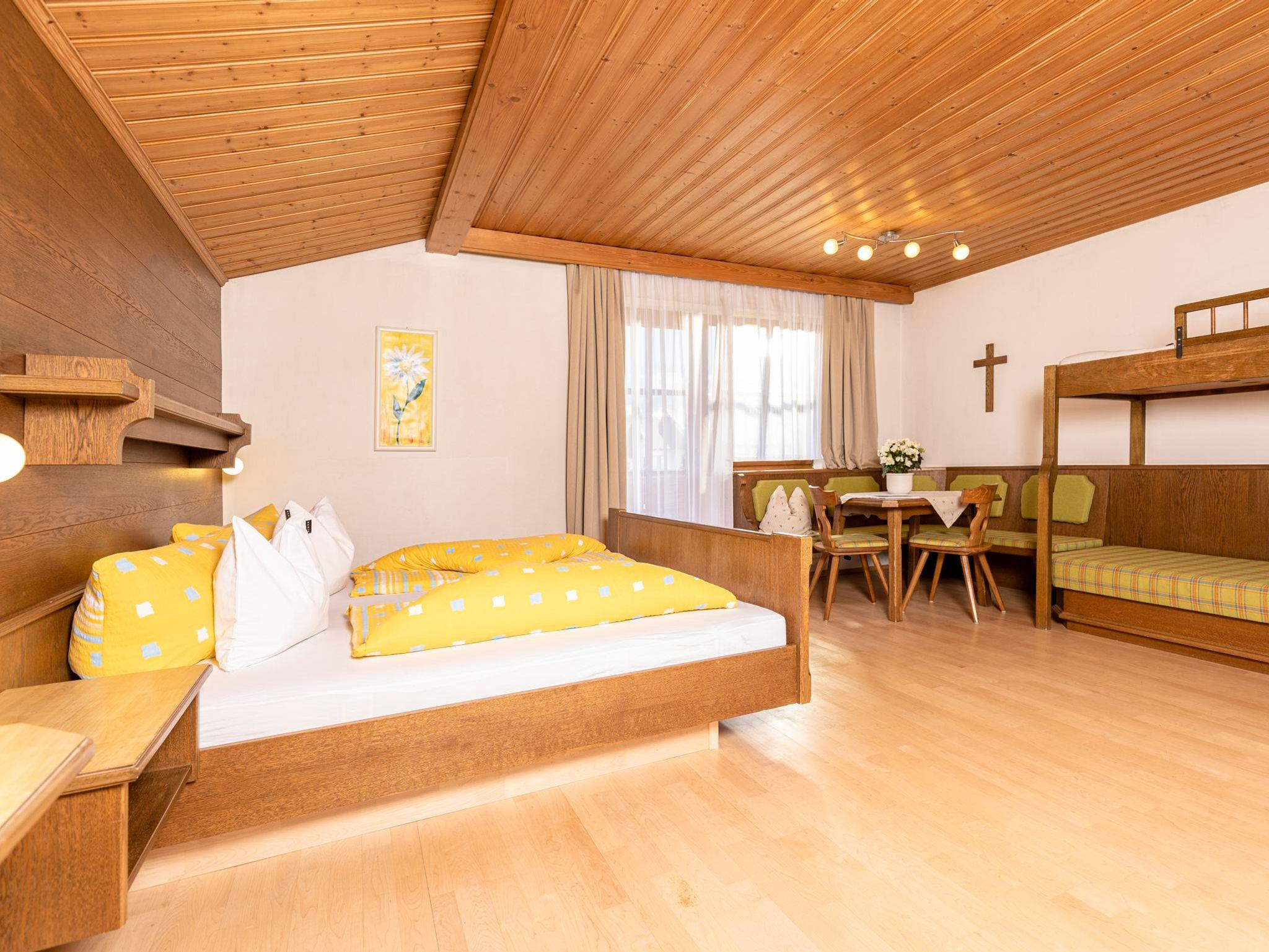 Großräumig und mit heimischen Naturmaterialien im alpinen Stil eingerichtet präsentiert sich unsere Ferienwohnung 7 (2. OG, ohne Aufzug). Ausgestattet mit einem Doppelbett und einem Sofabett sowie einem gemütlichen Wohnbereich bietet dieses Appartement Platz für bis zu vier Personen. Der Zugang zu zwei Balkonen ermöglicht es Ihnen, die wunderschöne Berglandschaft zu genießen und die frische, saubere Bergluft einzuatmen.