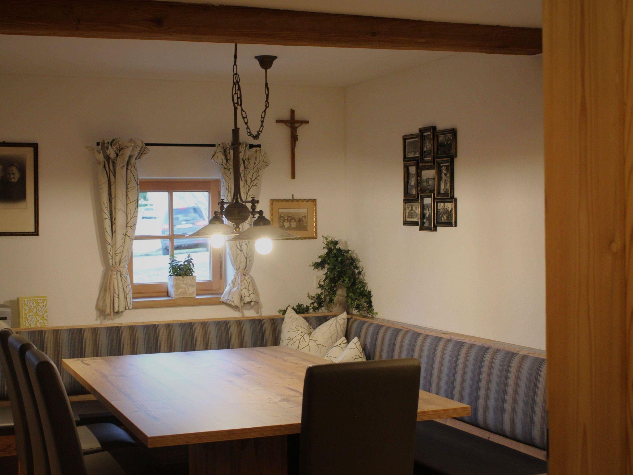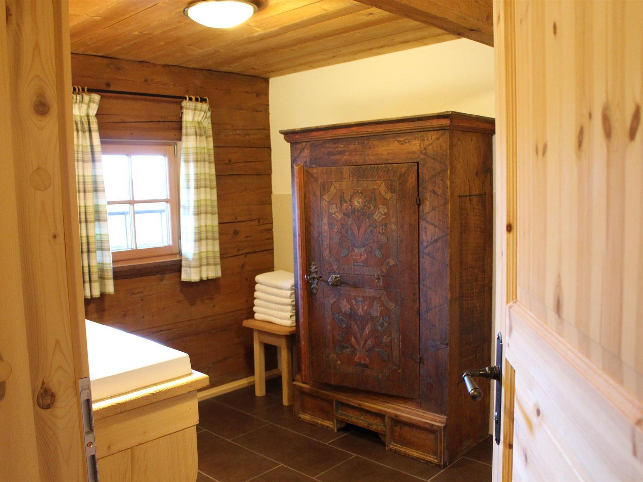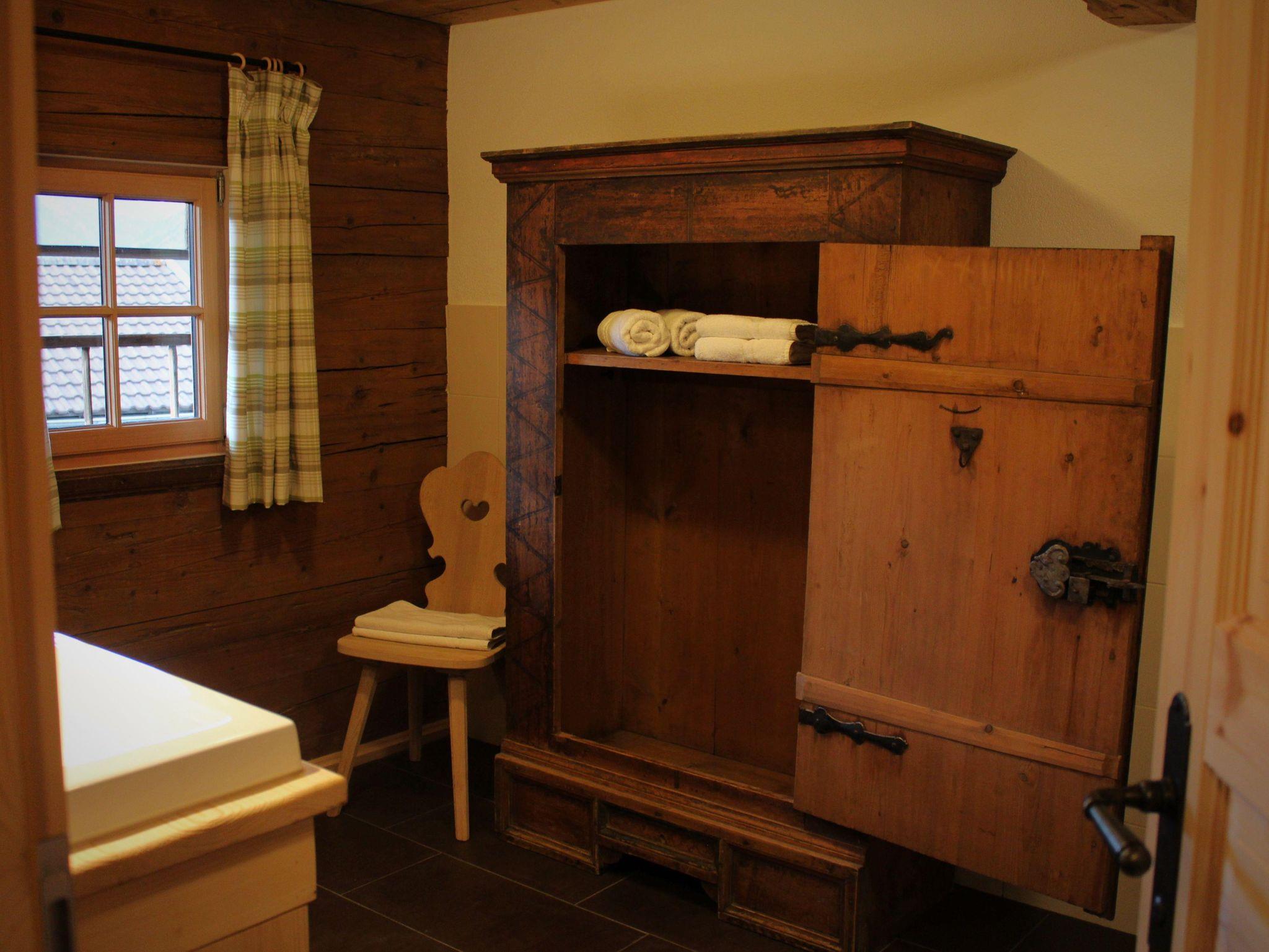 Im Erdgeschoss befinden sich die großzügige Küche mit großem Esstisch, die gemütliche Bauernstube mit Couchliege, ein WC, ein Bad mit Dusche und Badewanne sowie ein Doppelzimmer.