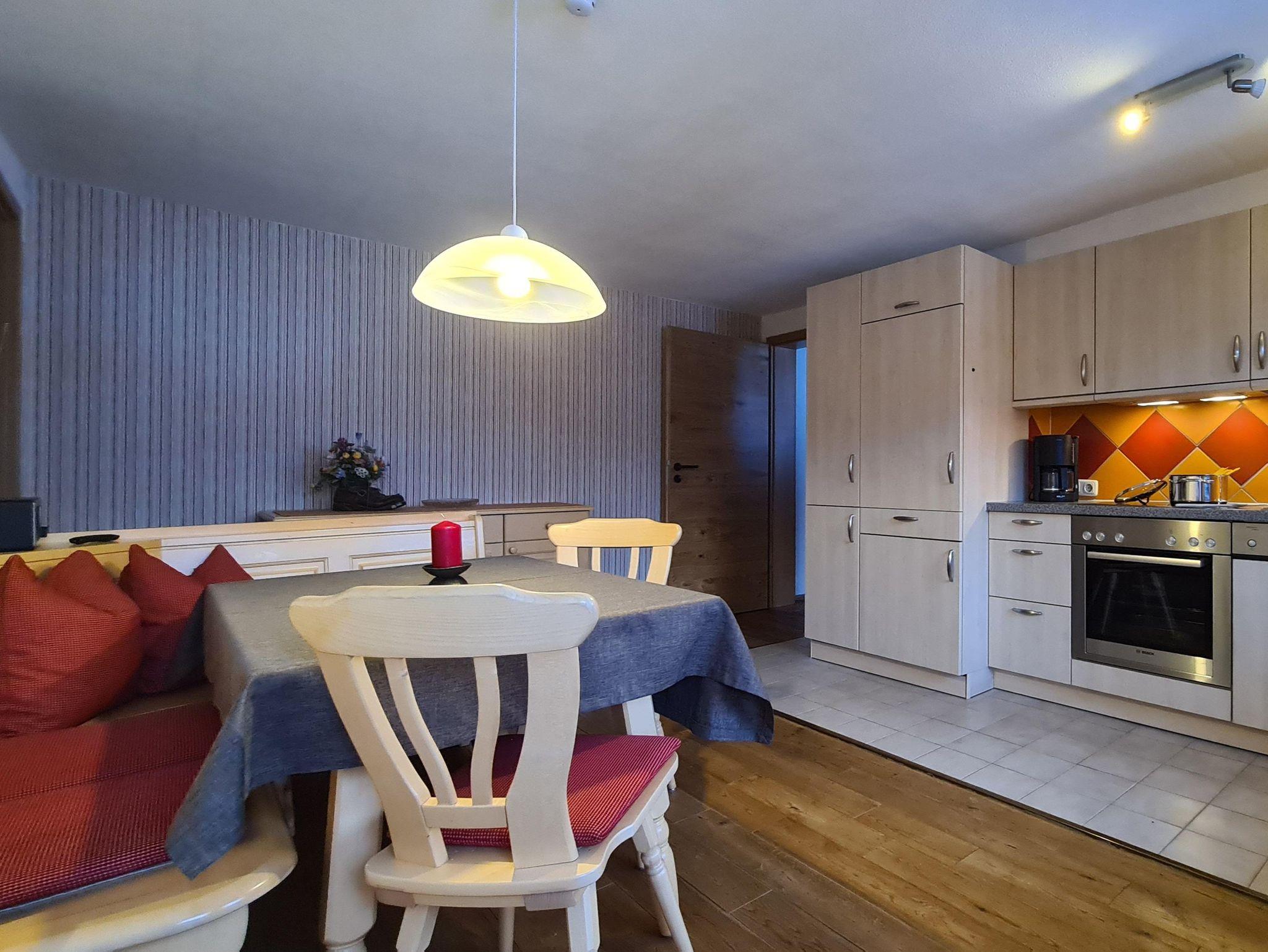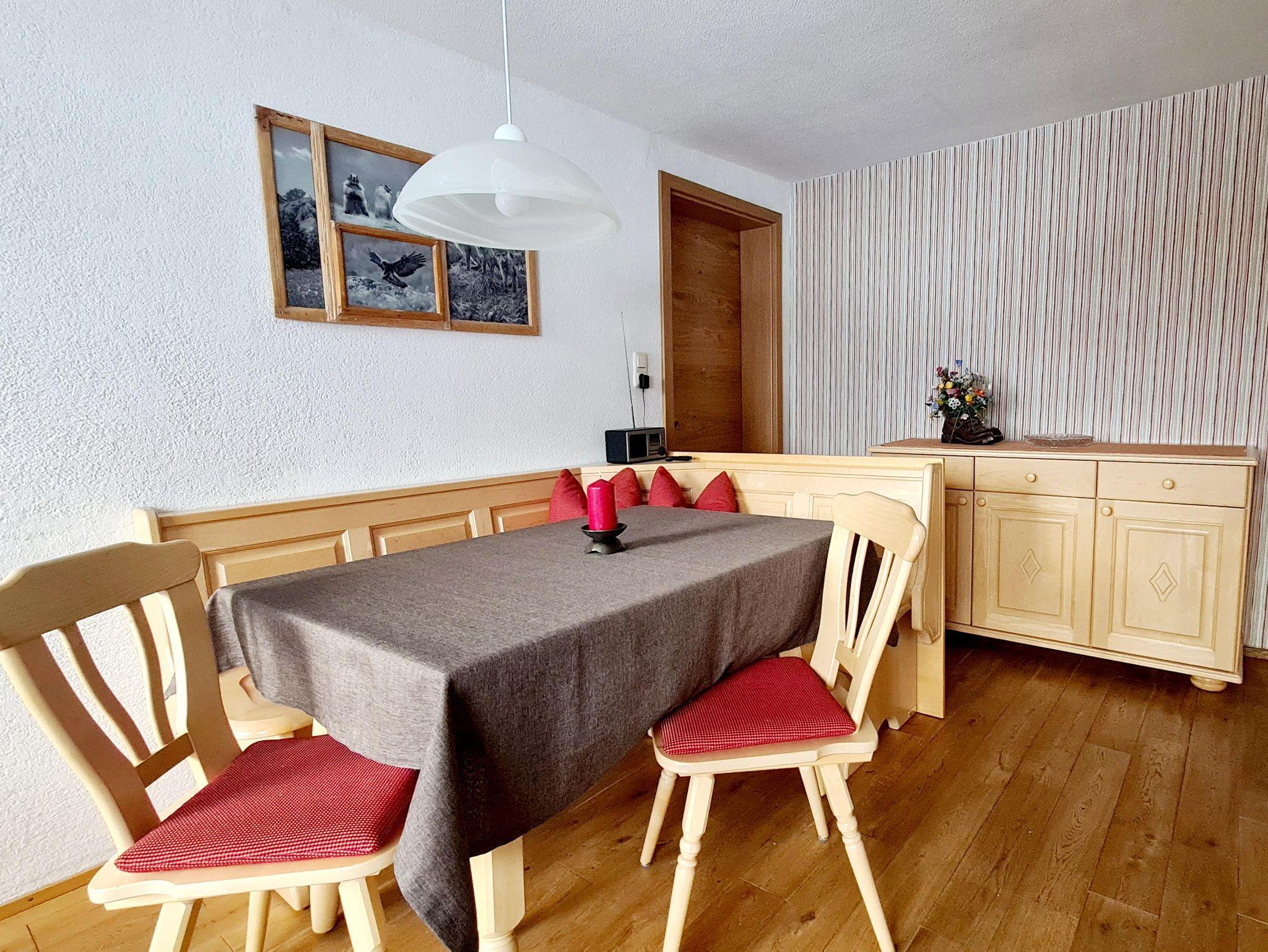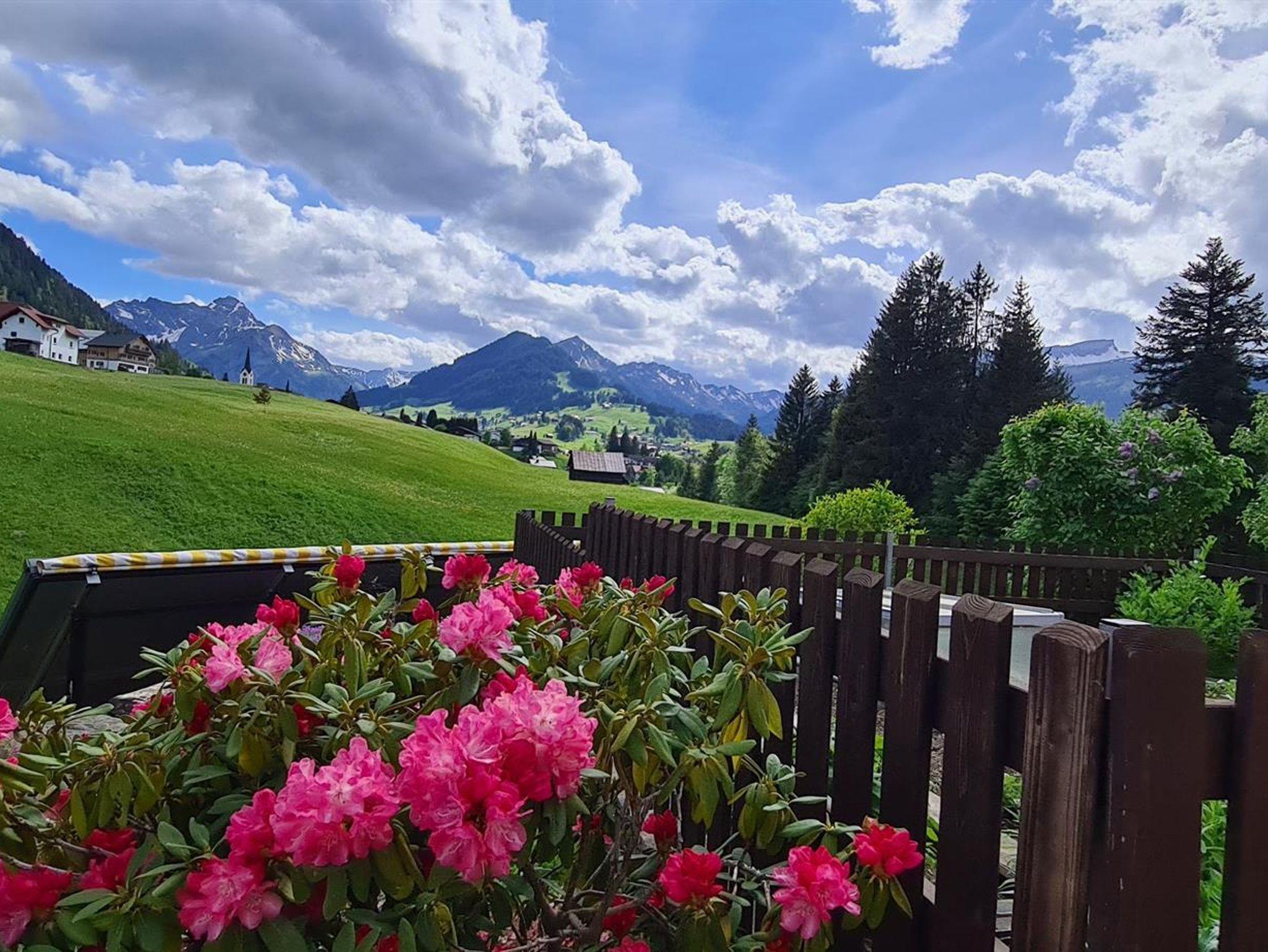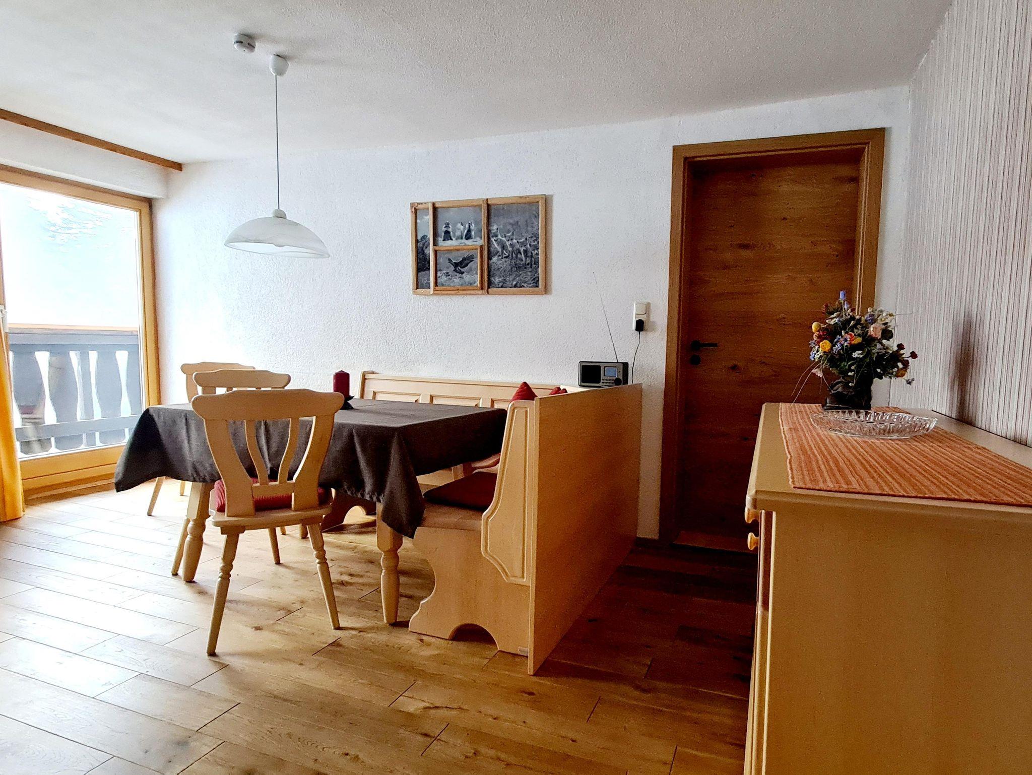 Essecke mit Blick auf die Kleinwalsertaler Berge mit Balkon.
