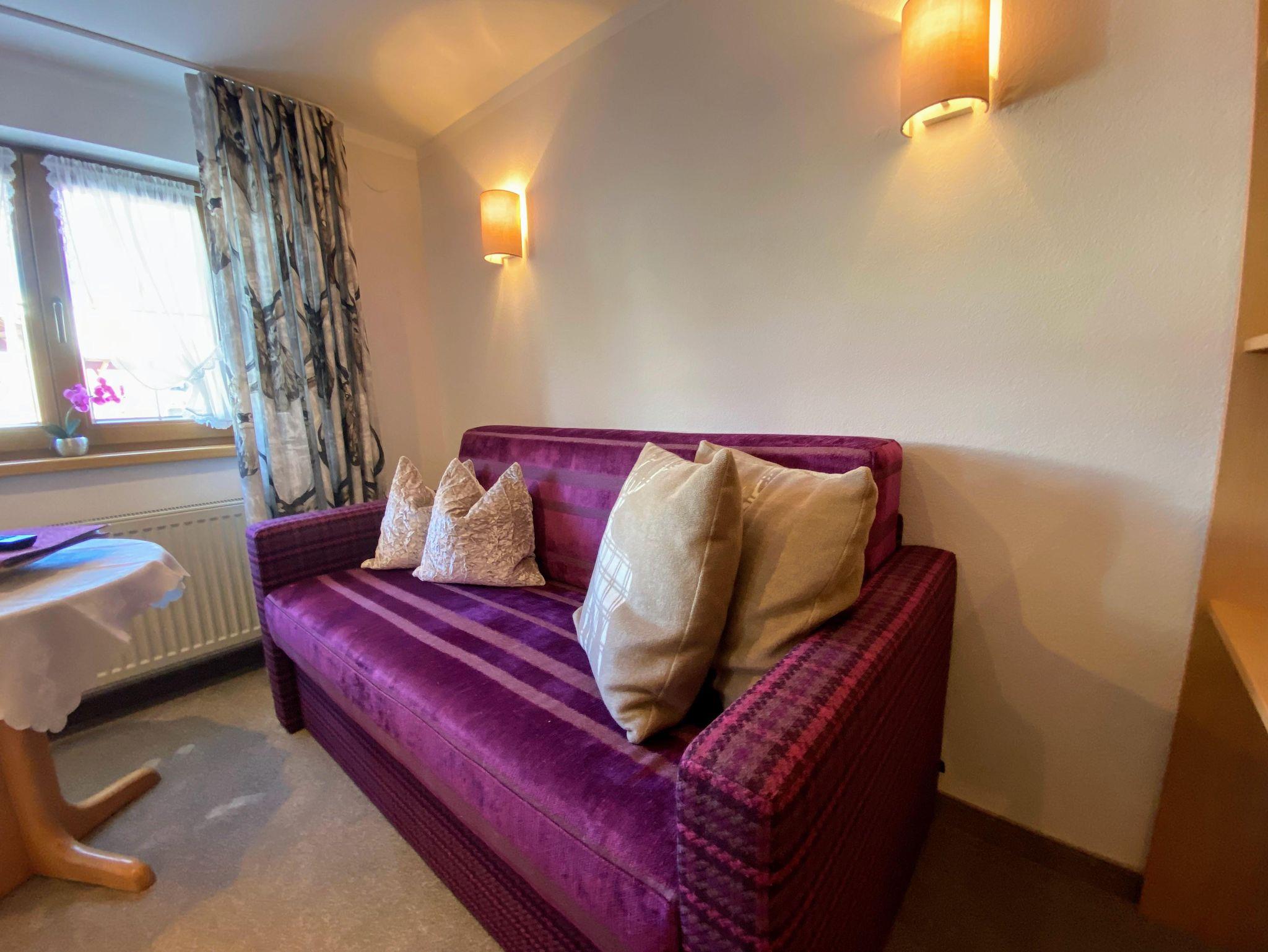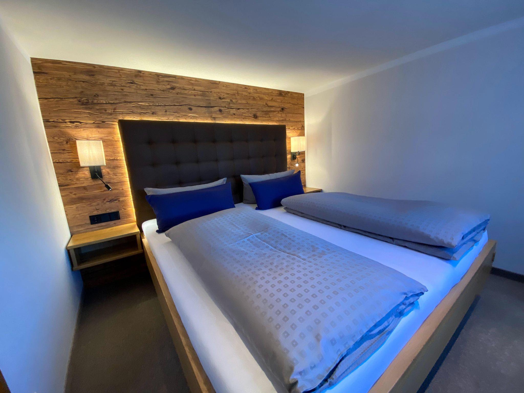 Doppelzimmer mit Balkon, getrennter Wohn-Schlafbereich, gemütlicher neuer Wohnteil im alpenländischen Stil und neuer Schlafzimmerbereich, Kühlschrank, Wasserkocher/ Teezubereitung, kleiner Esstisch, Safe
