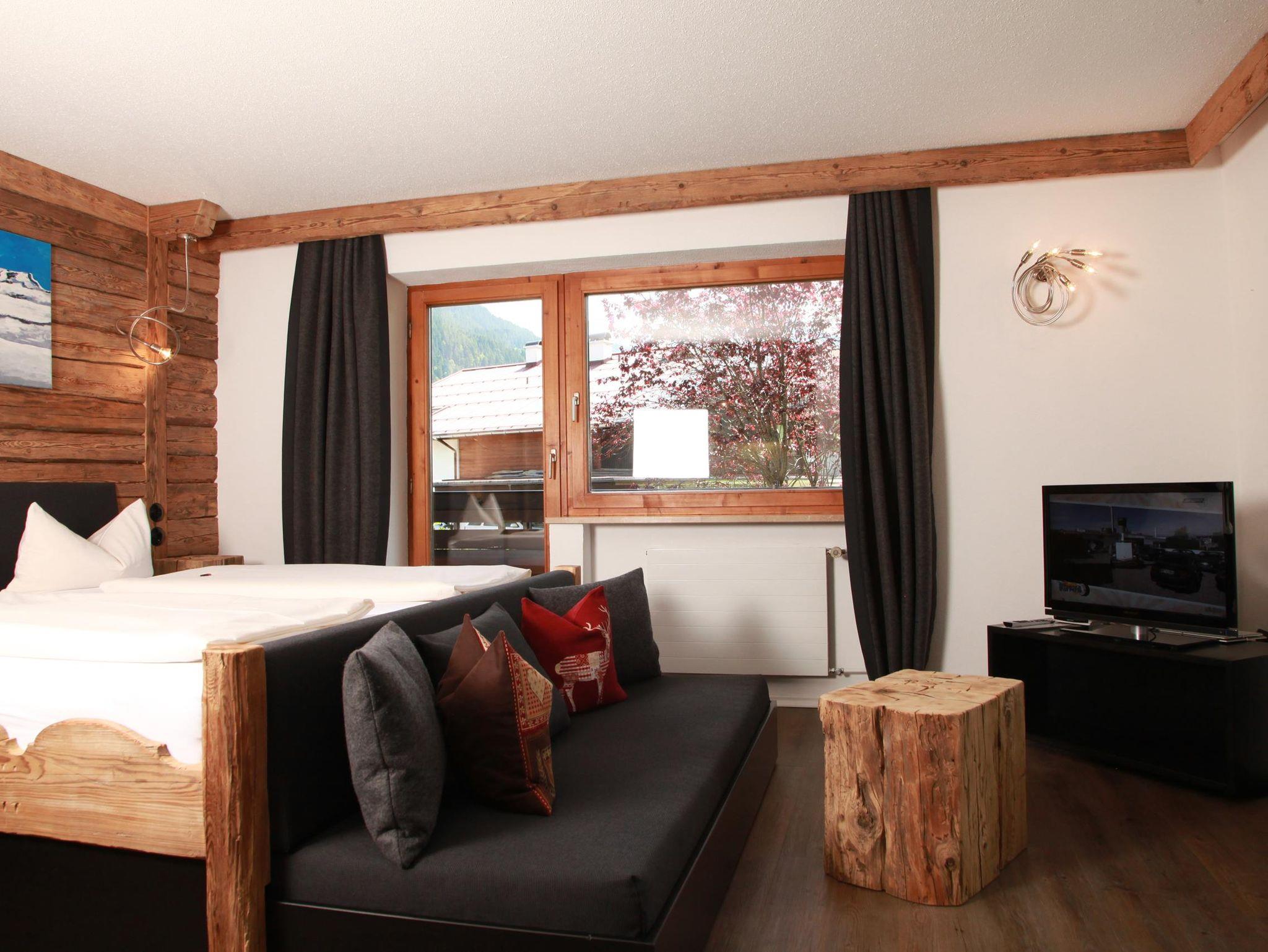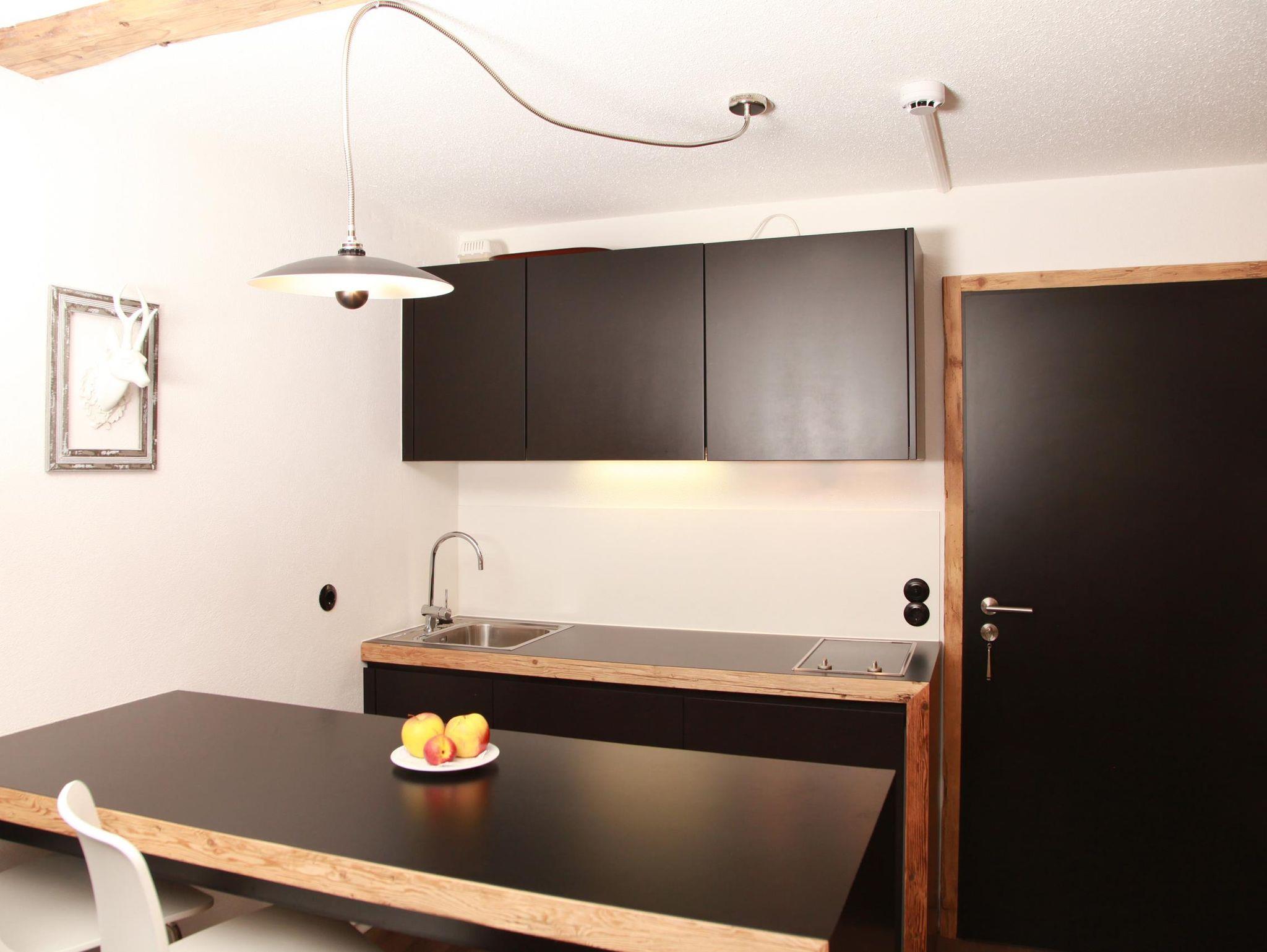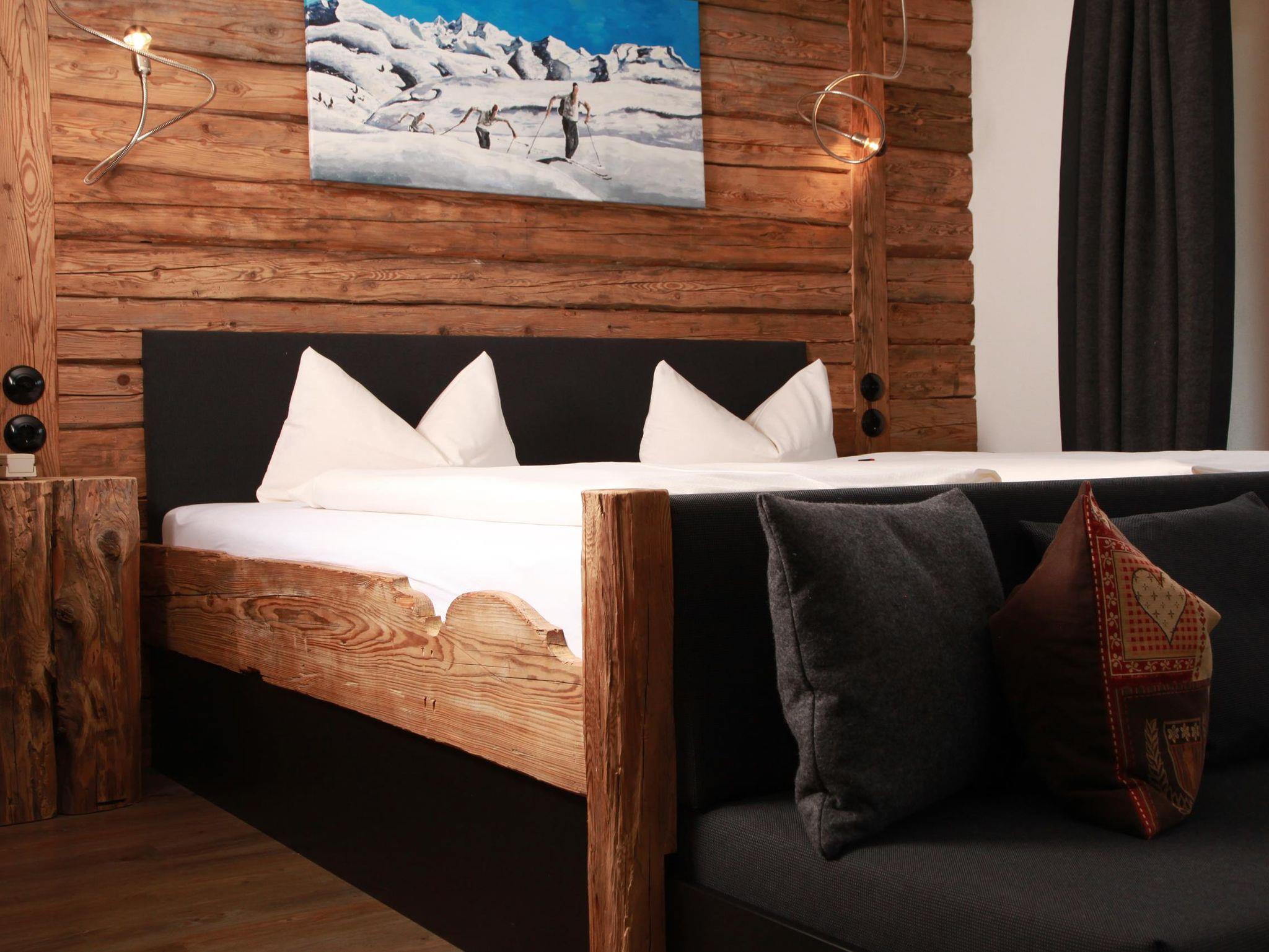 Doppelzimmer Deluxe „Gipfeltraum“ SCHWARZ für bis max. 3 Personen. Das Gipfeltraum verbindet die Tradition der Alpen mit modernem Design! Ein hochwertiges Doppelbett im alpinen Stil, gemütliche Sitzlounge mit Flatscreen, SAT-TV, W-LAN, Safe, Radiowecker, eine stilvolle Küche mit Ceranfeld und Spülmaschine mit ausgefallener Sitzinsel, Designerlampen, Designvinylboden, großer Südbalkon mit beeindruckendem Bergblick auf die Kleinwalsertaler Alpenwelt, DU/WC mit Hotelfön, Größe 30 m²