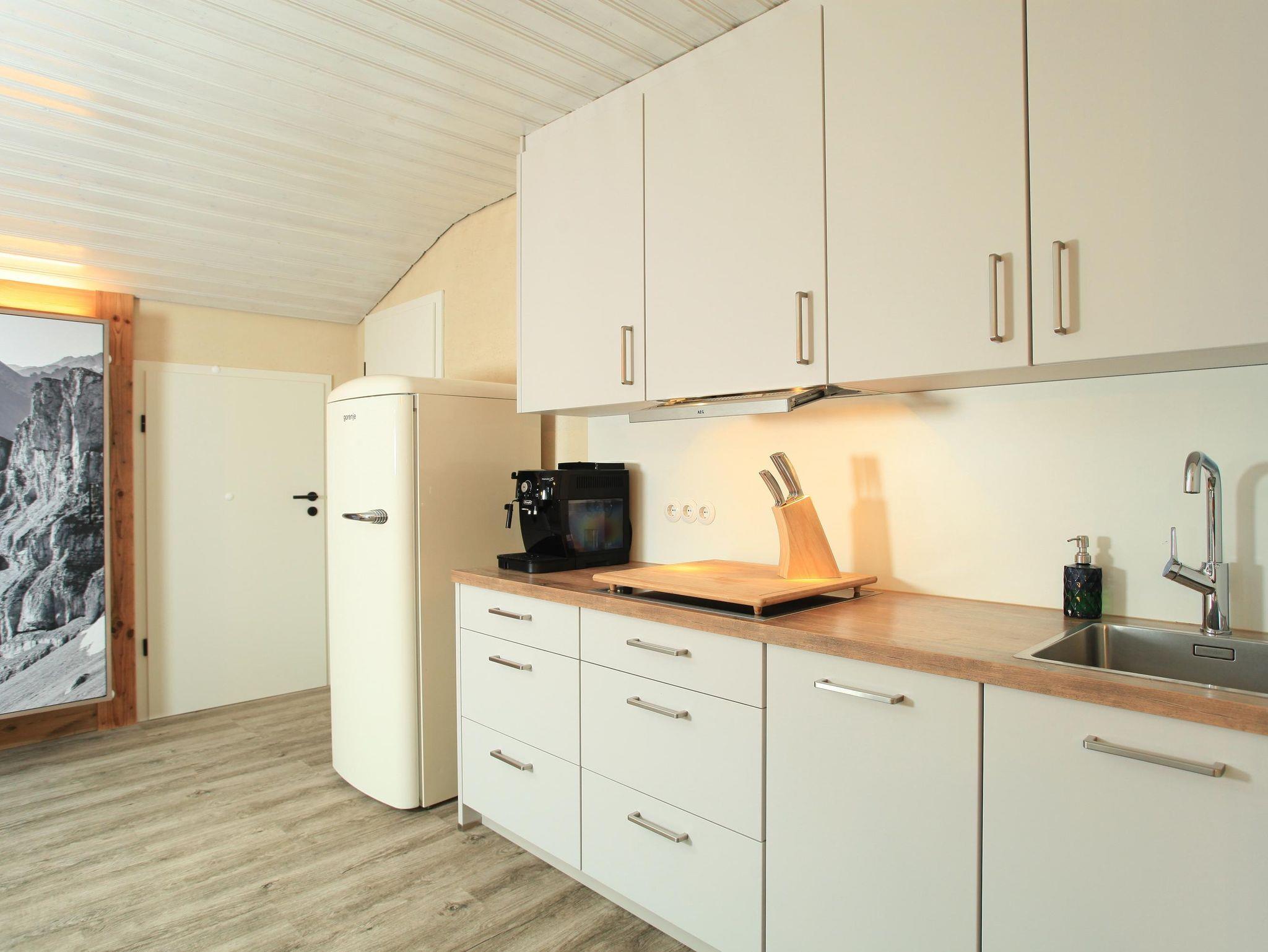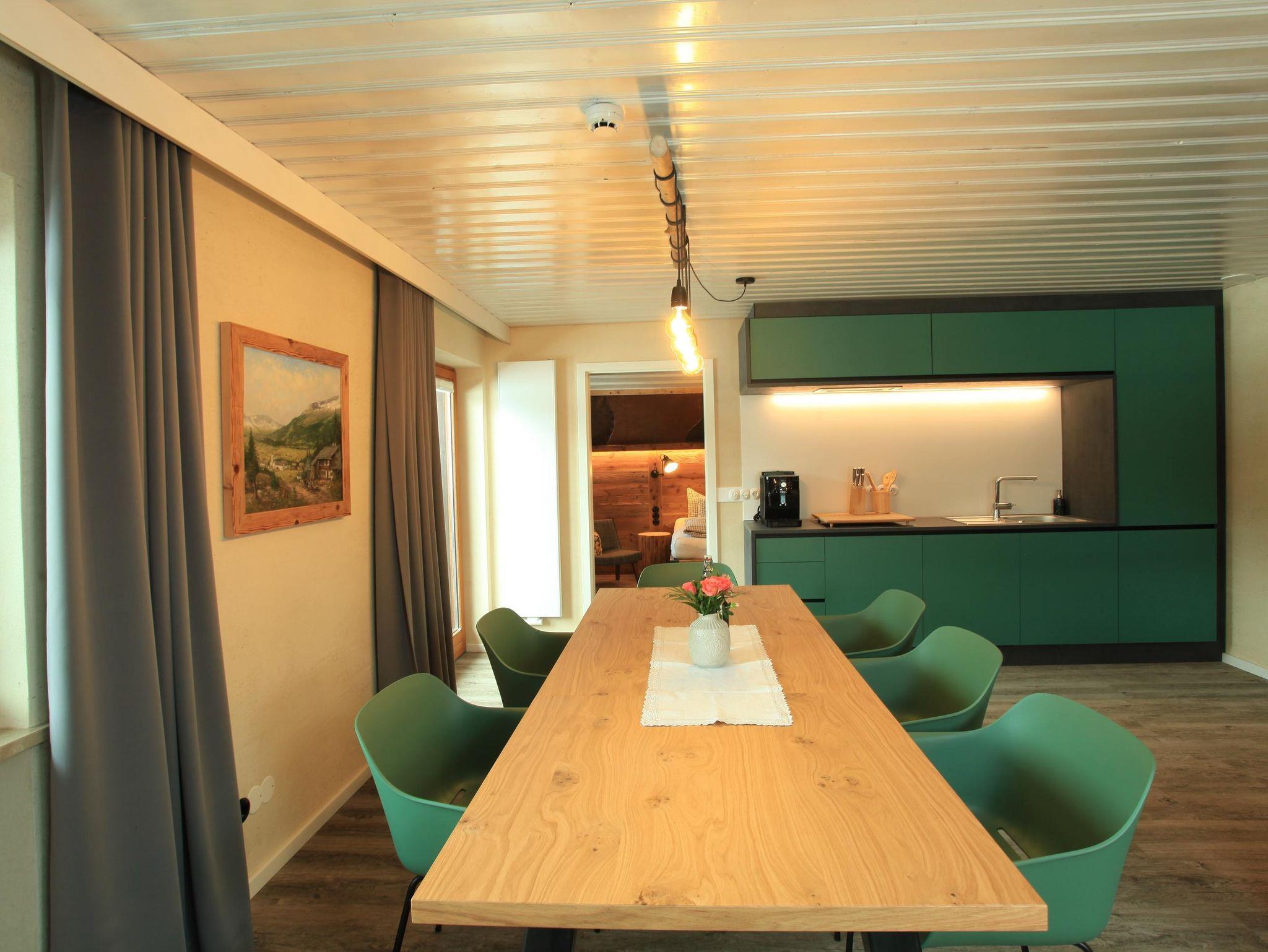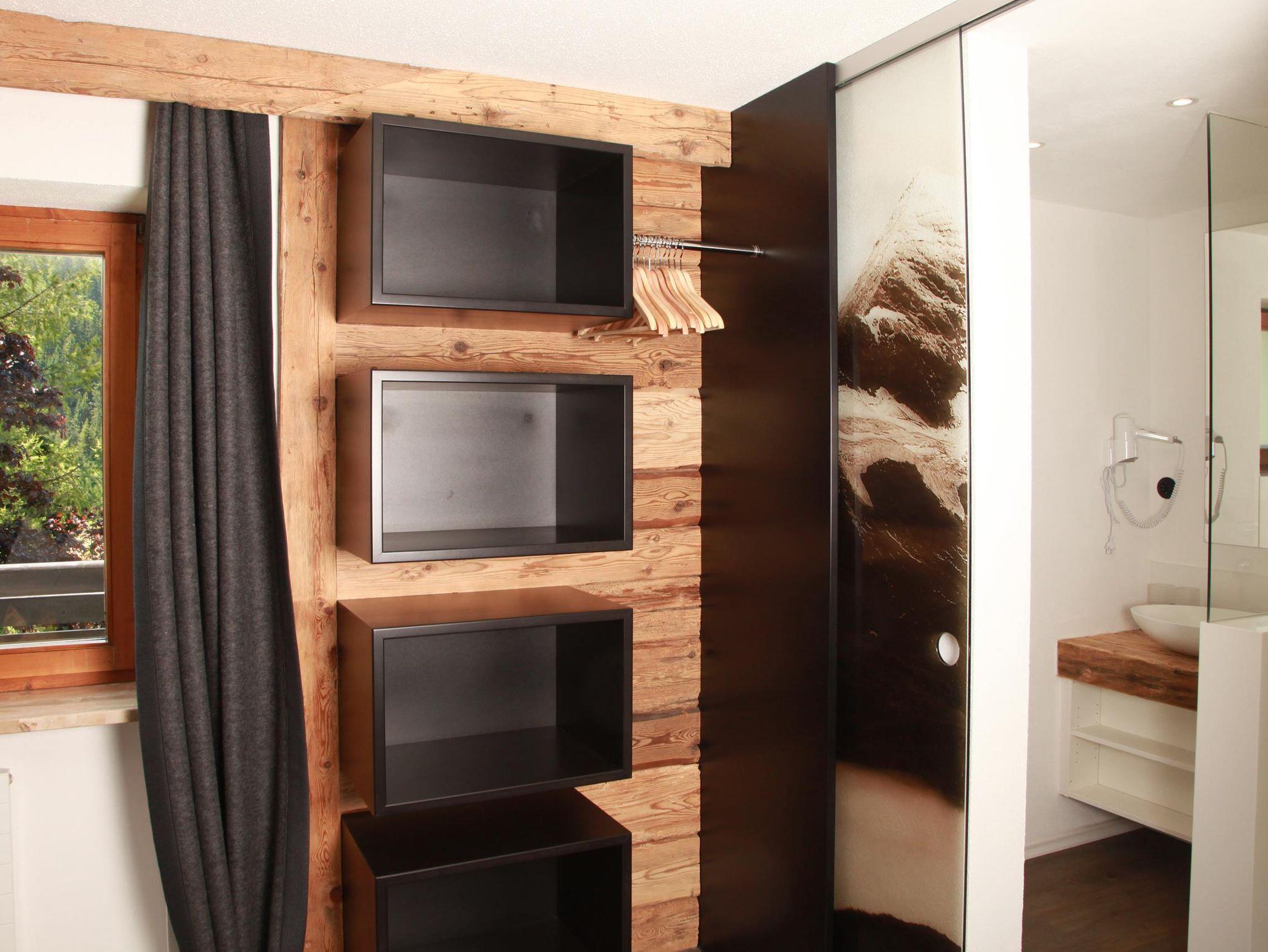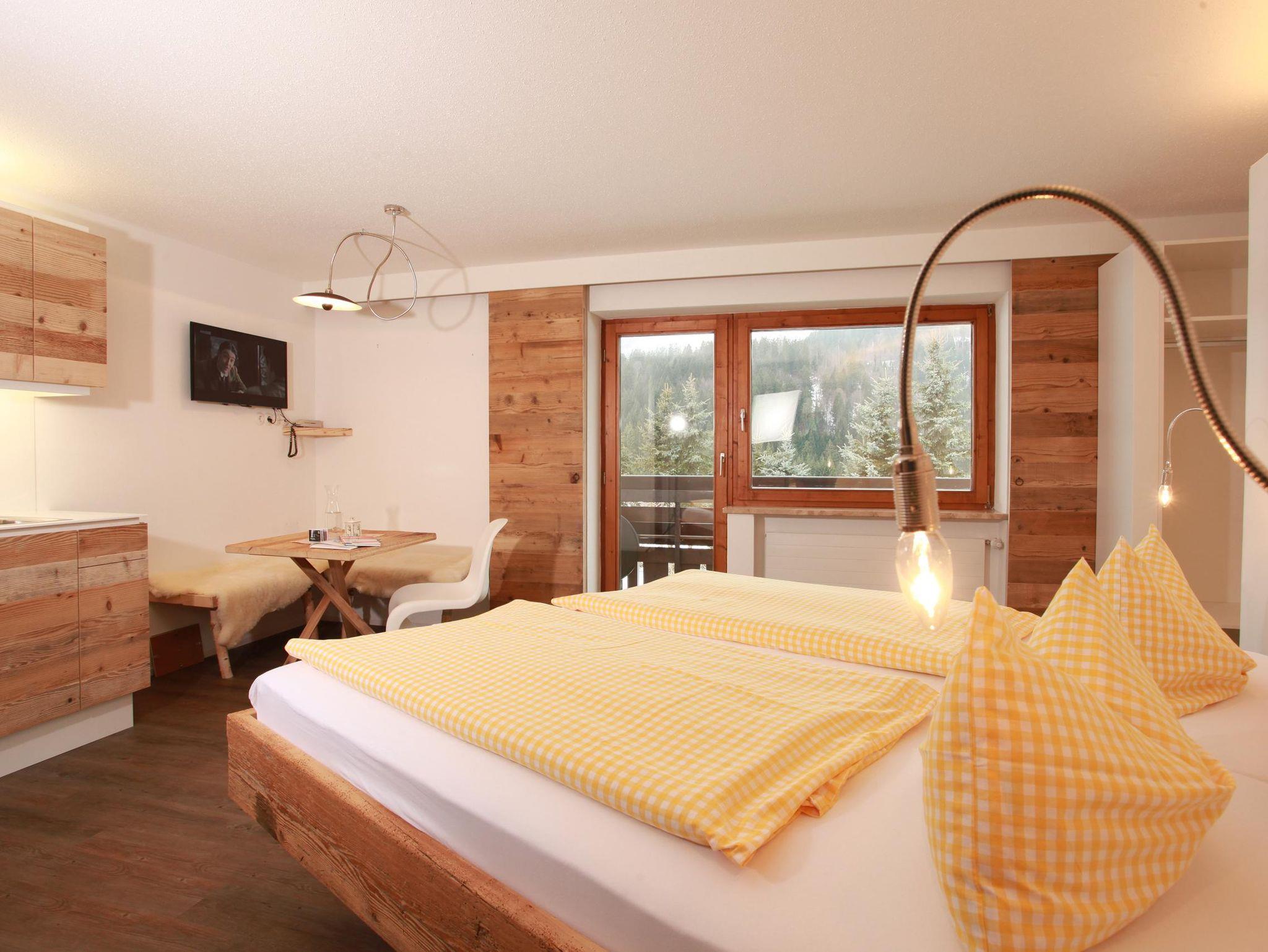 Doppelzimmer Deluxe „Gipfeltraum“ SCHWARZ für bis max. 3 Personen. Das Gipfeltraum verbindet die Tradition der Alpen mit modernem Design! Ein hochwertiges Doppelbett im alpinen Stil, gemütliche Sitzlounge mit Flatscreen, SAT-TV, W-LAN, Safe, Radiowecker, eine stilvolle Küche mit Ceranfeld und Spülmaschine mit ausgefallener Sitzinsel, Designerlampen, Designvinylboden, großer Südbalkon mit beeindruckendem Bergblick auf die Kleinwalsertaler Alpenwelt, DU/WC mit Hotelfön, Größe 30 m²