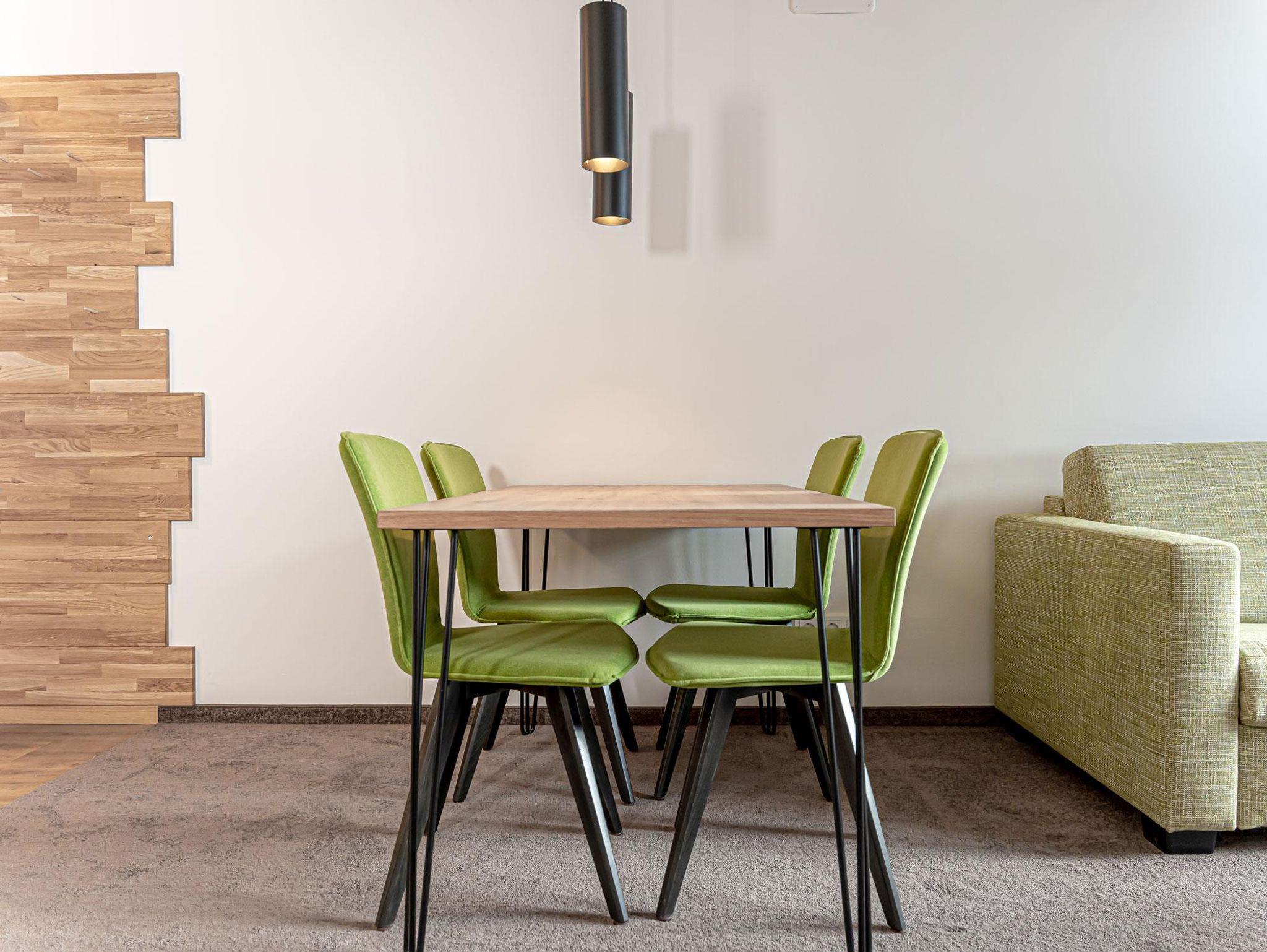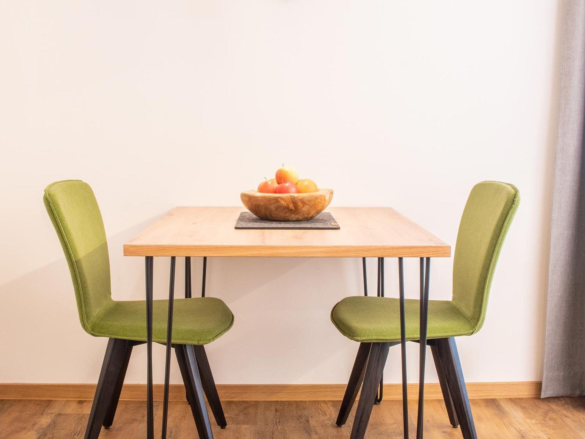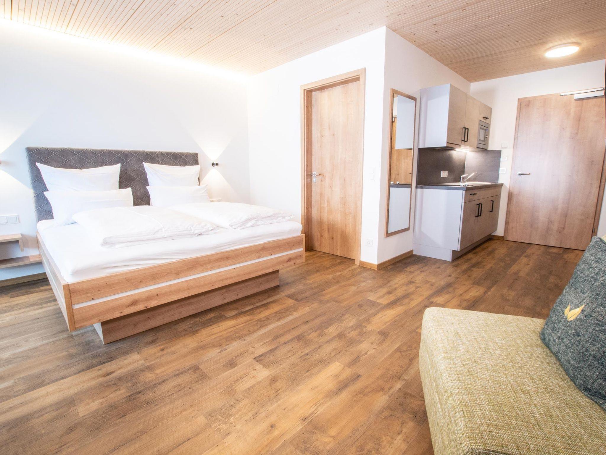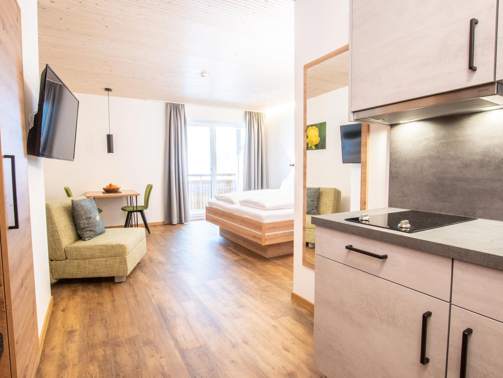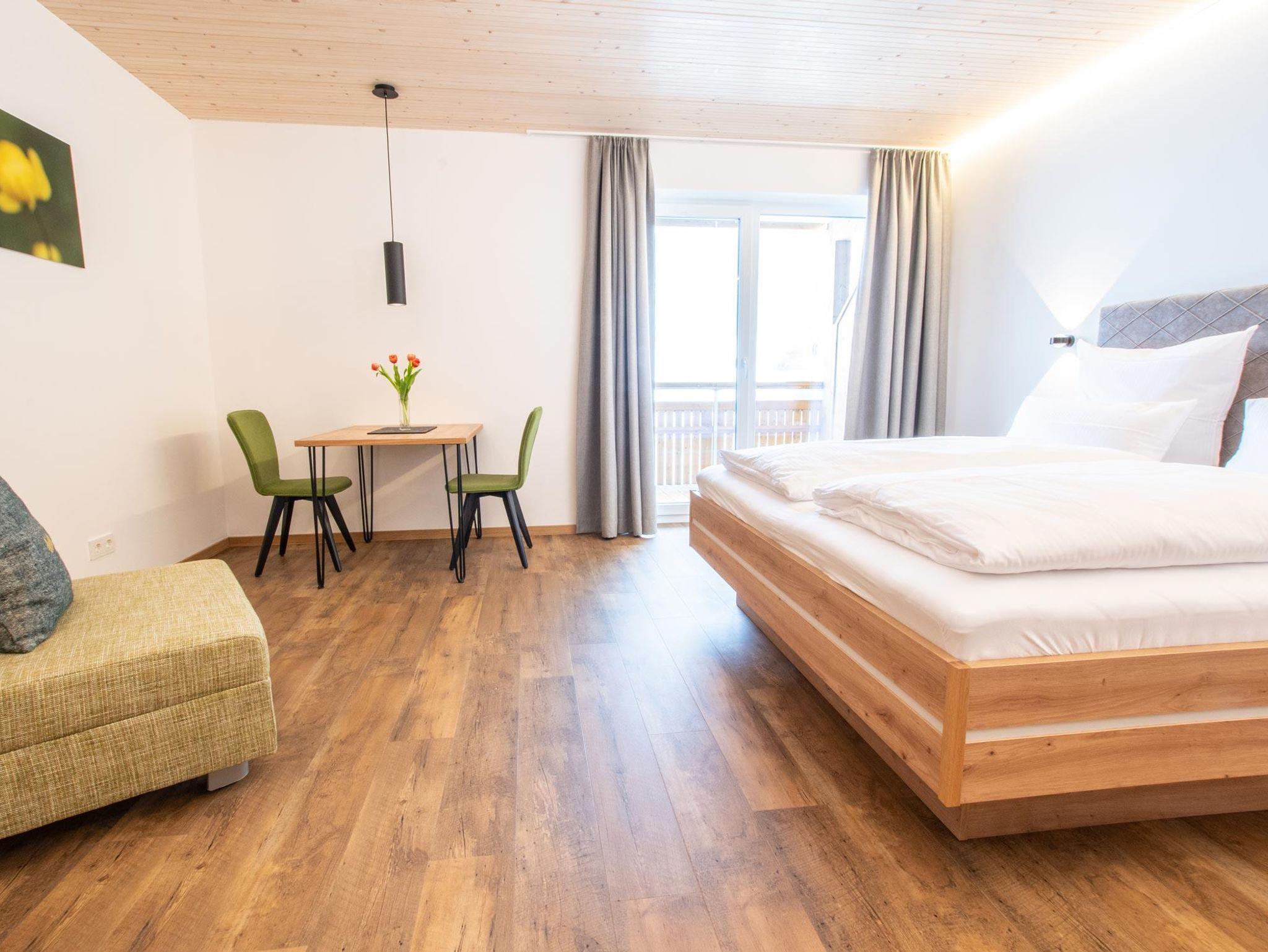 Die Trollblume Chalets bieten einen großzügig geschnittenen Wohn-Schlafraum für unbeschwerte Urlaubstage. Das zeitlose Design und das gesunde Raumklima sorgen für ein luftiges Wohngefühl. Vom Balkon aus führt der Blick in Richtung Riezler Alp und Fellhorngrat.