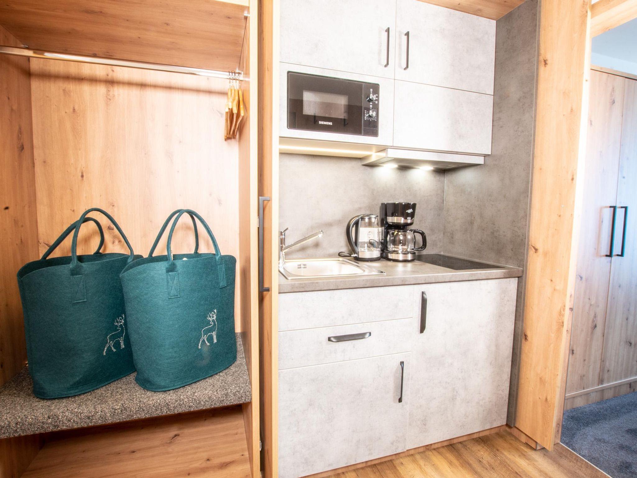 Doppelzimmer mit Balkon und Blick auf das Fellhorn. Ausgestattet mit modernen Möbeln im Eichenholzstil, einem Esstisch mit Stühlen sowie einer Küchenzeile und einer ausziehbaren Couch. Bad mit Dusche, WC und Föhn.