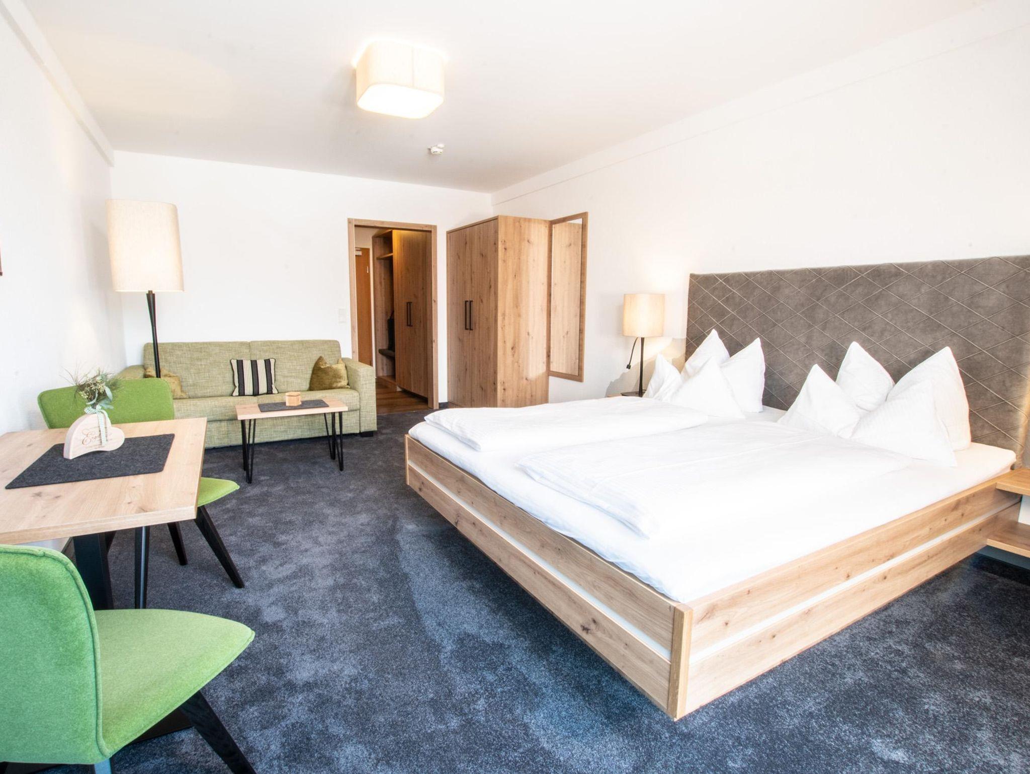 Modernes Doppelzimmer mit Panoramablick und ausziehbarer Couch. Balkon mit Bergblick. Dezente Farben und Möbel im Eichenholzstil verleihen ein helles Raumgefühl. Das Zimmer verfügt über einen Esstisch und Stühlen sowie eine kleine Küchenzeile und einem Bad mit Dusche, WC und Föhn.