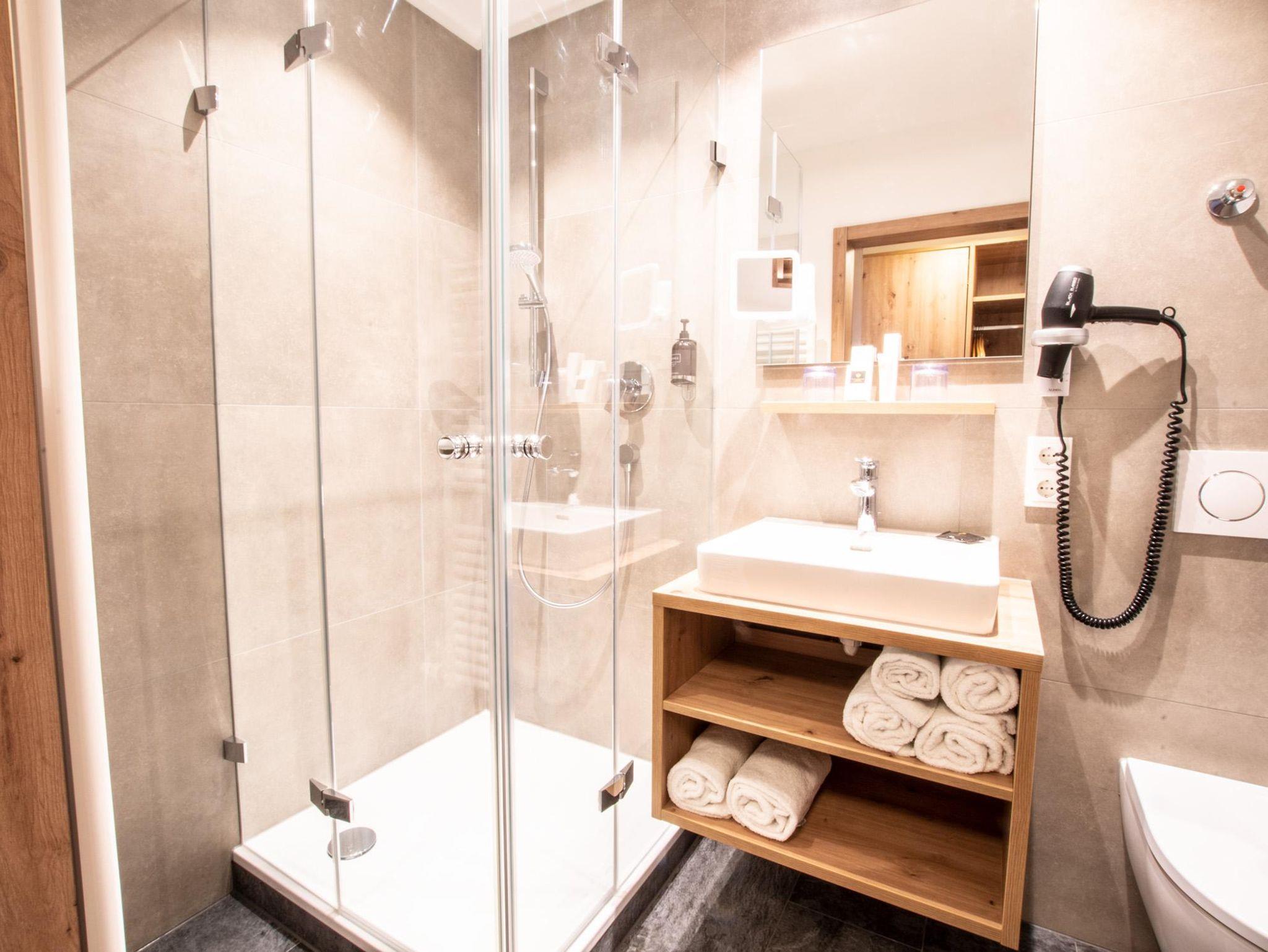 • Badezimmer (ohne Fenster) mit Dusche/WC, Föhn, Bademänteln & Pflegeprodukten
