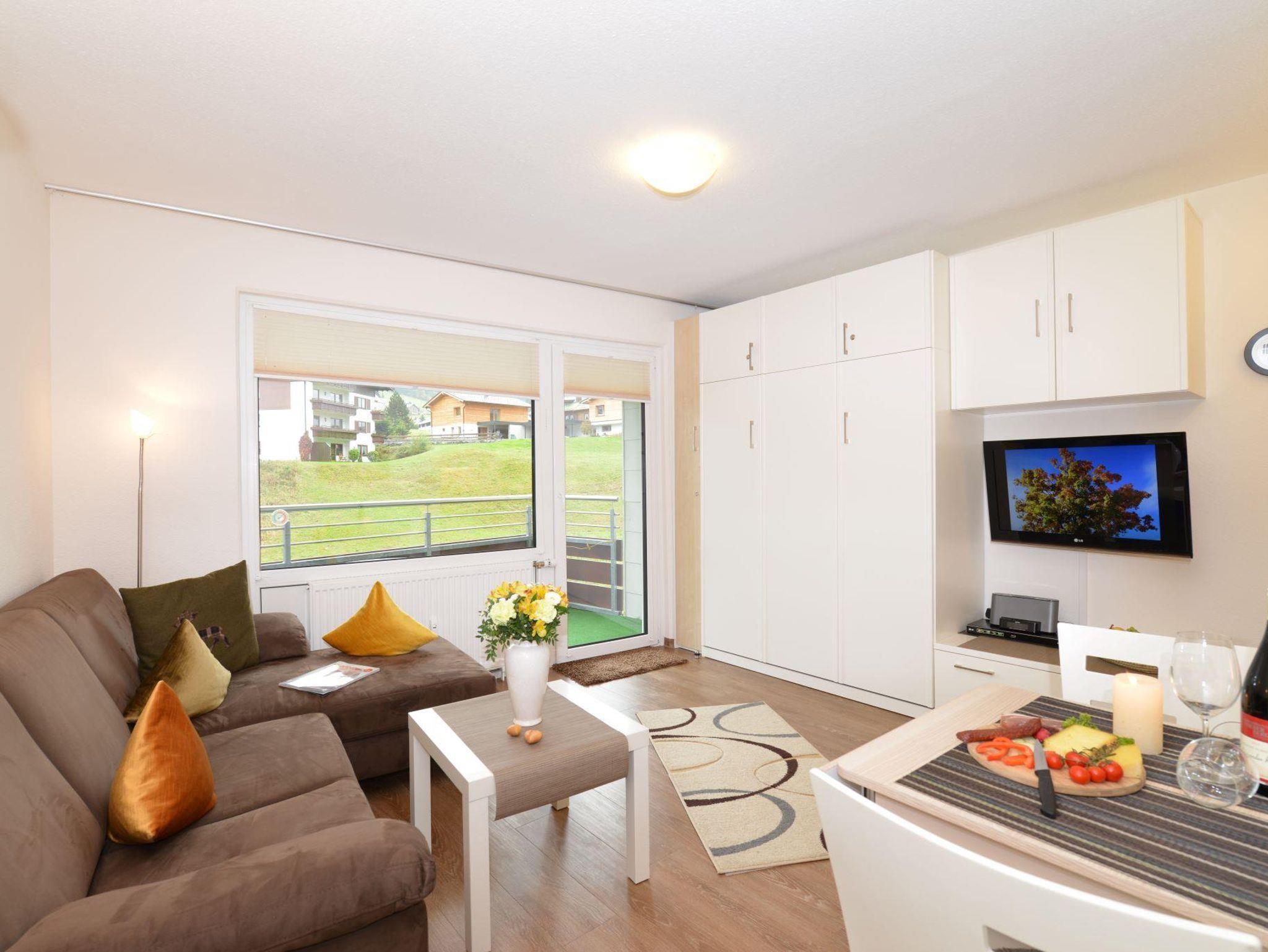 Komfortables 2-Raum Appartement für 2-4 Personen mit Einzelbetten im Schlafzimmer und einer weiteren Schlafmöglichkeit für 2 Personen im Wohnbereich in Form von Schrankbett oder Schlafsofa. Das Appartement verfügt über eine Kochnische, einen privaten Balkon, ein Bad mit Dusche oder Wanne und Flatscreen-TV. Von Mai bis November ist das Bergbahnticket inklusive.