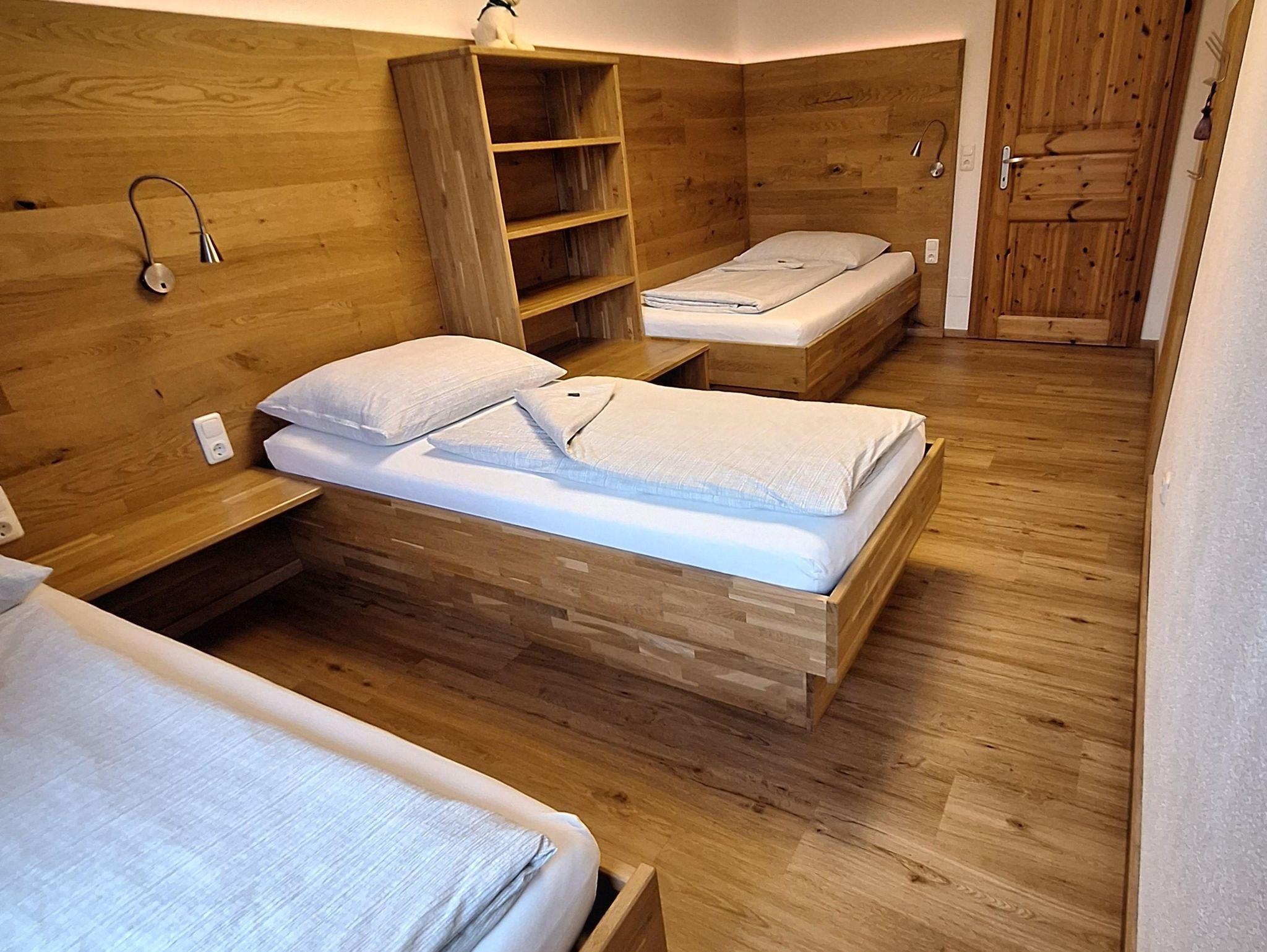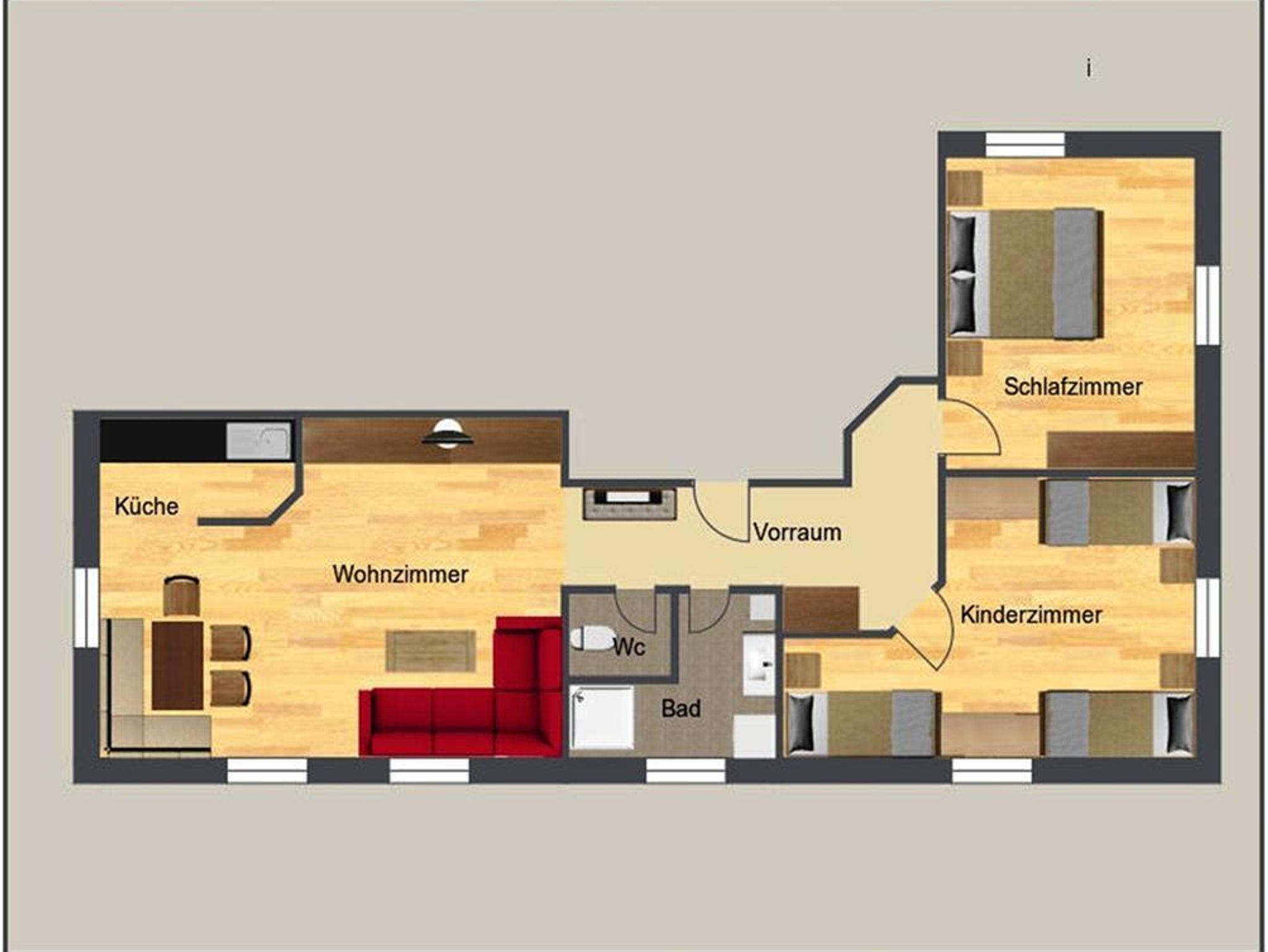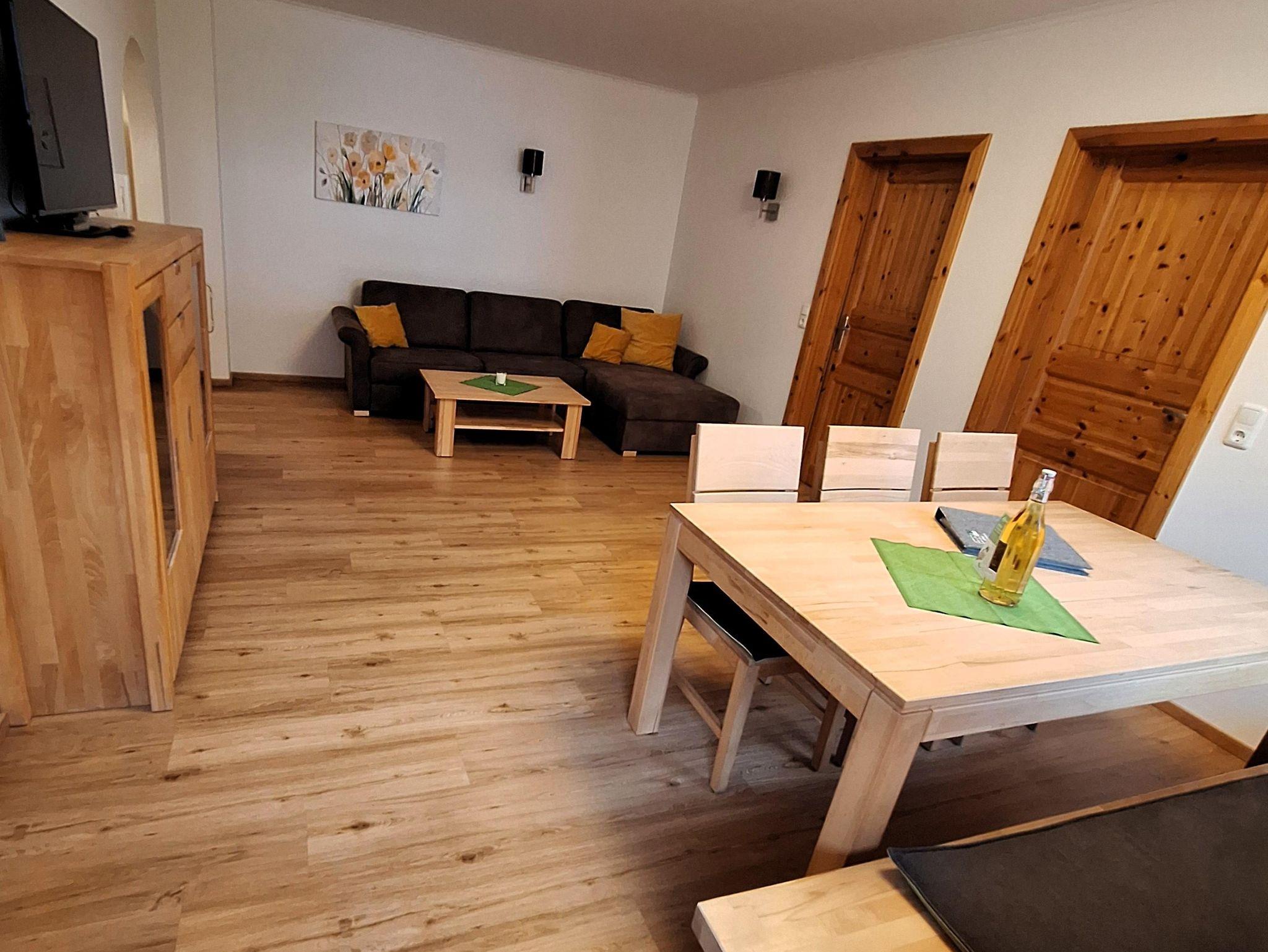 Große Ferienwohnung mit 80m² für 1-7 Personen, ein Doppelbettzimmer, ein Kinderzimmer mit 3 Einzelbetten, Küche mit Geschirrspüler, großes Wohnzimmer mit Sat-TV, ausziehbarer Couch und Essecke, Dusche und WC getrennt. Die Wohnung befindet sich im 1. Stock.