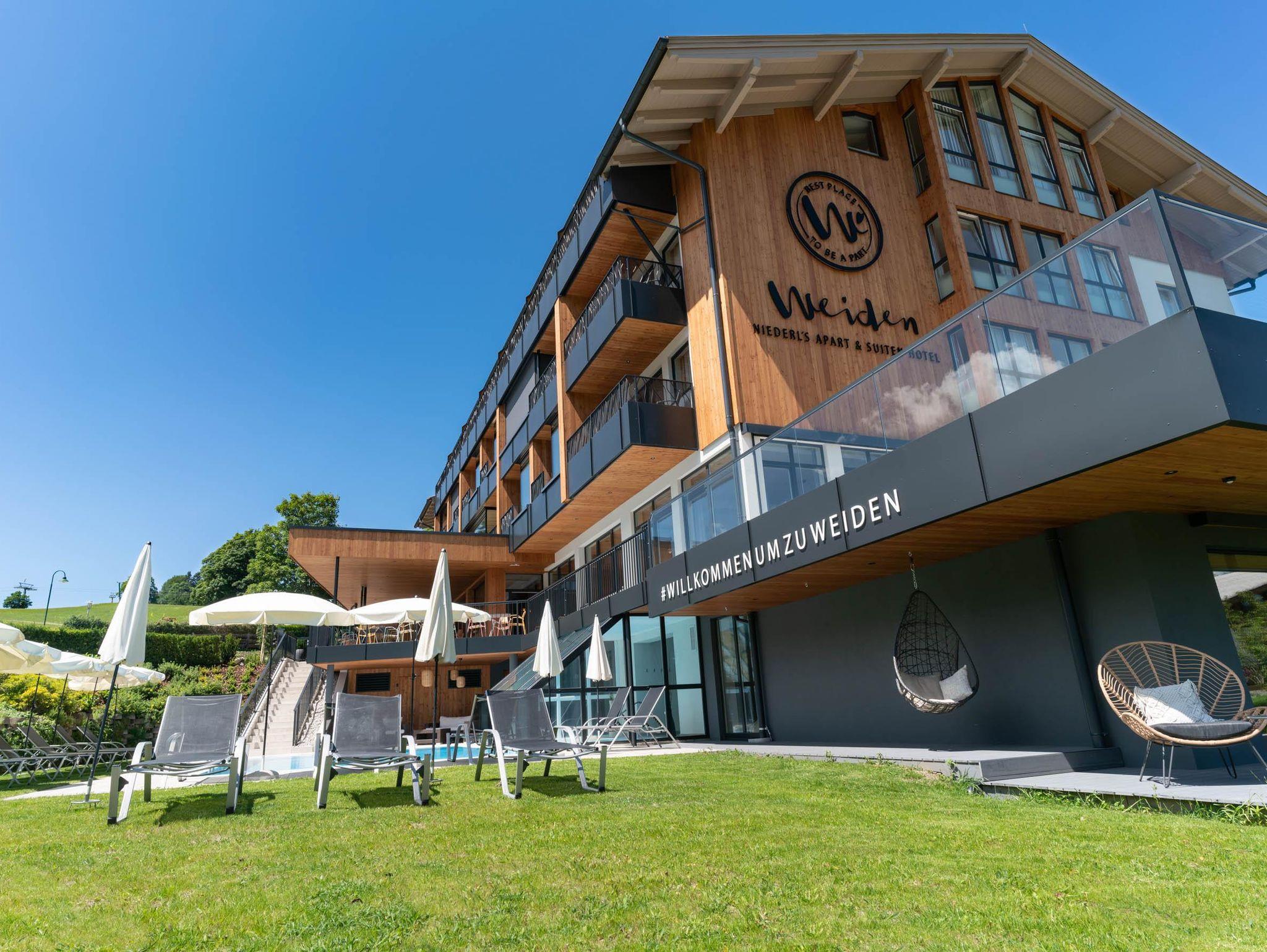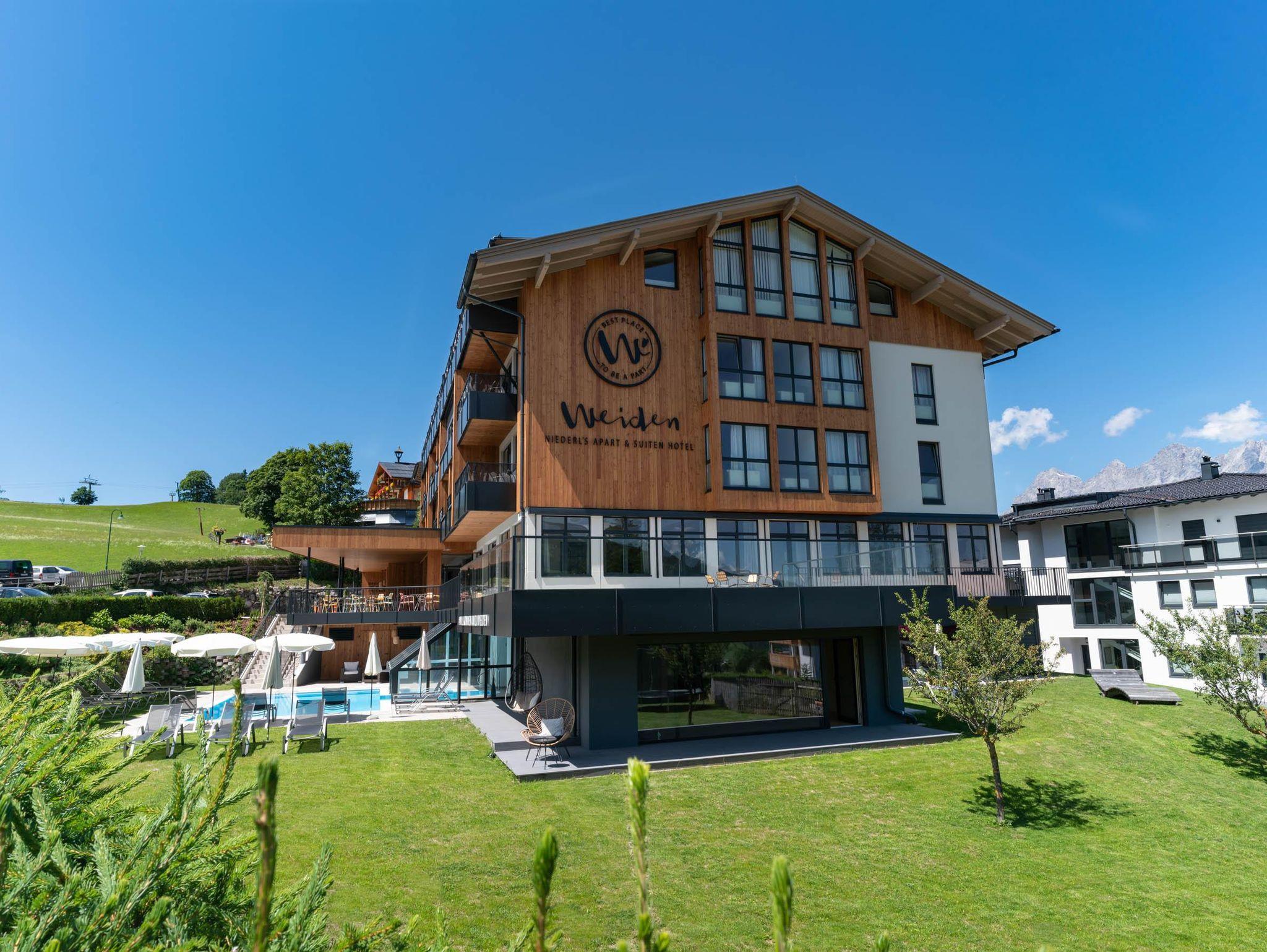 Das Hotel WEIDEN mit Wohnzimmerfeeling und innovativem Konzept hat erstklassige Lage am Hochplateau Rohrmoos oberhalb von Schladming. Im Skiurlaub direkt neben der Skipiste, im Sommerurlaub mitten in der Wanderregion Schladming Dachstein.