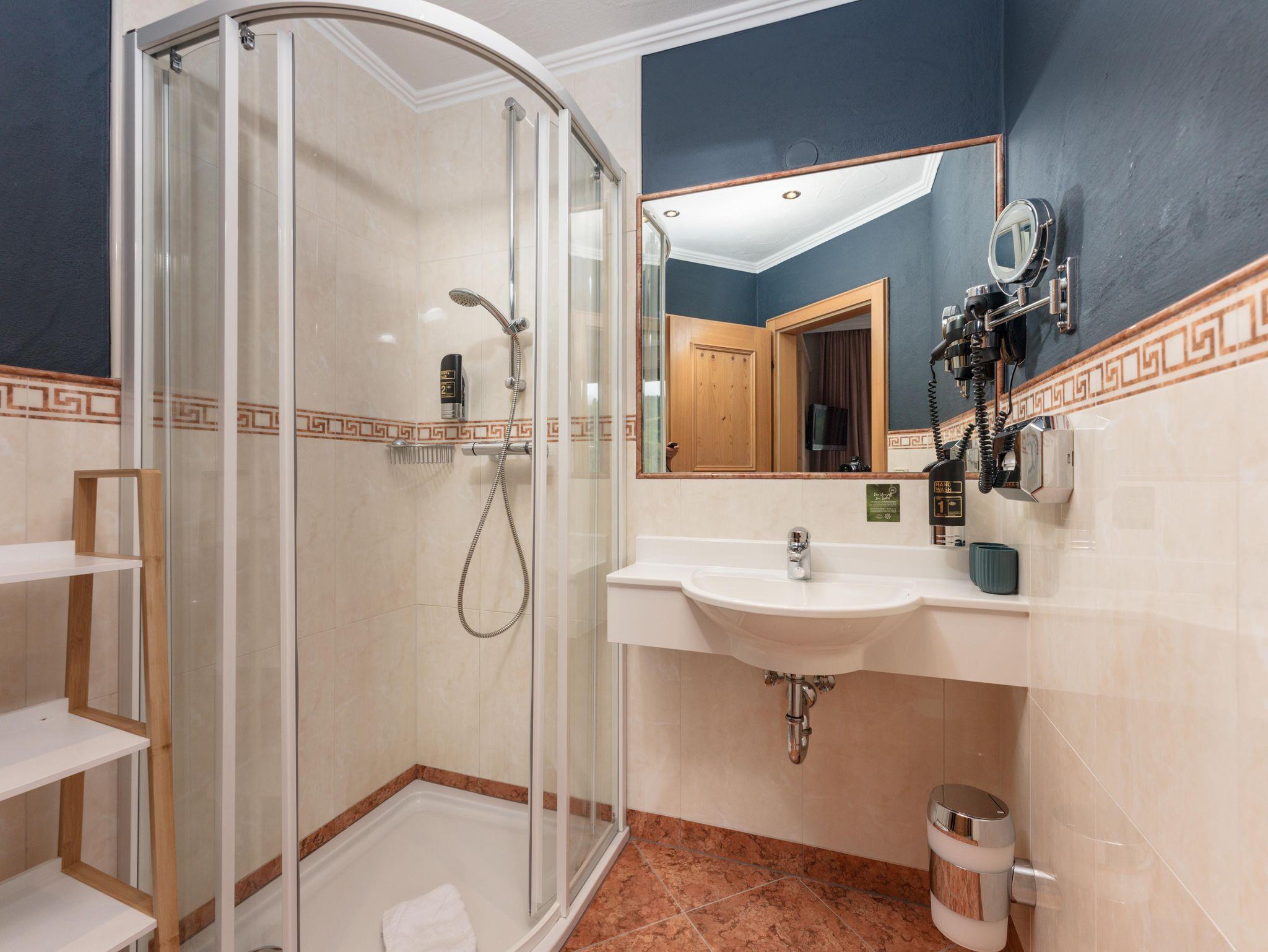 Badezimmer mit Dusche/WC, Haarföhn, Schminkspiegel & Handtuchtrockner