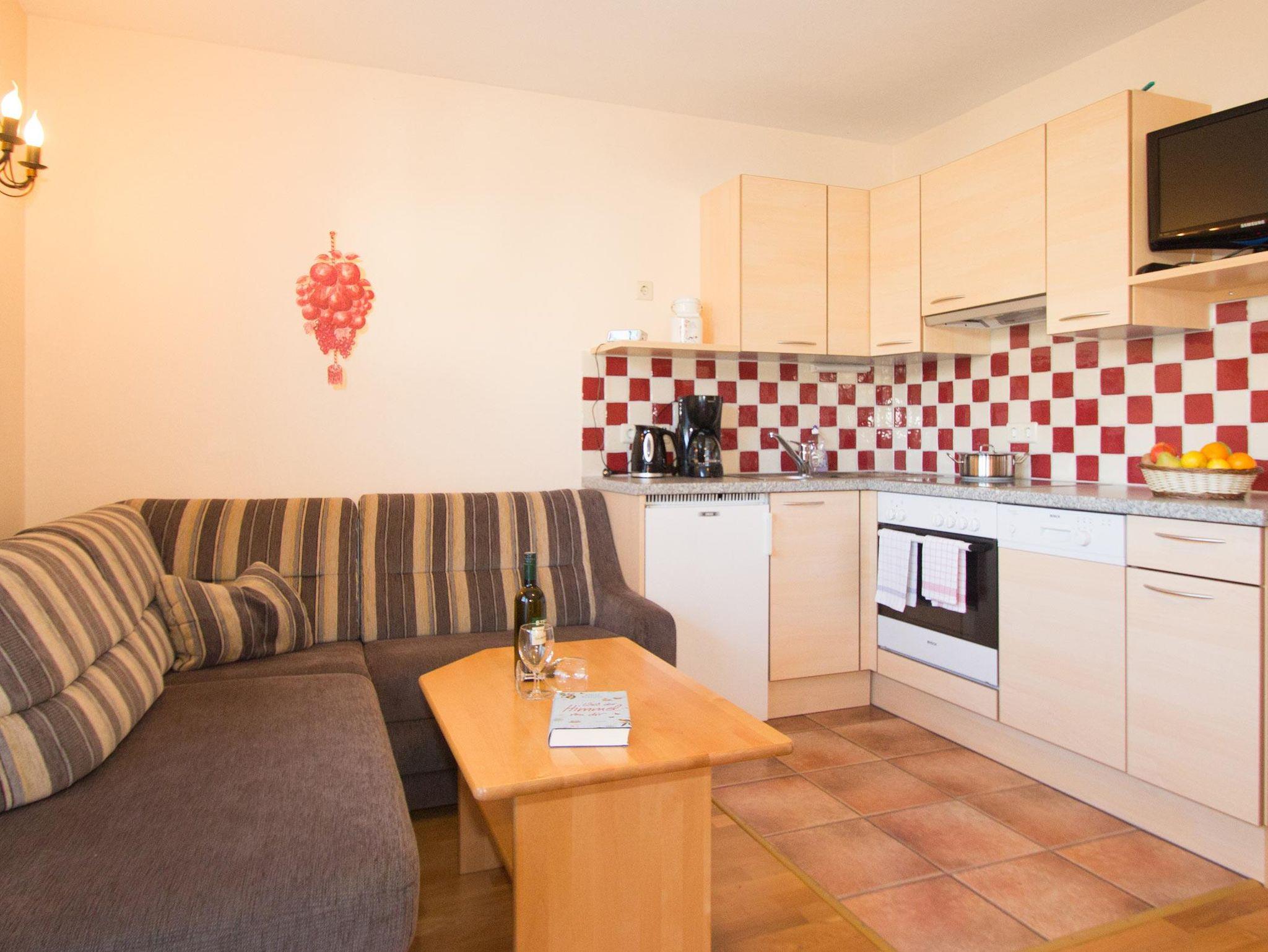 Die Feriewohnung Reiteralm ist im Erdgeschoß, eine Wohnküche mit Sofaecke.