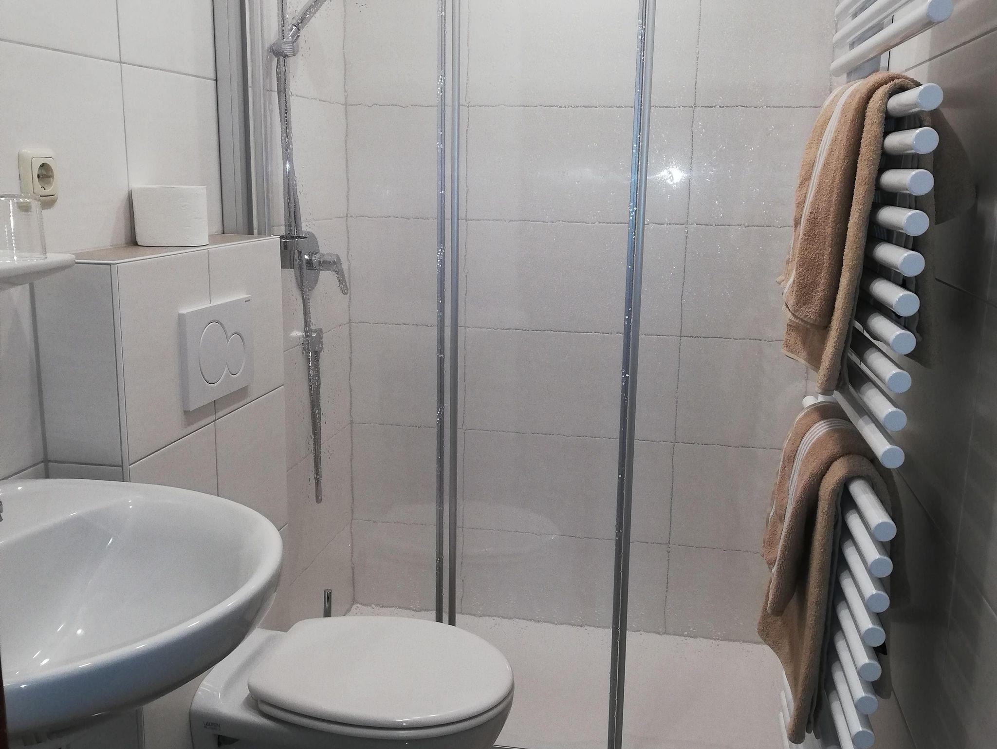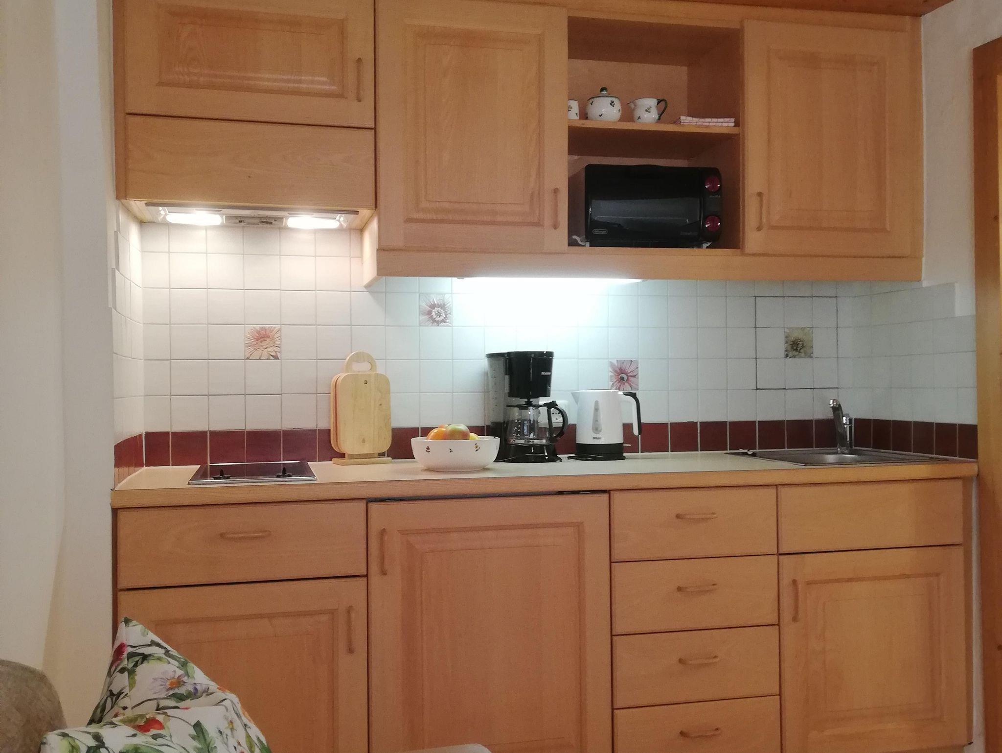 eine geräumige Ferienwohnung (ca. 45m²) mit Vorraum, Wohnküche komplett ausgestattet mit Kochnische, Eckbank und Sitzgruppe, 1 sep. Schlafzimmer, DU/Badewanne, sep. WC, südseitigem Balkon, Kabel-TV und gratis W-LAN.