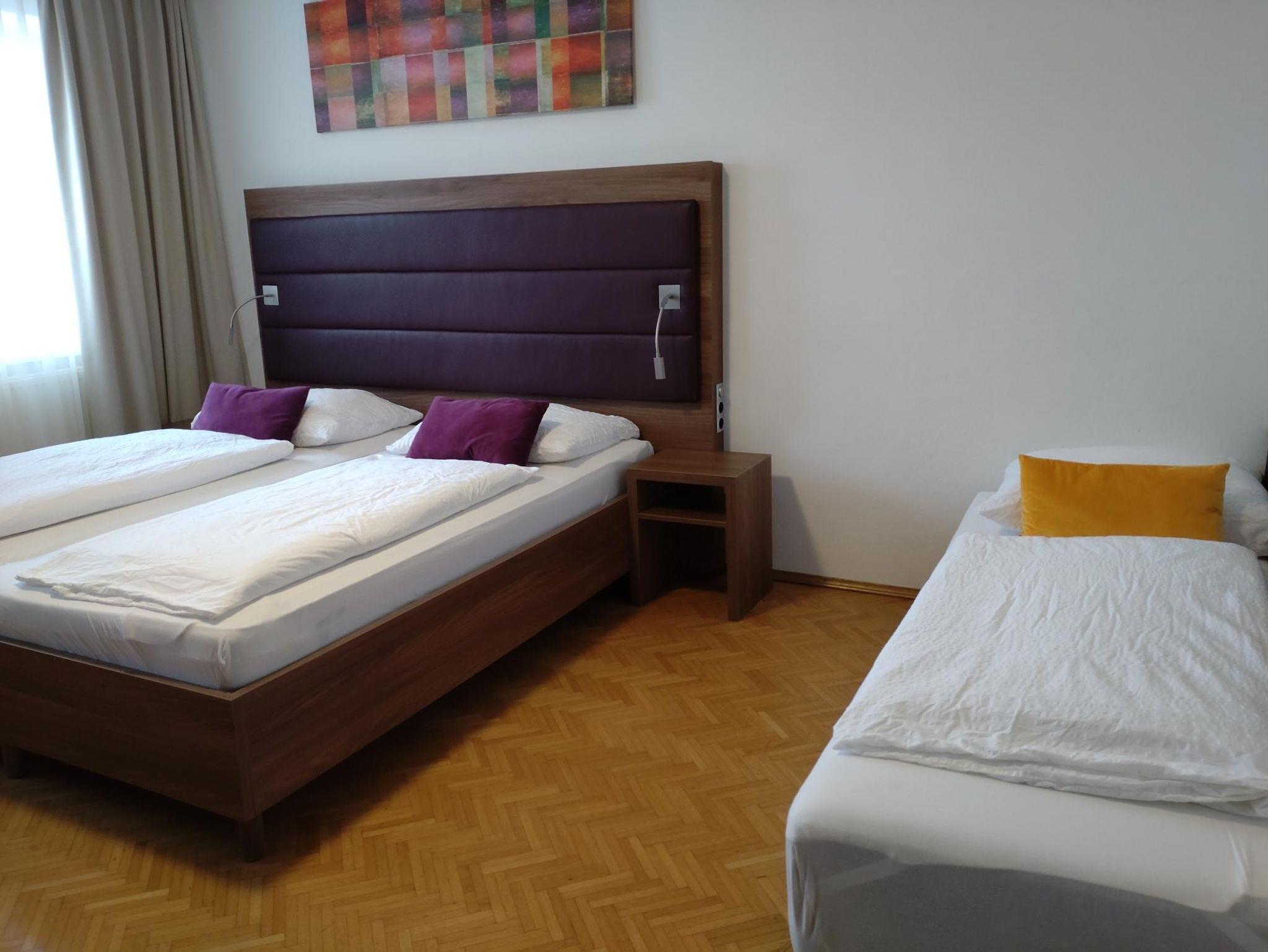 Dreibettzimmer mit Gemeinschaftsbad welches nur zwischen 2 Zimmern geteilt wird. Angenehm modern eingerichtet, Handtücher im Zimmer, Dusche und WC am Gang.
