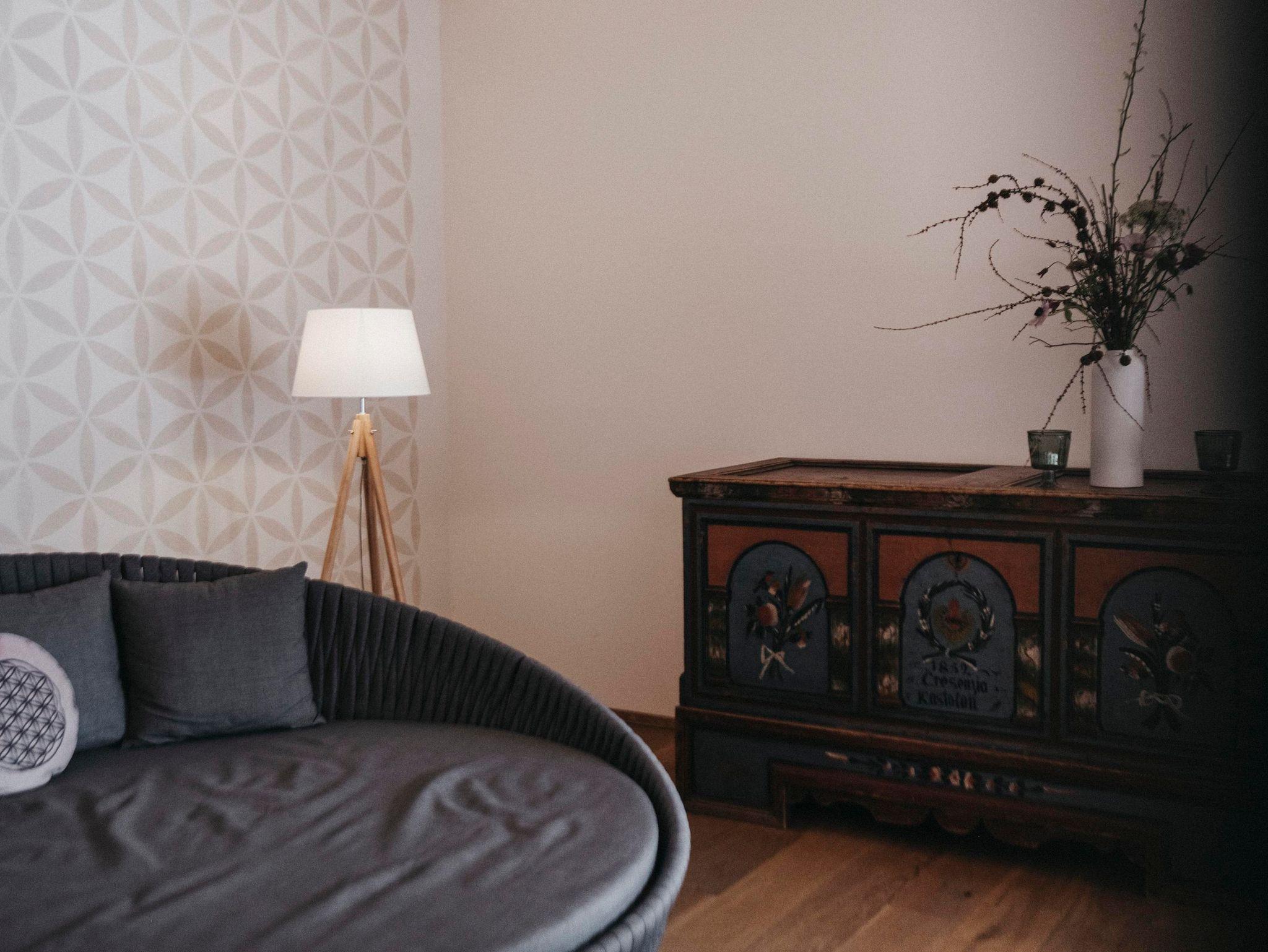 exklusive Ausstattung mit Holz aus dem 16. Jh., extra großes Doppelbett 210 x 200 cm, Schlaf- und Wohnbereich mit Kachelofen, Sitzecke und Diwan, Bad mit Dusche, Badewanne, Doppelwaschbecken, Handtuchtrockner, Haarfön, beleuchteter Schminkspiegel, getrenntes WC mit Bidet, SAT-TV, Radio-TV, Zimmersafe, Telefon, Möglichkeit zur Stromabschaltung im ganzen Zimmer (z.B. für einen besseren Schlaf), Naturholzboden, Balkon oder Terrasse (nicht behindertengerecht)