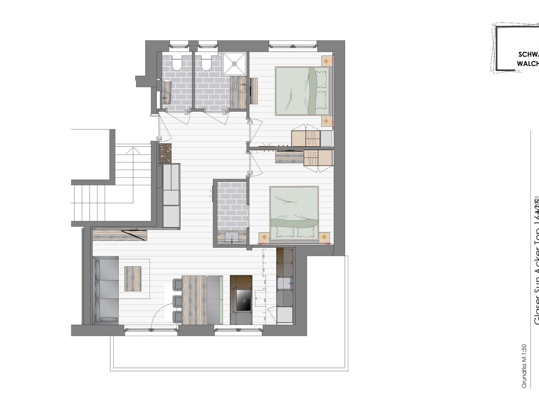 - 2 Schlafzimmer mit Doppelbett, 1 Schlafcouch im Wohnzimmerbereich