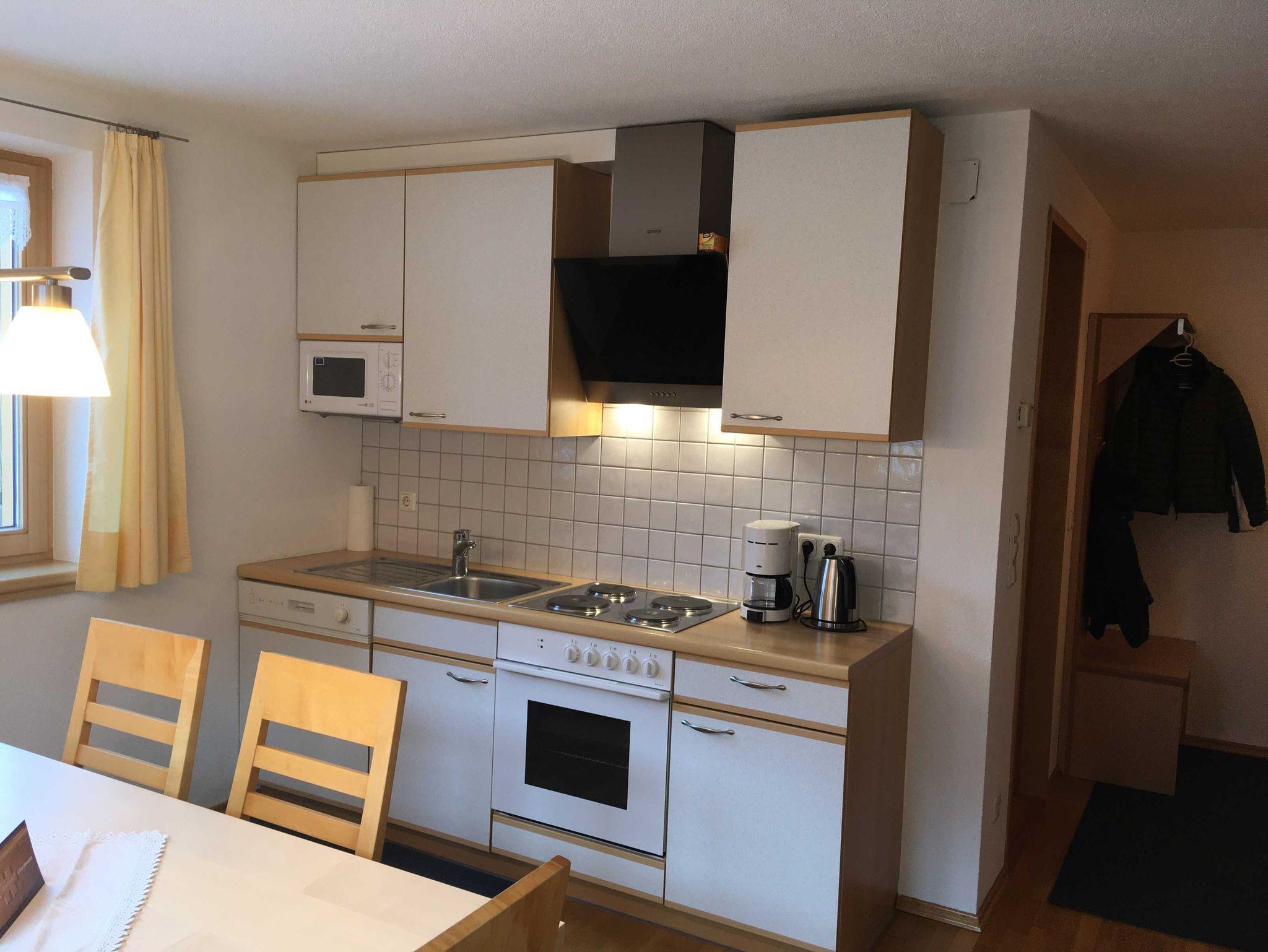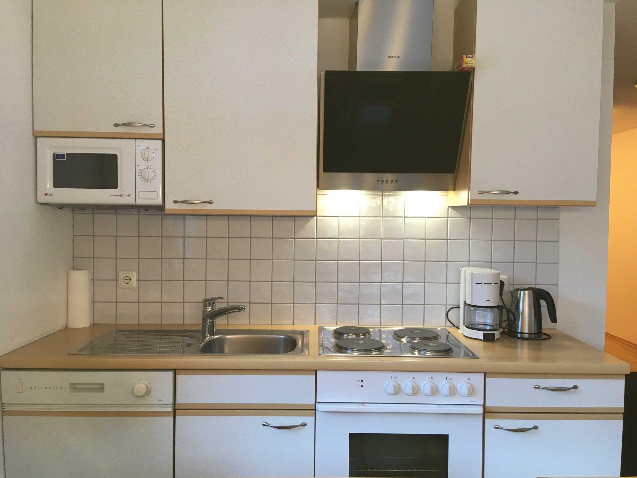 Einrichtung in der Küche: Herd mit Backrohr, Mikrowelle, Kühlschrank, Geschirrspülmaschine, Kaffeemaschine, Wasserkocher, Kochgeschirr, Essgeschirr, Besteck, ...