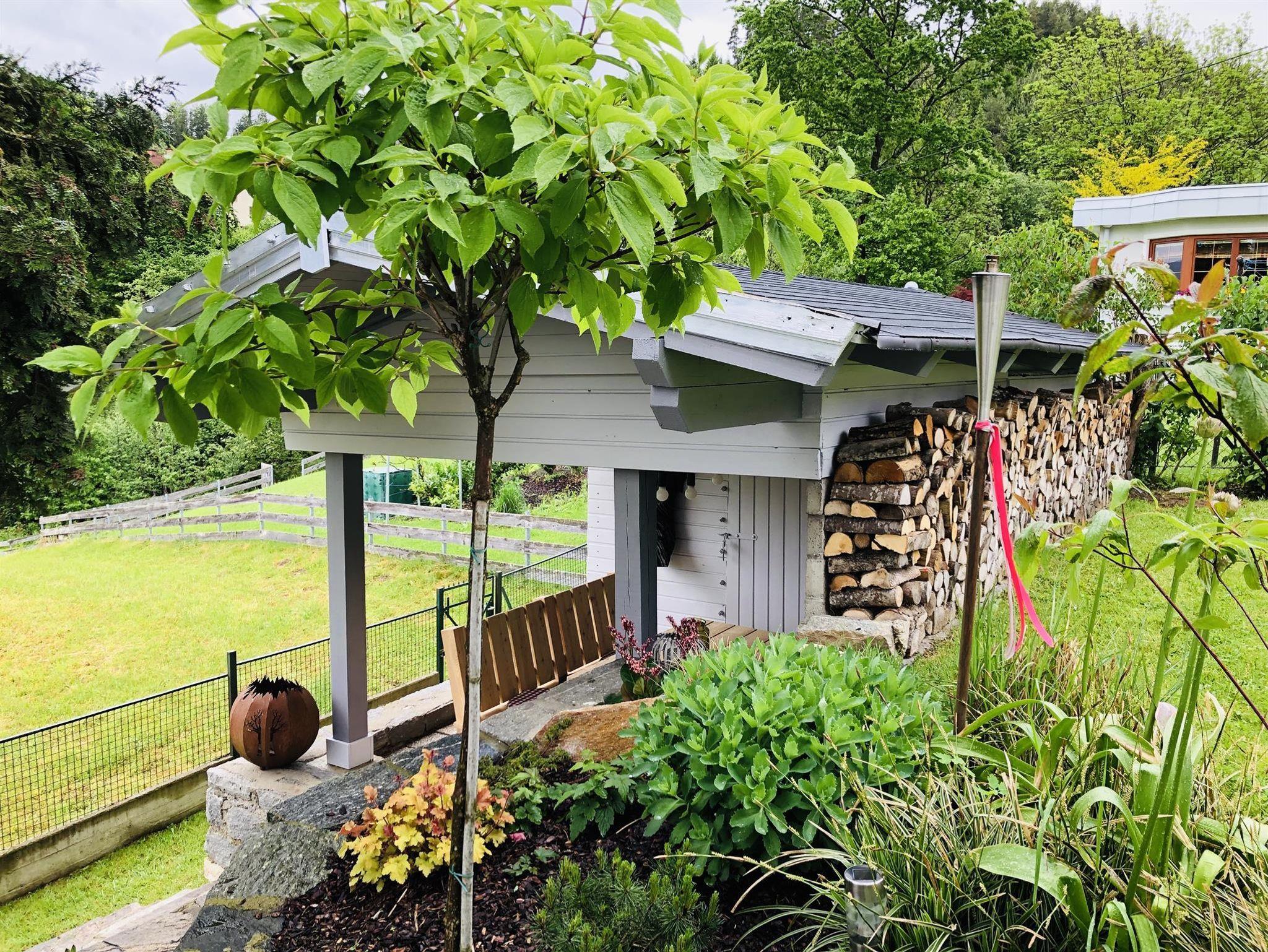 Weinlaube, überdachte Holzhütte, Terrasse möbliert mit Esstisch, Stühlen, Sonnenschirm und Markise; Sonnenliegen im Garten, Bäume als natürliche Schattenspender, komplett umzäunt; 1 abschließbare Garage und 2 kostenlose Autostellplätze im Freien