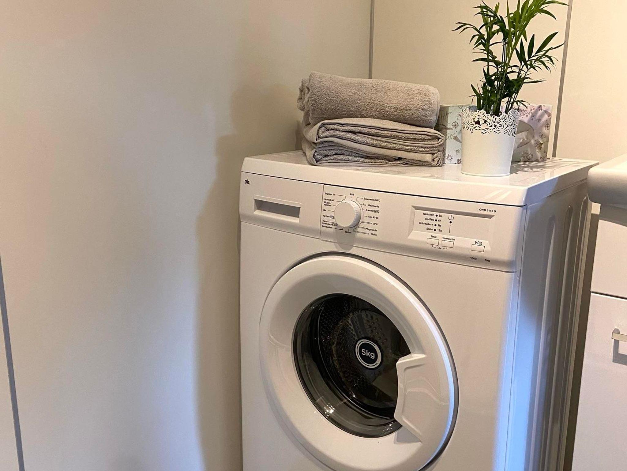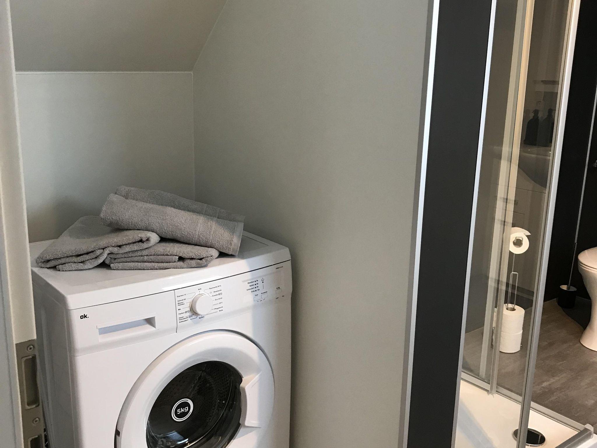 Bad: mit WC und Dusche, Handtücher, Badetücher, Waschmaschine, Wäscheständer