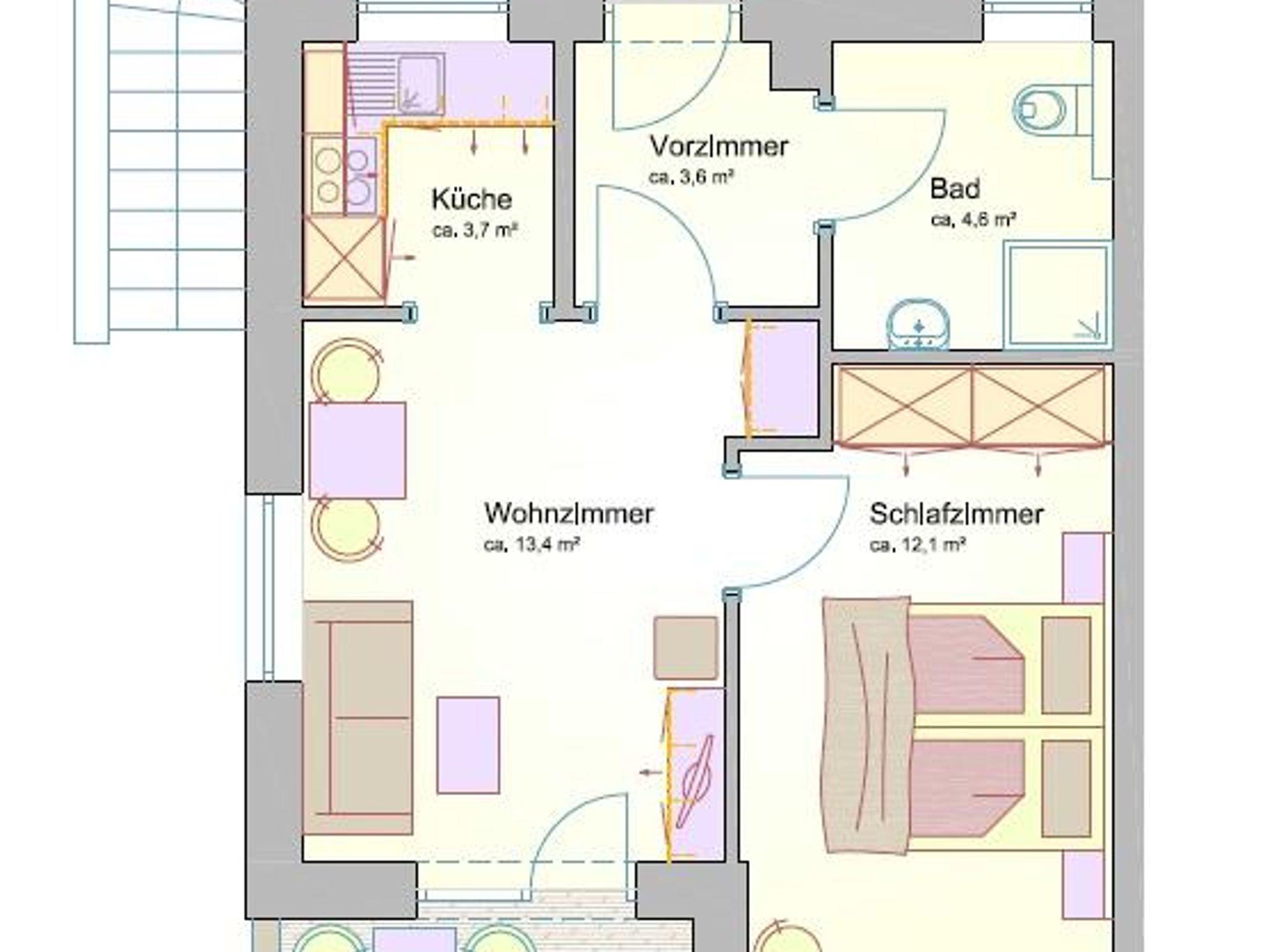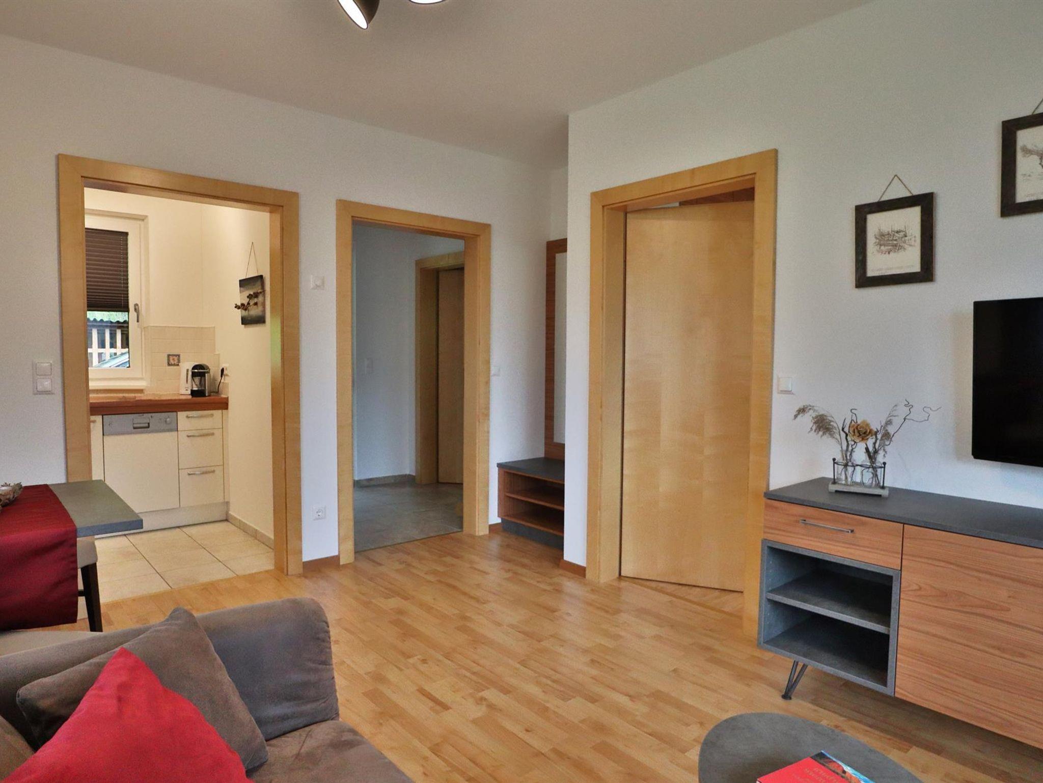 Die Ferienwohnung befindet sich im ersten Stock, ist aber vom Auto aus, barrierefrei zu erreichen. Der Balkon bietet einen herrlichen und ruhigen Blick über den See. Die Wohnung besteht aus 4 Räumen. Sie ist gemütlich und modern eingerichtet. Die Wohnung beinhaltet ein Wohnzimmer, ein Schlafzimmer, ein Vorzimmer, ein Bad mit integrierter Toilette und eine komplett eingerichtete Küche (mit Geschirrspüler, Kühlschrank, Mikrowelle, Kaffeemaschine, Elektroherd mit Backofen und Wasserkocher). Insgesamt misst die Wohnung ca. 41m².