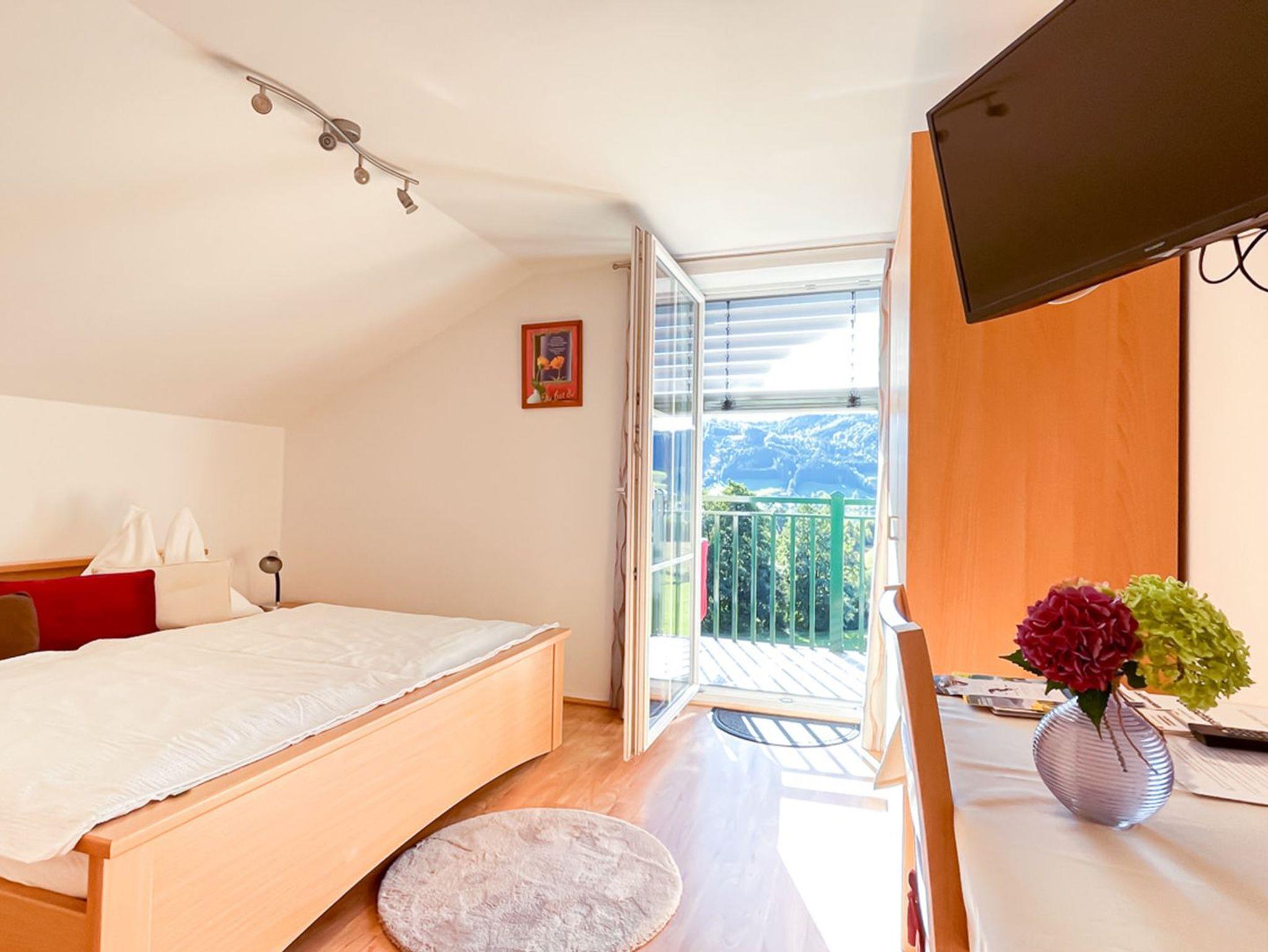 Die Doppelzimmer sind mit TV, Balkon und Dusche/WC ausgestattet. Sie genießen einen fantastischen Blick zum Irrsee.