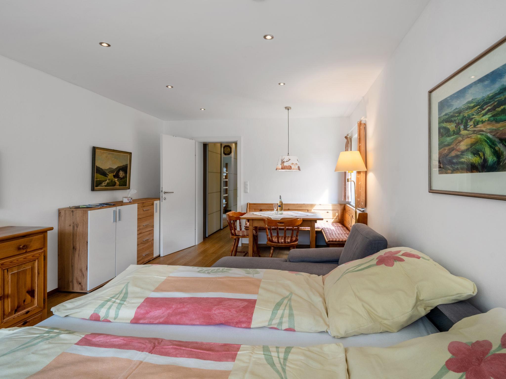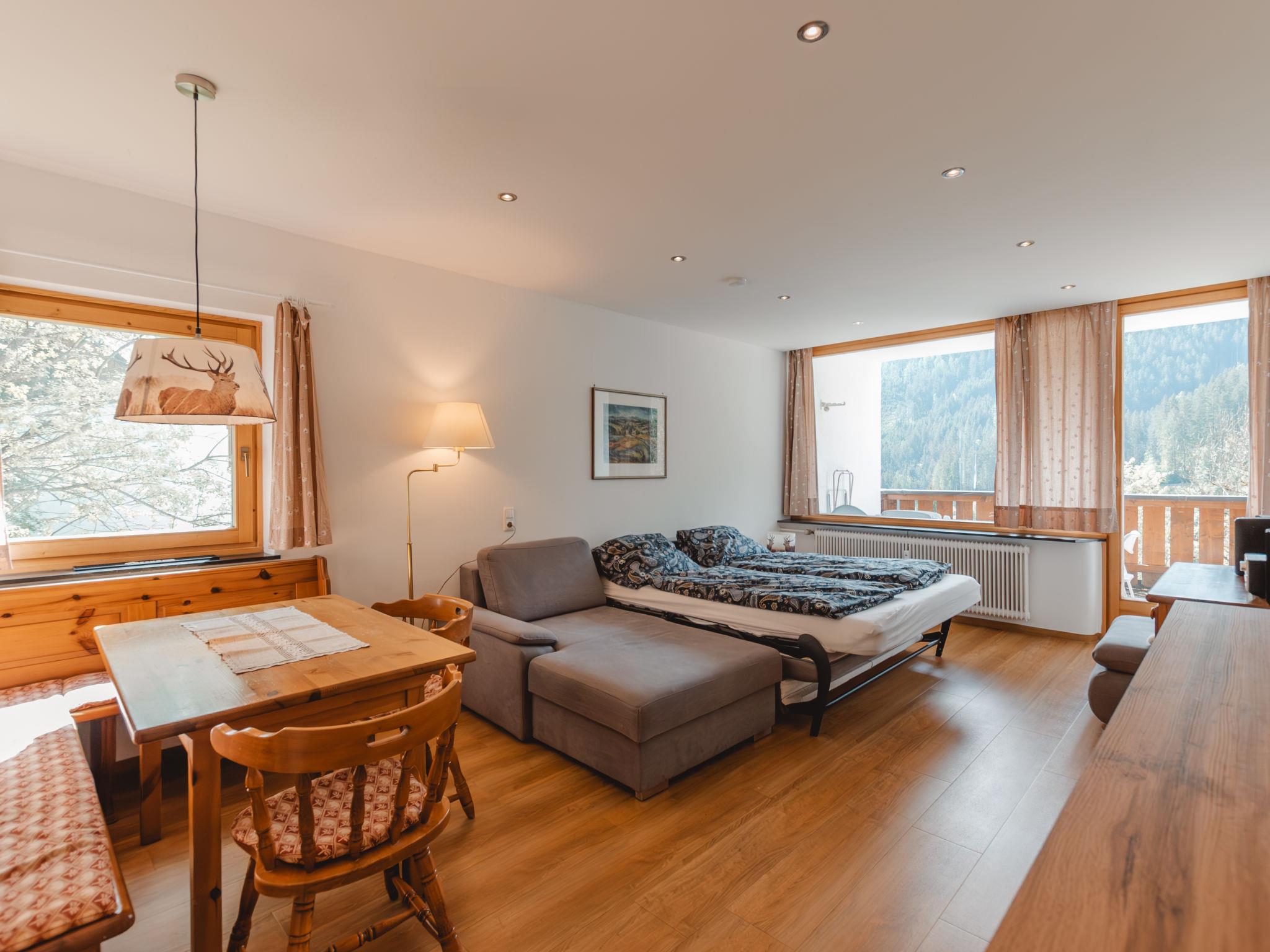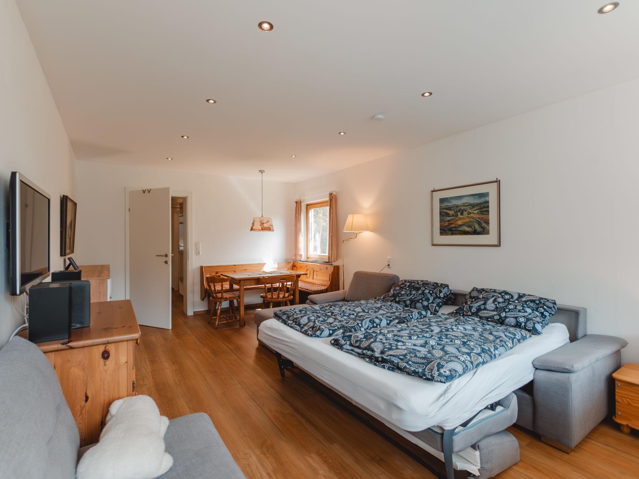 "Holger", 1-room apartment 40 m2 on 1st floor. Renovated in 2018, cosy furnishings: entrance hall. Living/sleeping room with 1 double sofabed (168 cm, length 195 cm), 1 x 2 bunk beds (140 cm, length 200 cm), satellite TV (flat screen). Exit to the balcony. Small kitchen (2 hot plates, oven, toaster, microwave, grill, electric coffee machine) with dining nook. Shower/WC. Gas heating. Terrace 10 m2, south facing position. Beautiful panoramic view of the mountains, the valley and the ski run. Facilities: Internet (WiFi, free). Parking, garage at the house. Please note: suitable for families. Non-smokers only. Smoke alarm, fire extinguisher. Partially covered south-facing terrace. The apartment is at the end of the corridor, so it is in a quiet location. The ski slope is about 50 meters from the house, therefore very relaxing for ski-in/ski-out guests. The shower door cannot be opened completely because of the washing machine. 50628-001136-2020