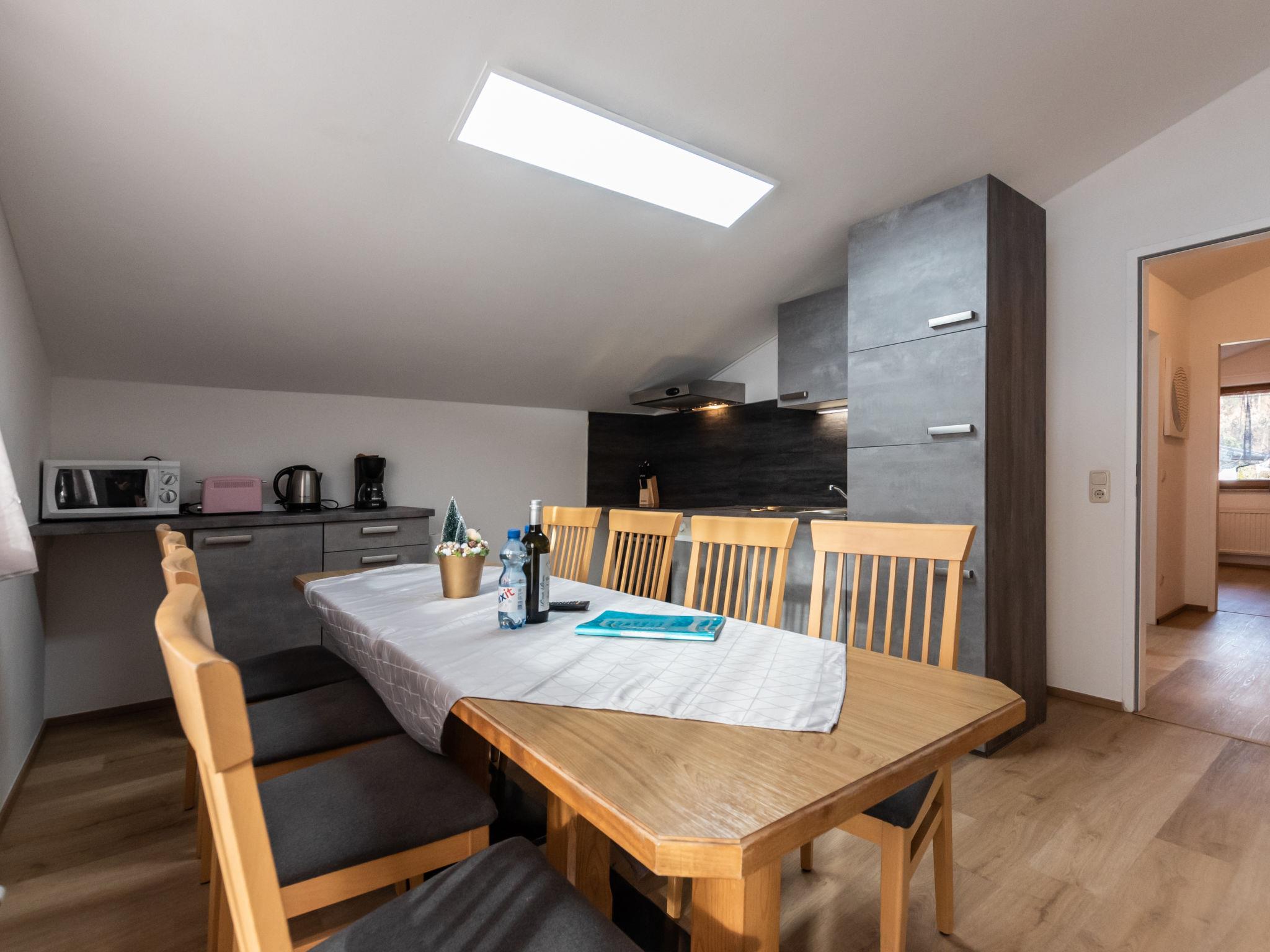 "Alpenchalets", 5-room apartment 100 m2 on 1st floor. Renovated in 2019, cosy furnishings: 1 room with sloping ceilings with 1 double bed (160 cm). Exit to the balcony. 3 rooms with sloping ceilings, each room with 1 double bed (160 cm). Kitchen-/living room (oven, dishwasher, 4 ceramic glass hob hotplates, toaster, kettle, microwave, electric coffee machine) with dining nook. Exit to the balcony. 2 showers/WC. Electric heating. Parquet floors. Balcony. Balcony furniture. Facilities: children's high chair, baby cot. Internet (WiFi, free). Parking (2 cars). 1 pet/ dog allowed. 50628-001024-2020
