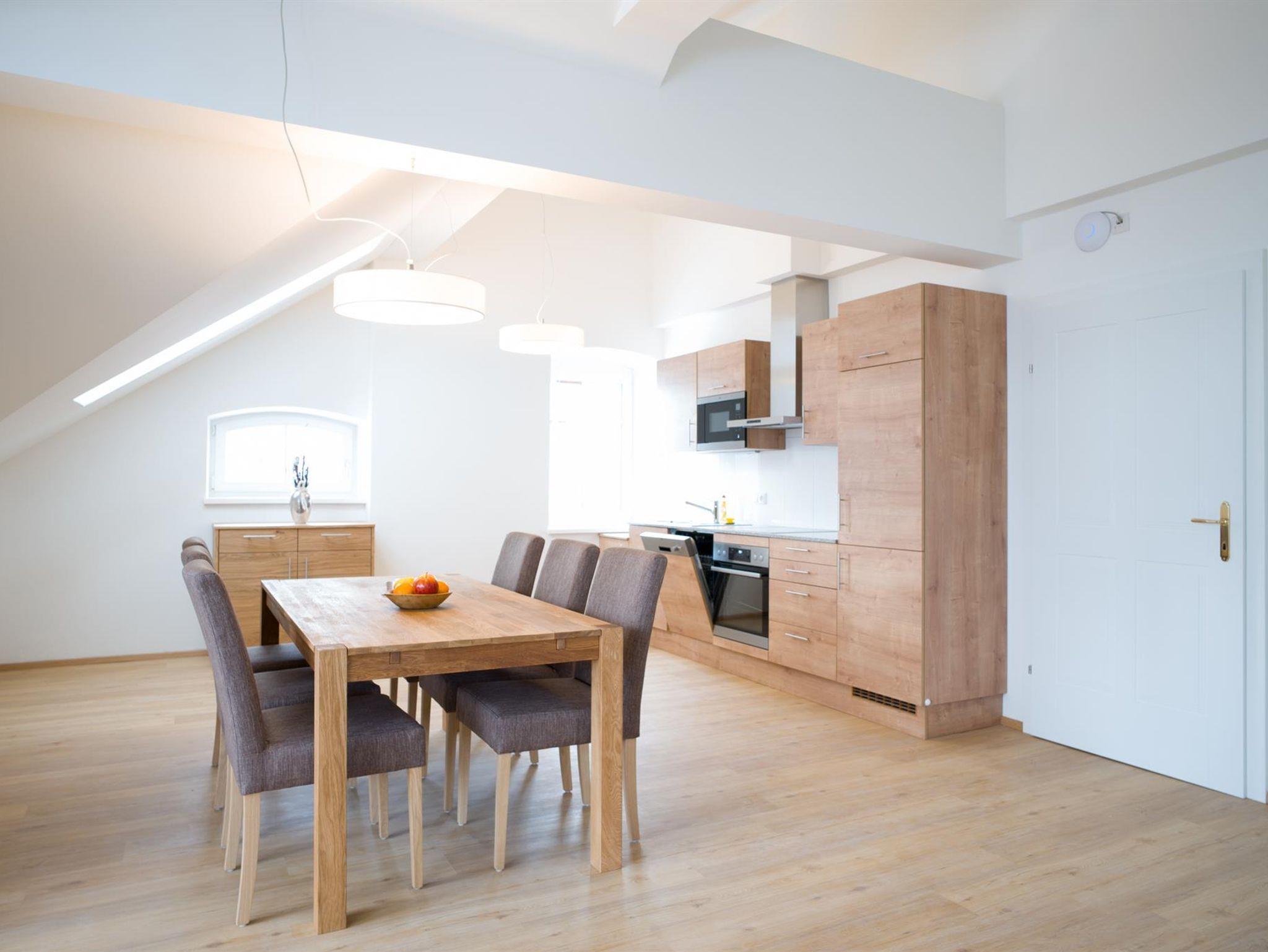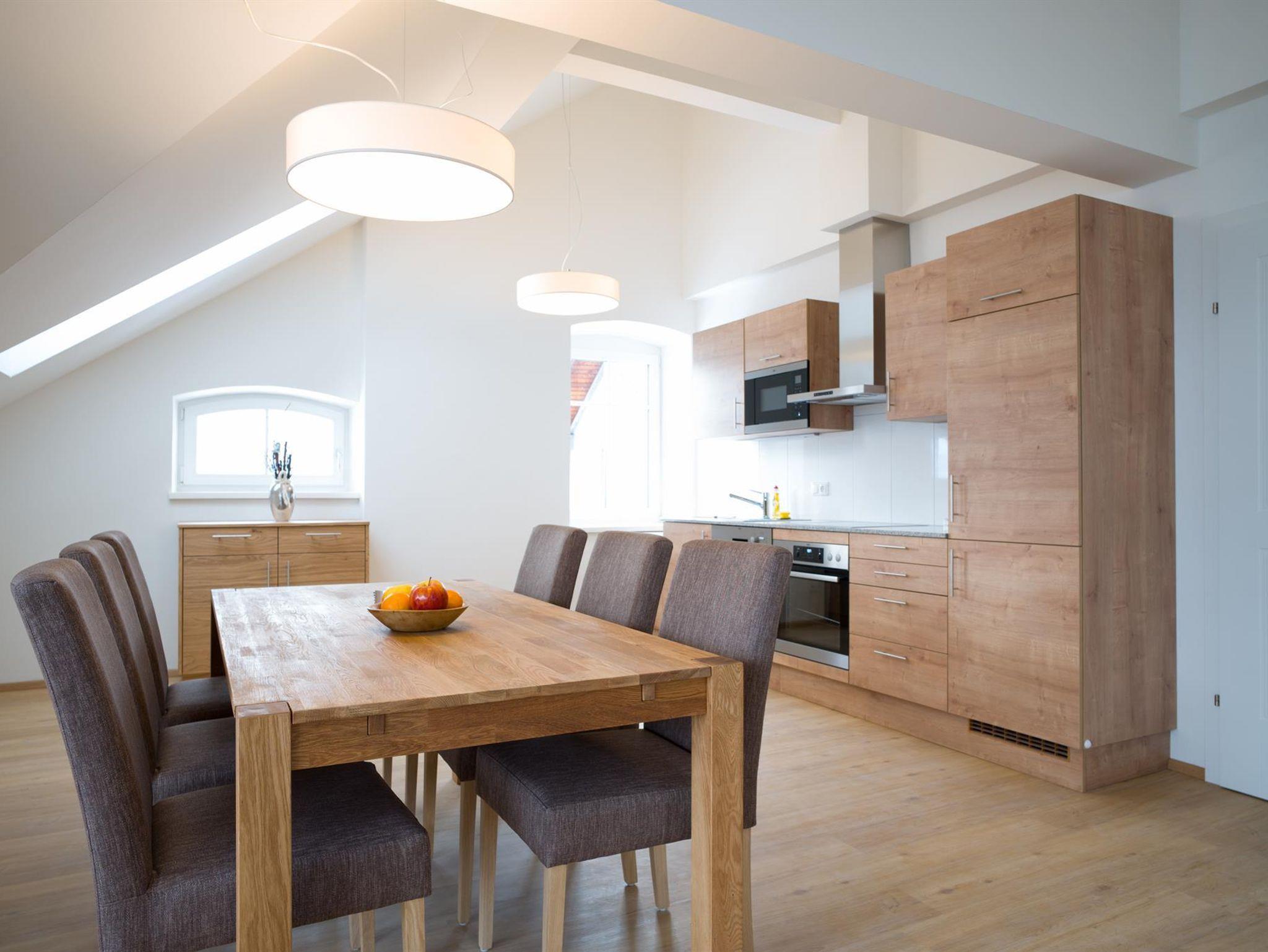 • Offene, voll ausgestattete Küche (u. a. Backofen, Geschirrspüler, Kaffeemaschine)