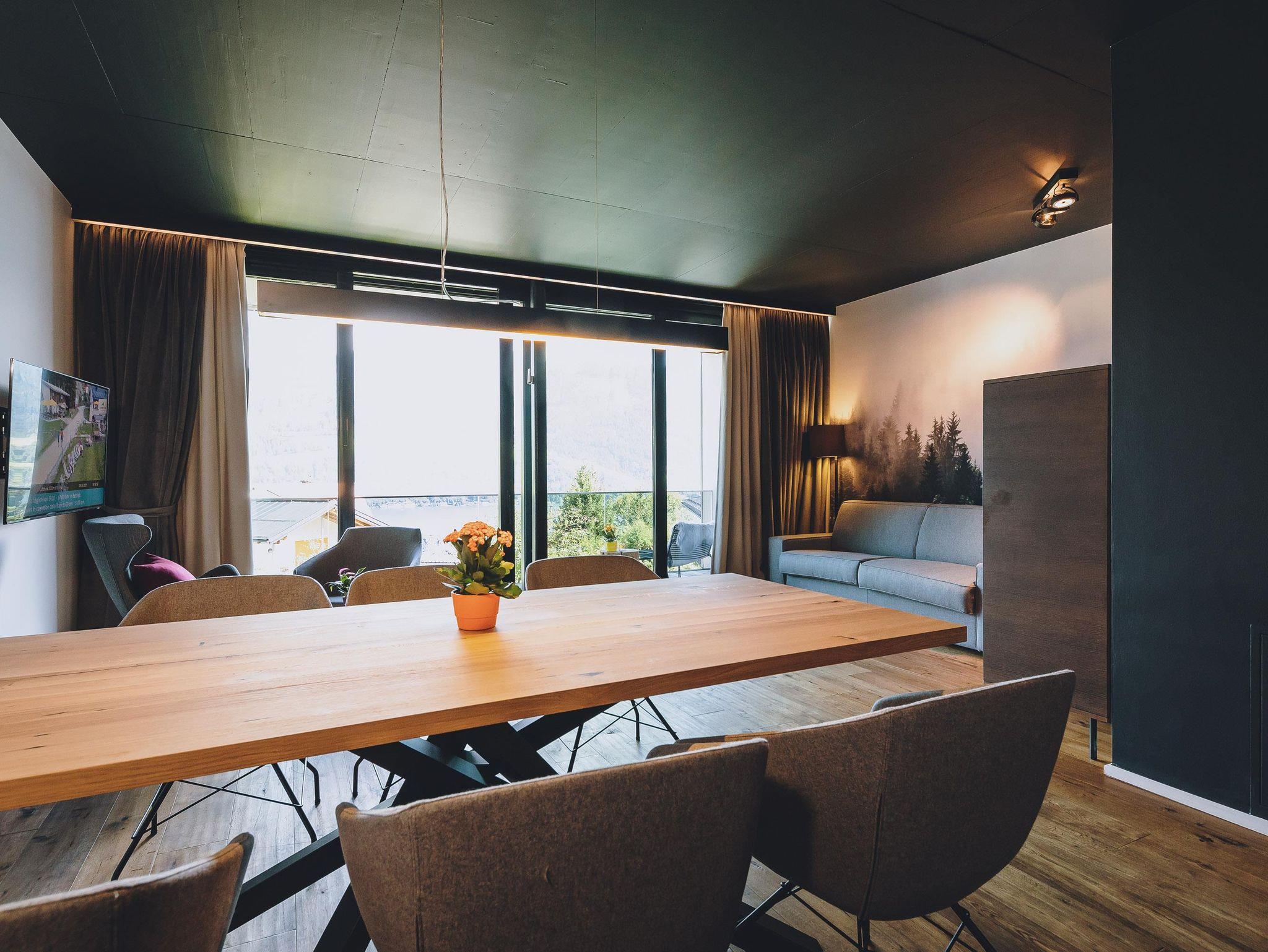 Im oberen Stockwerk befindet sich das großzügige Wohnzimmer mit Esstisch für bis zu 6 Personen.