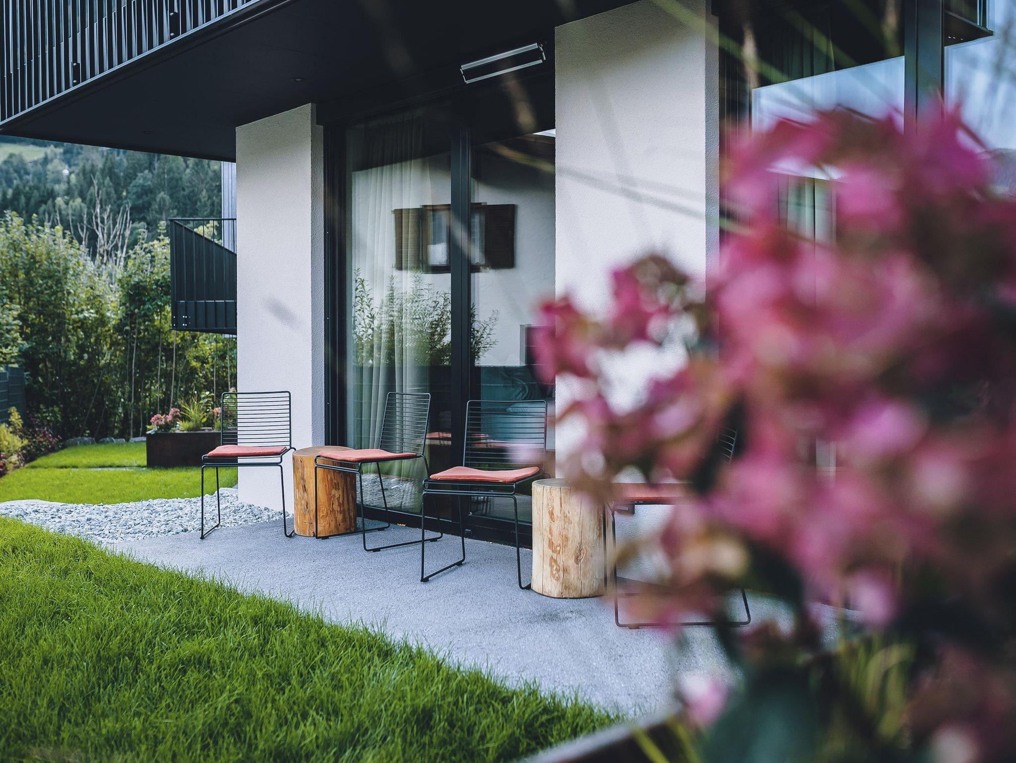 • Balkon mit Sitzmöbeln und Blick auf die umliegende Bergwelt